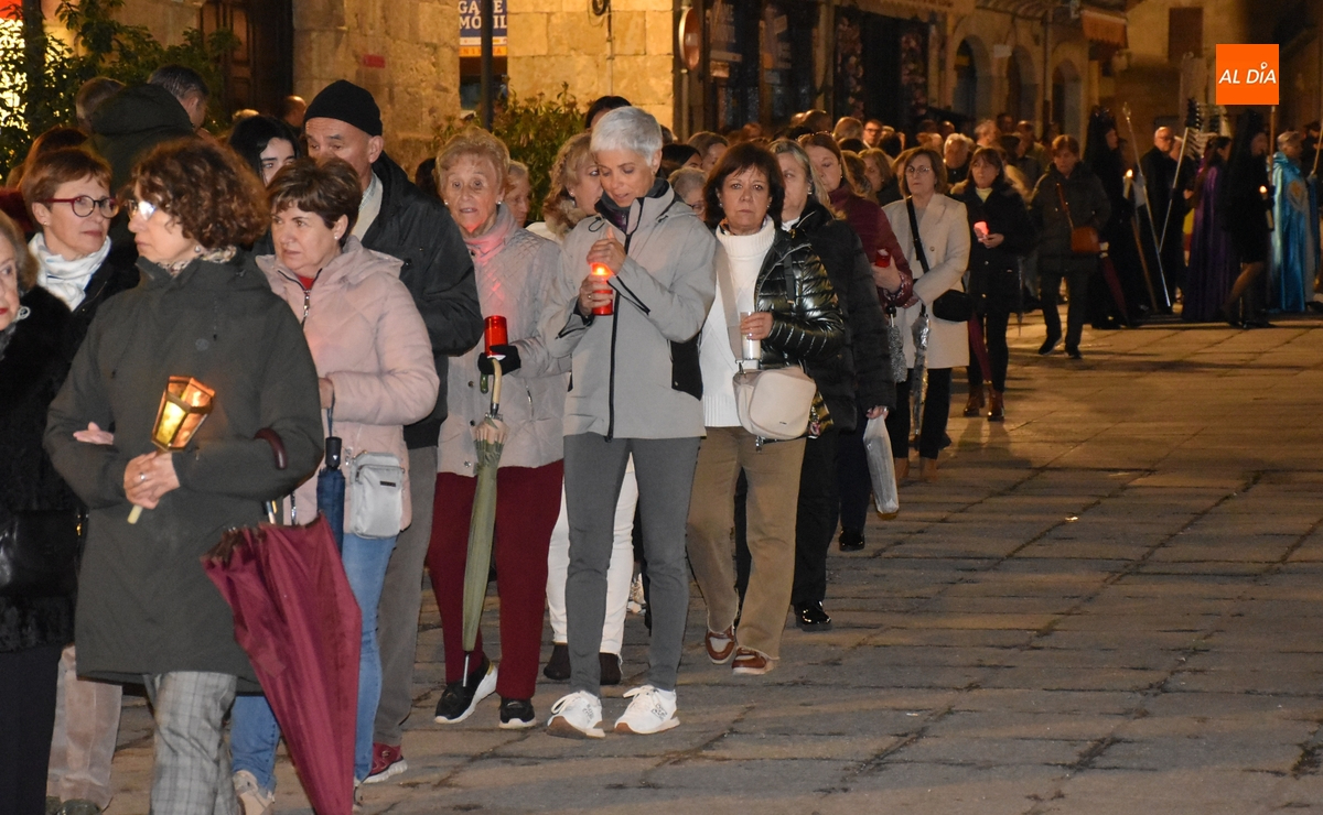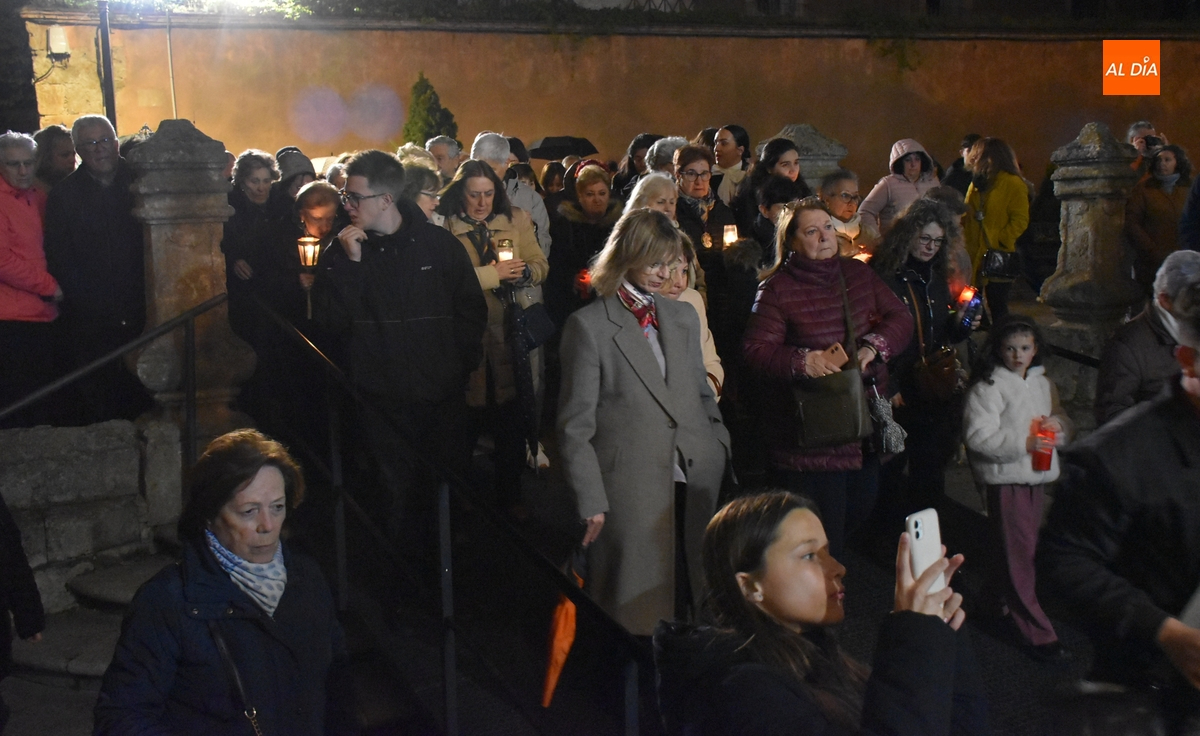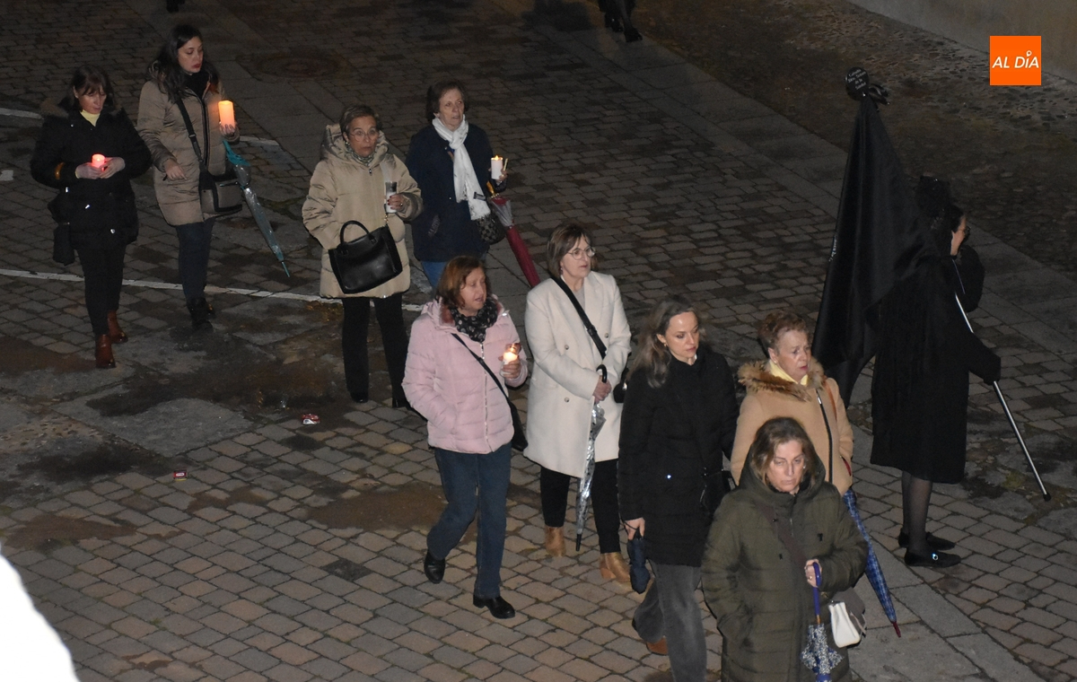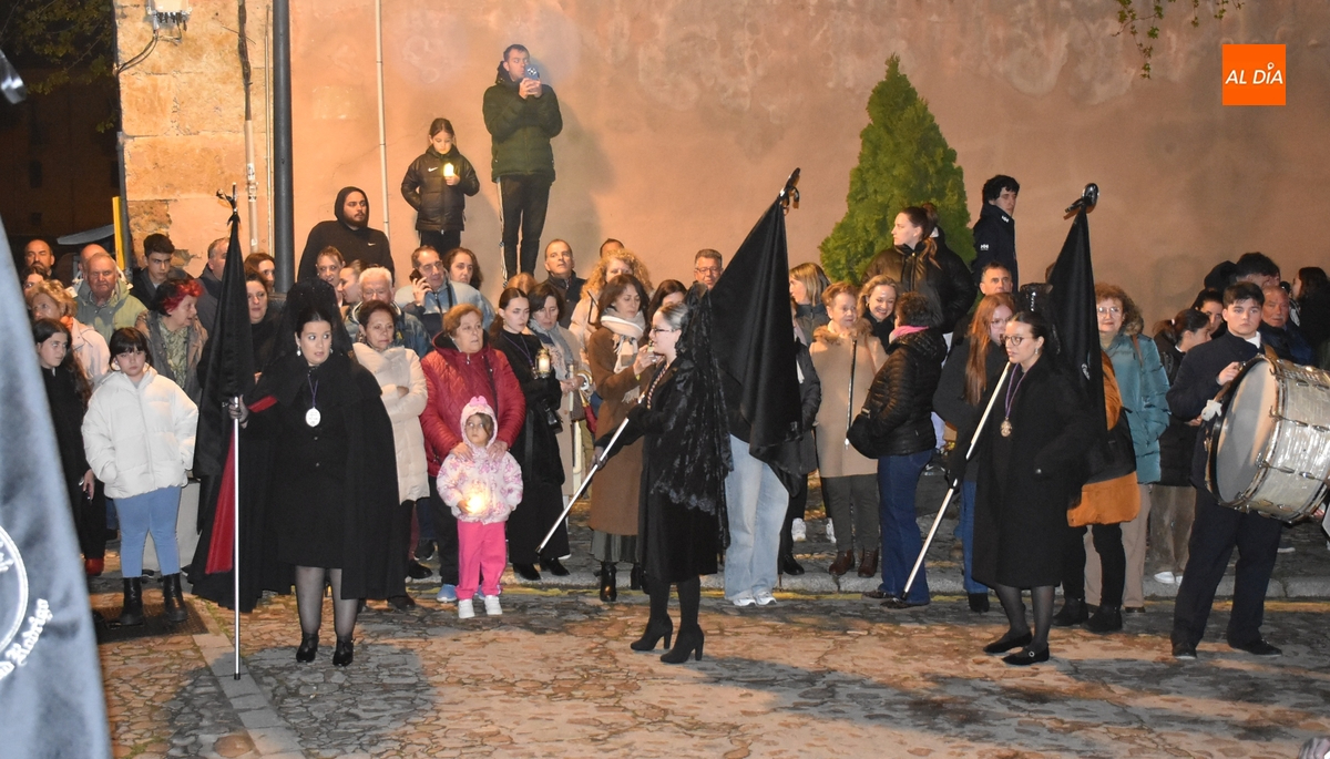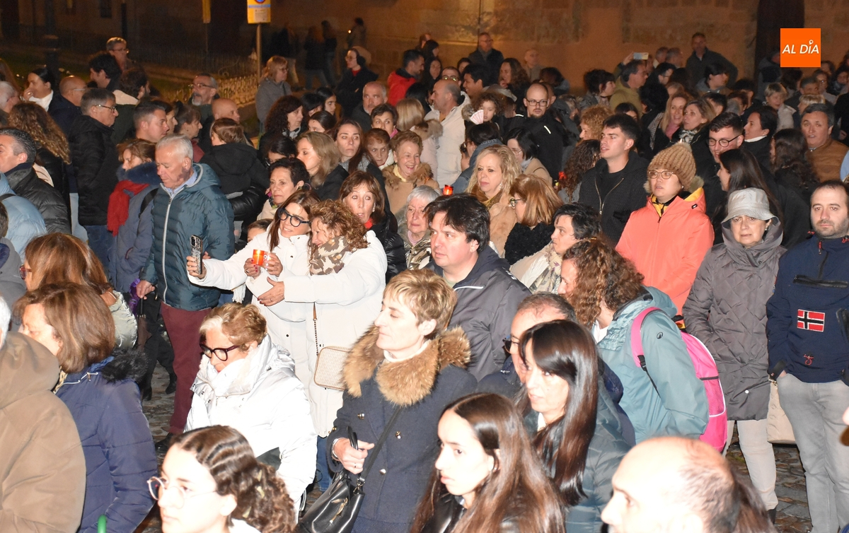 Al salir en esta dirección (y no estar el público tan repartido), se pudo apreciar de lleno la espectacular cantidad de gente que había congregada a las puertas de la Catedral para seguir el arranque de La Soledad, que contó con la compañía de unas 25 cofrades con mantilla, que fueron detrás de las banderas de luto de la Cofradía, conformando dos filas dentro de las cuales fue la imagen de la Virgen. Por fuera de estas dos filas desfilaron todos todos los fieles que decidieron sumarse a la procesión, muchos de ellos con velas.