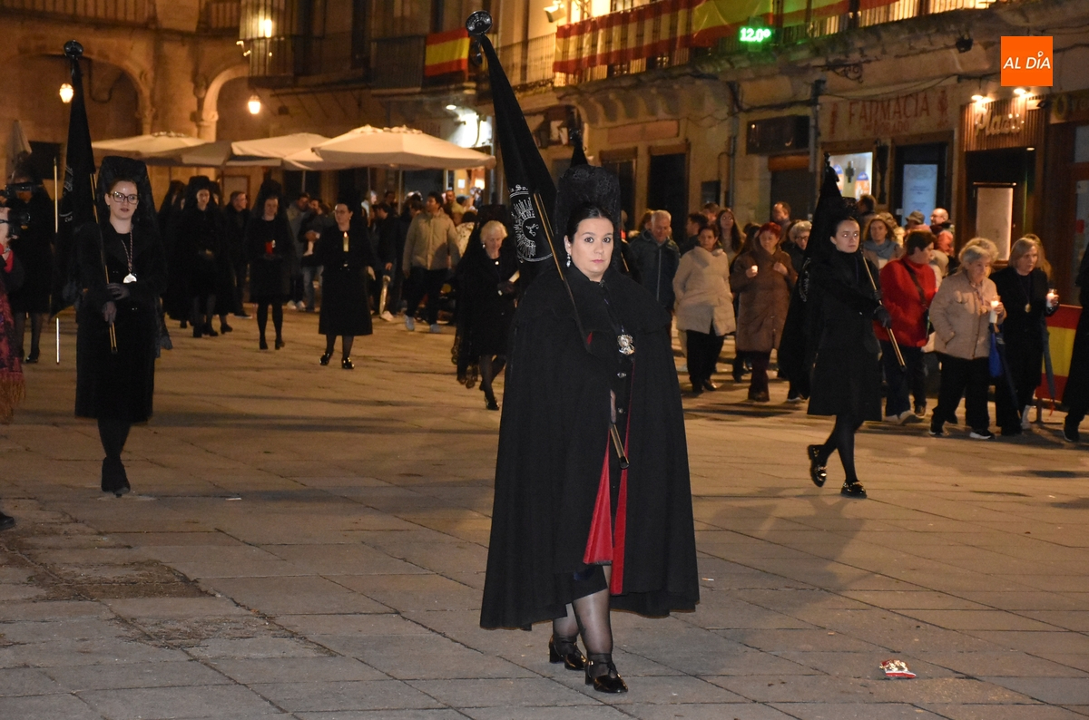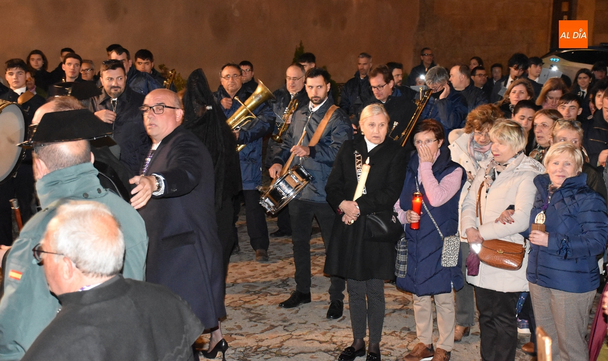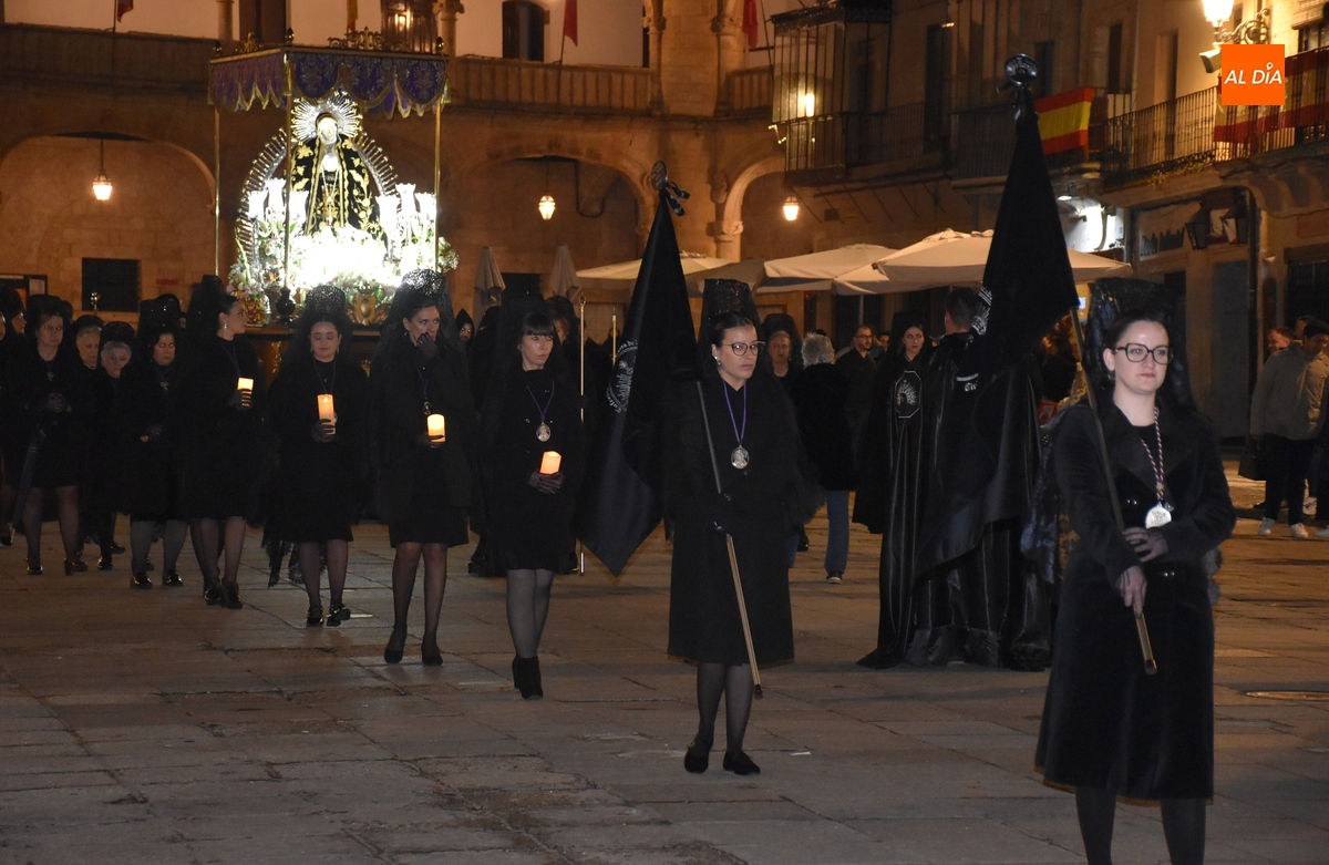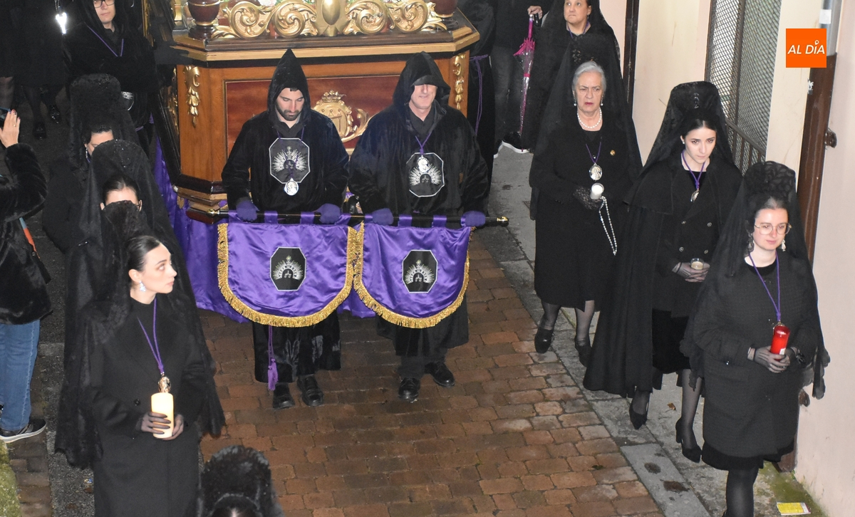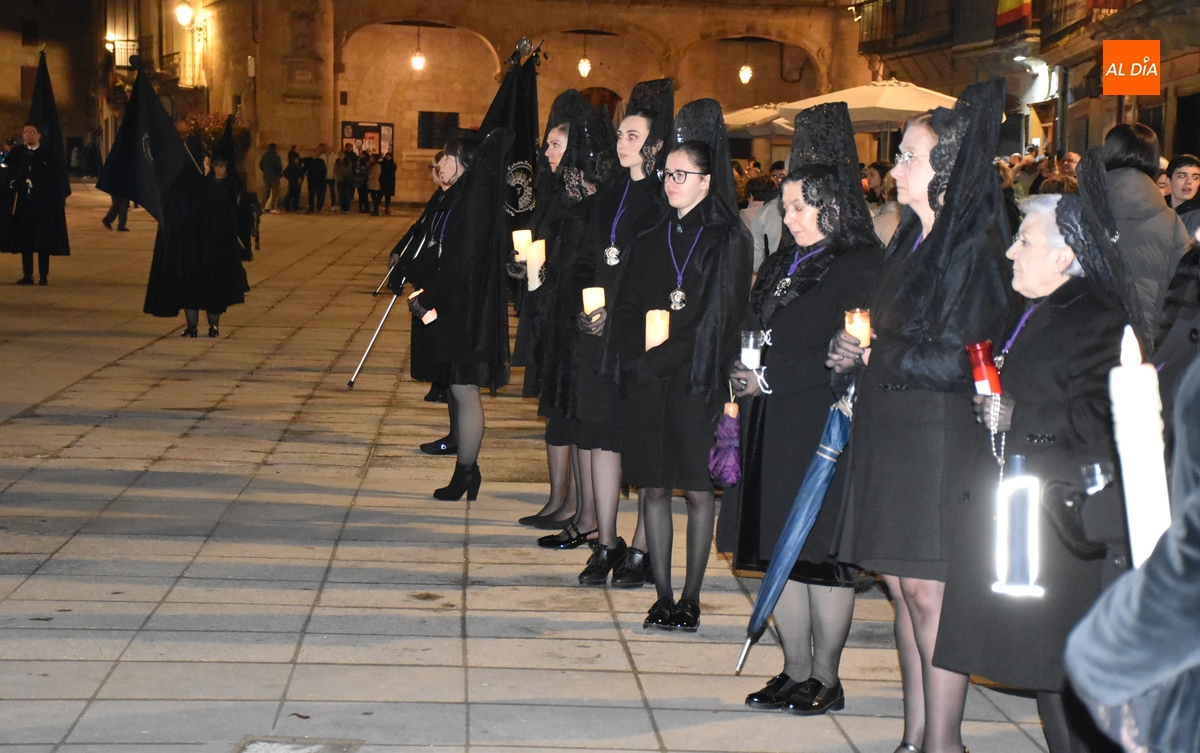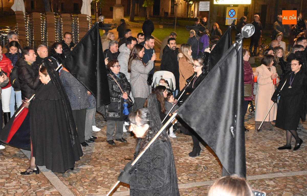 Después de que La Carrera se completase de forma exitosa (durante toda la semana pocos confiaban en ello), quedaba rematar el Viernes Santo con la procesión de La Soledad, pero el cielo empezó a dar guerra a las 21.07 horas, con un notable chaparrón, continuando la caída de agua durante un buen rato, lo que puso en jaque ese desfile final del día, que tenía como siempre un prólogo en forma de rezo del Santo Rosario y de reflexión a cargo del capellán de la Cofradía, Ángel Martín Carballo.
