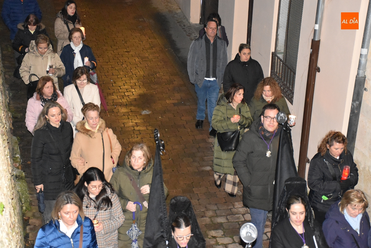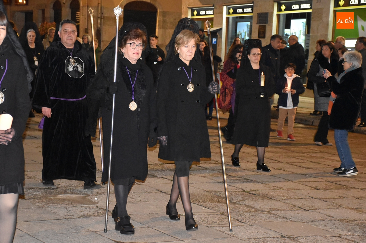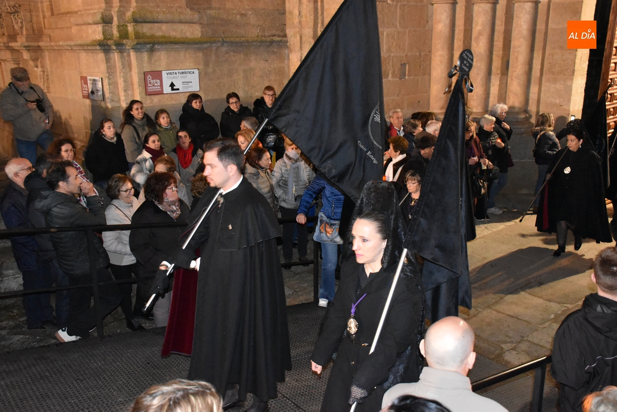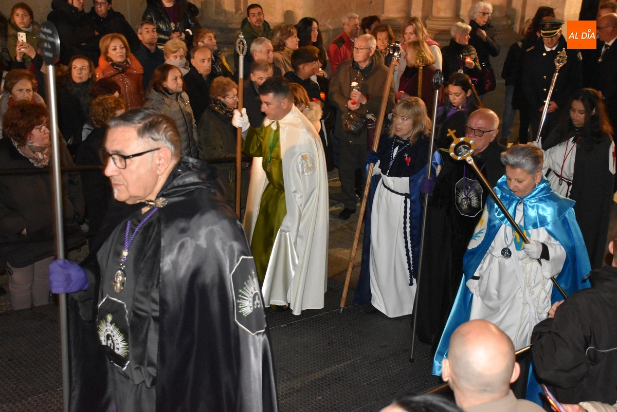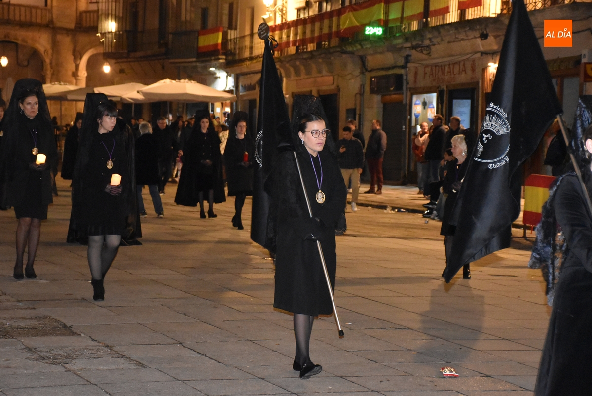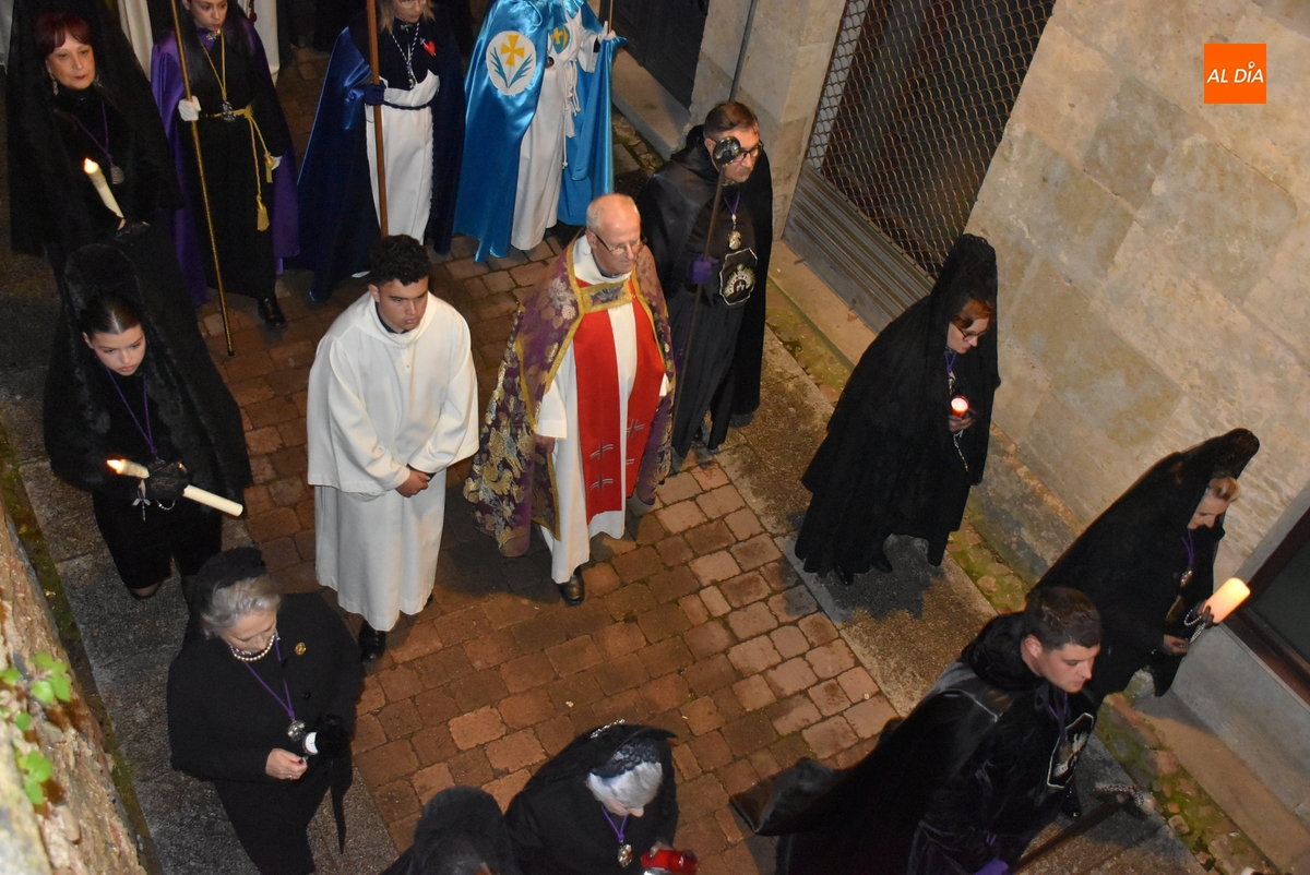 Después de que La Carrera se completase de forma exitosa (durante toda la semana pocos confiaban en ello), quedaba rematar el Viernes Santo con la procesión de La Soledad, pero el cielo empezó a dar guerra a las 21.07 horas, con un notable chaparrón, continuando la caída de agua durante un buen rato, lo que puso en jaque ese desfile final del día, que tenía como siempre un prólogo en forma de rezo del Santo Rosario y de reflexión a cargo del capellán de la Cofradía, Ángel Martín Carballo.