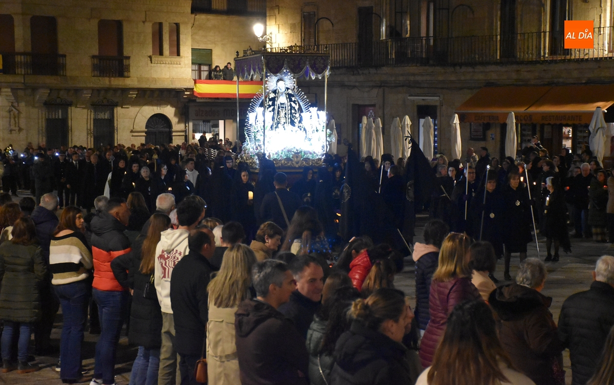 Al alcanzar la Plaza Mayor, la imagen de La Soledad fue dada la vuelta para sorpresa de la mayoría de los presentes, con el objetivo de que los participantes en la procesión tuviesen la oportunidad de contemplarla de frente mientras iban avanzando por el ágora. Sin embargo, esto no se llegó a explicar, con lo cual la situación fue un poco extraña, ya que precisamente los fieles se quedaron parados pensando que la procesión se iba a dar ya la vuelta hacia la Seo (como más o menos ocurrió el año pasado).