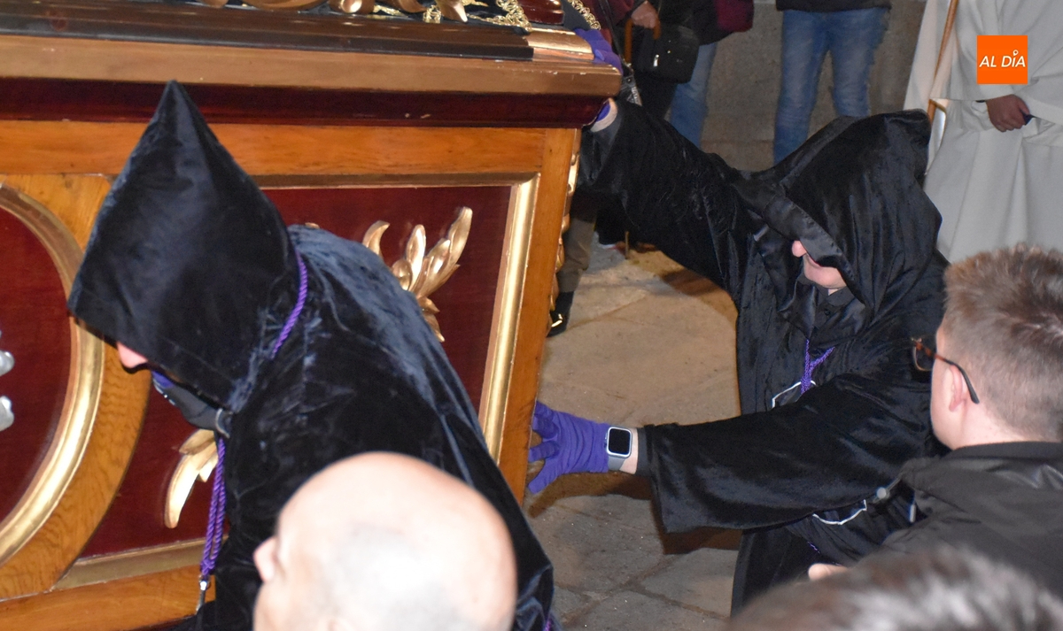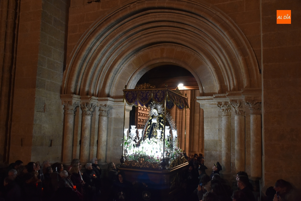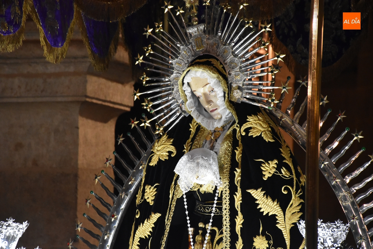 Según lo previsto, La Soledad debía haber salido del ágora de forma inmediata por Julián Sánchez, pero bajó hasta Cardenal Pacheco para encaminarse hacia la Catedral. En este tránsito por Cardenal Pacheco, se puso a llover, lo que hizo que se abriesen paraguas entre el público y que se acelerase el final, siendo introducida lo más rápido posible –la maniobra de bajada con la carroza tiene su dificultad- la imagen de La Soledad en la Seo, tras 45 minutos en la calle.