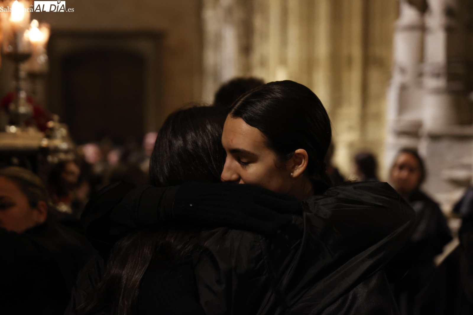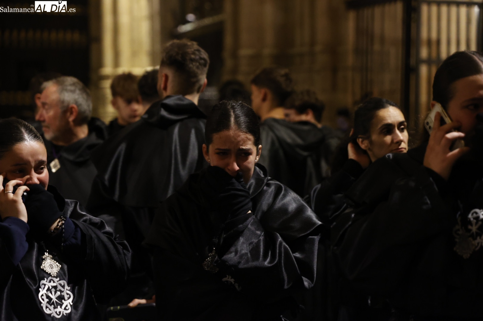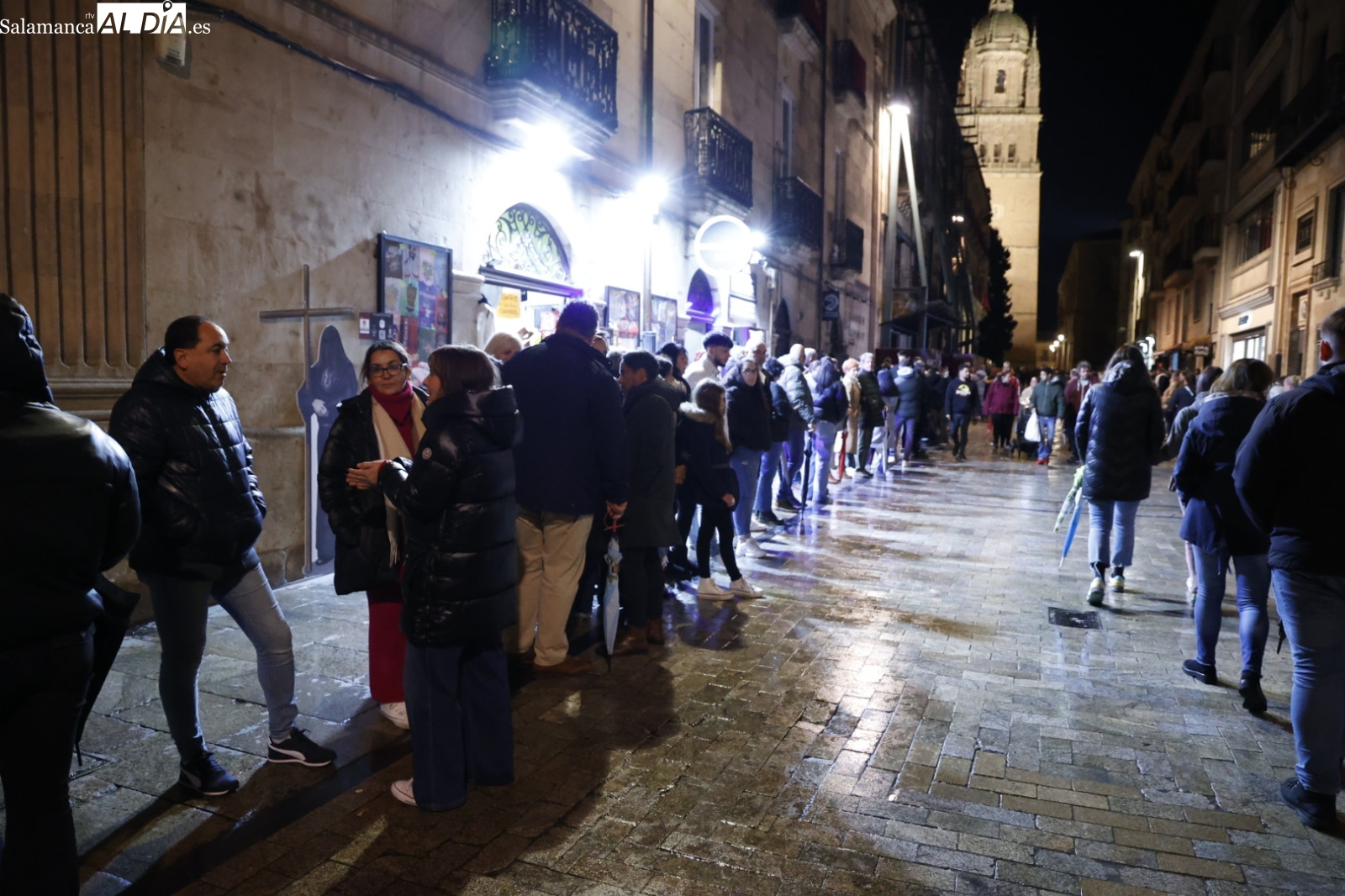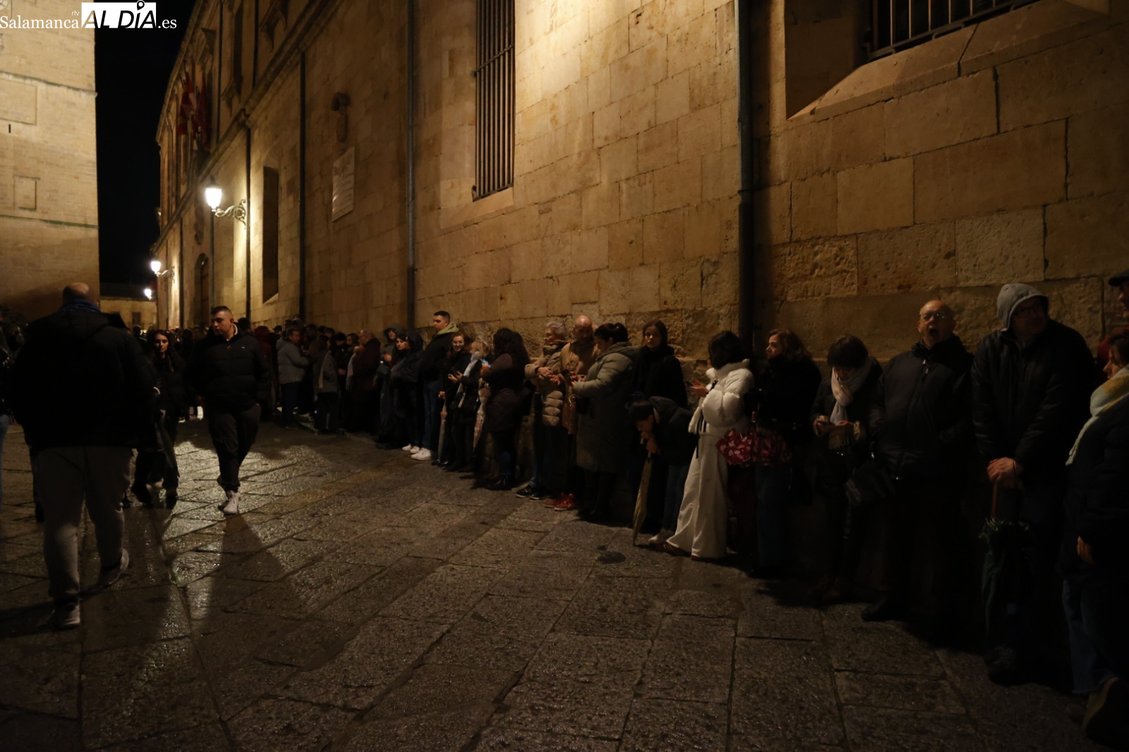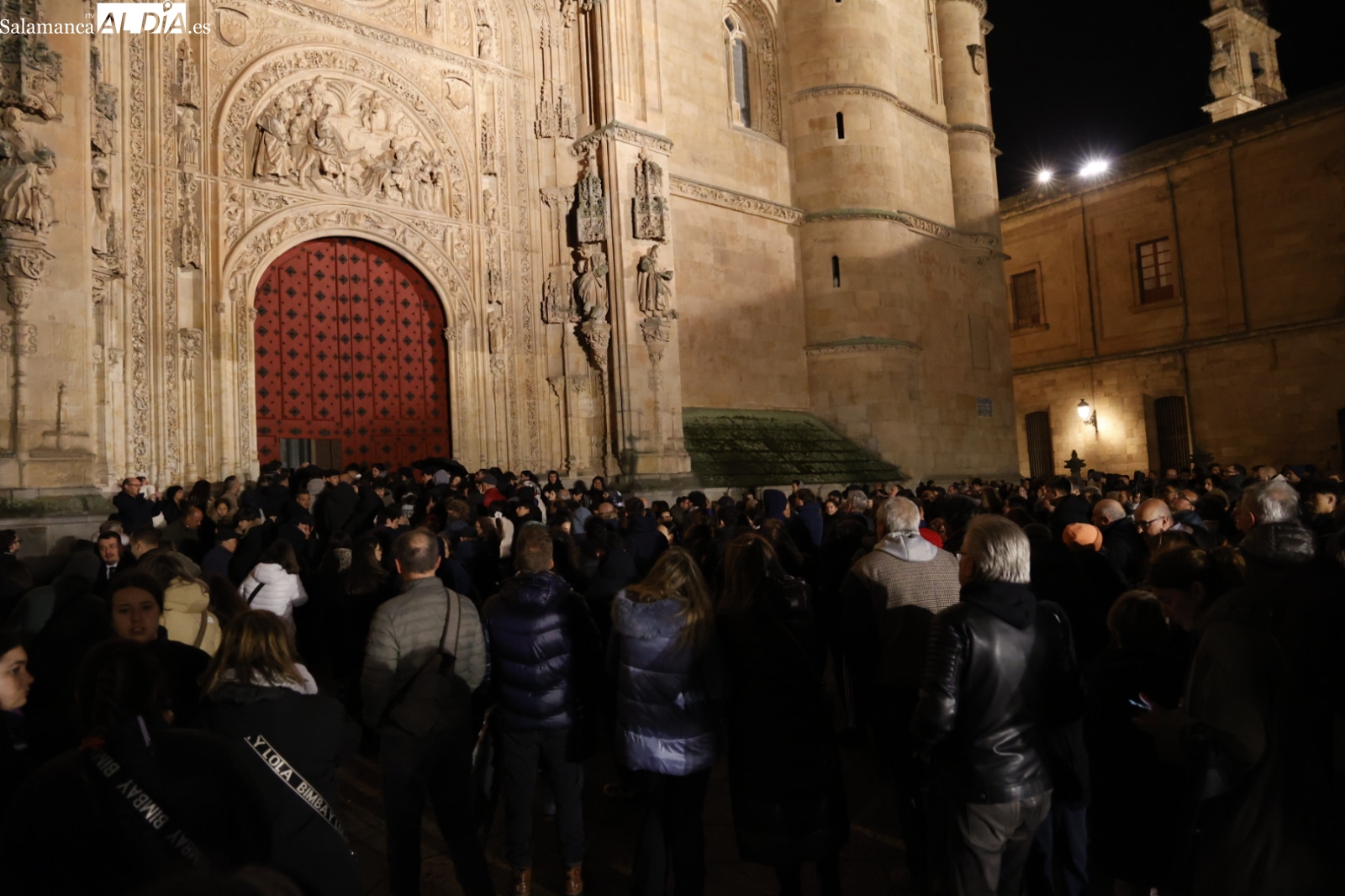 Miles de salmantinos esperaban en las calles del recorrido el paso de la Soledad, pero solo pudieron contemplarla bajo el dintel de la Puerta del Obispo de la Catedral Nueva. Las lágrimas y la emoción eran palpables tanto en los cofrades como en los numerosos devotos que se encontraban en el exterior del templo.