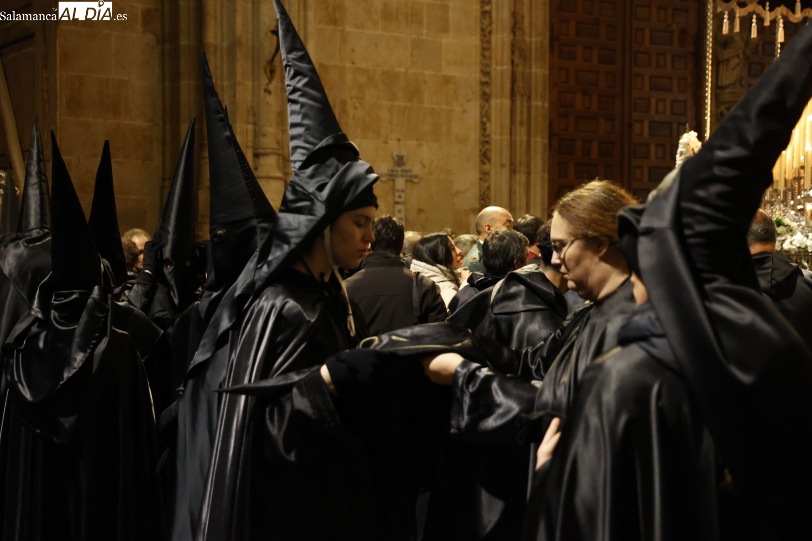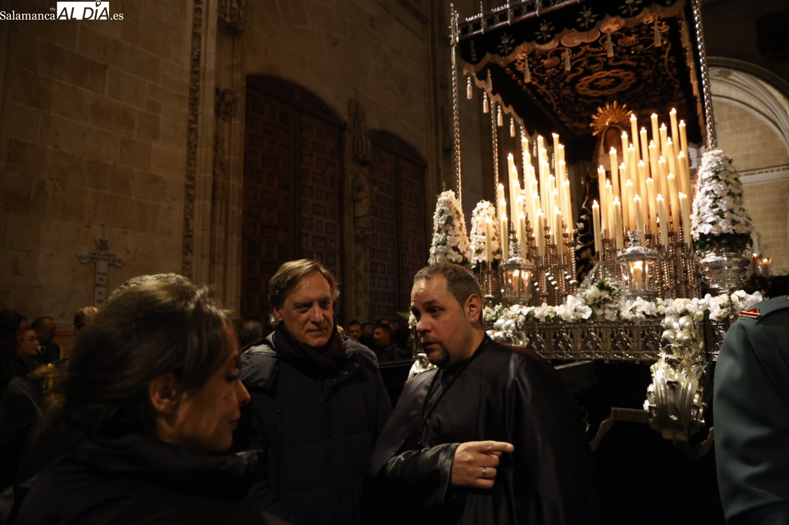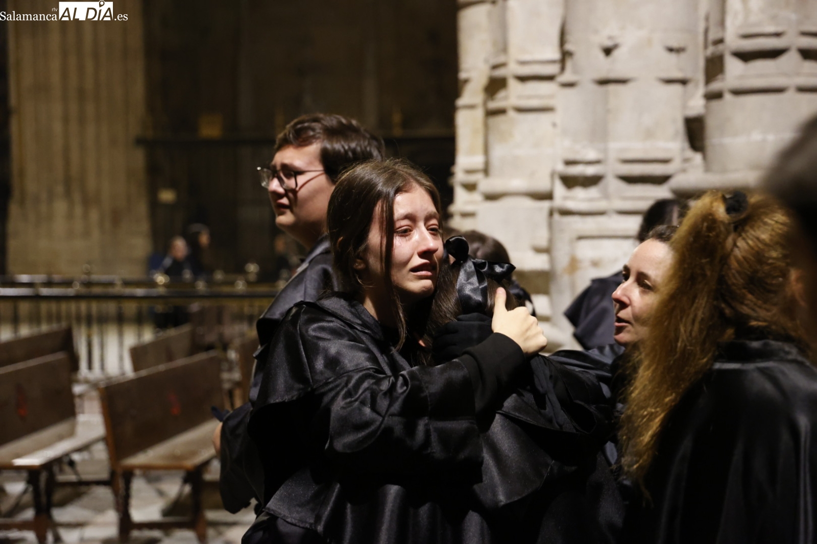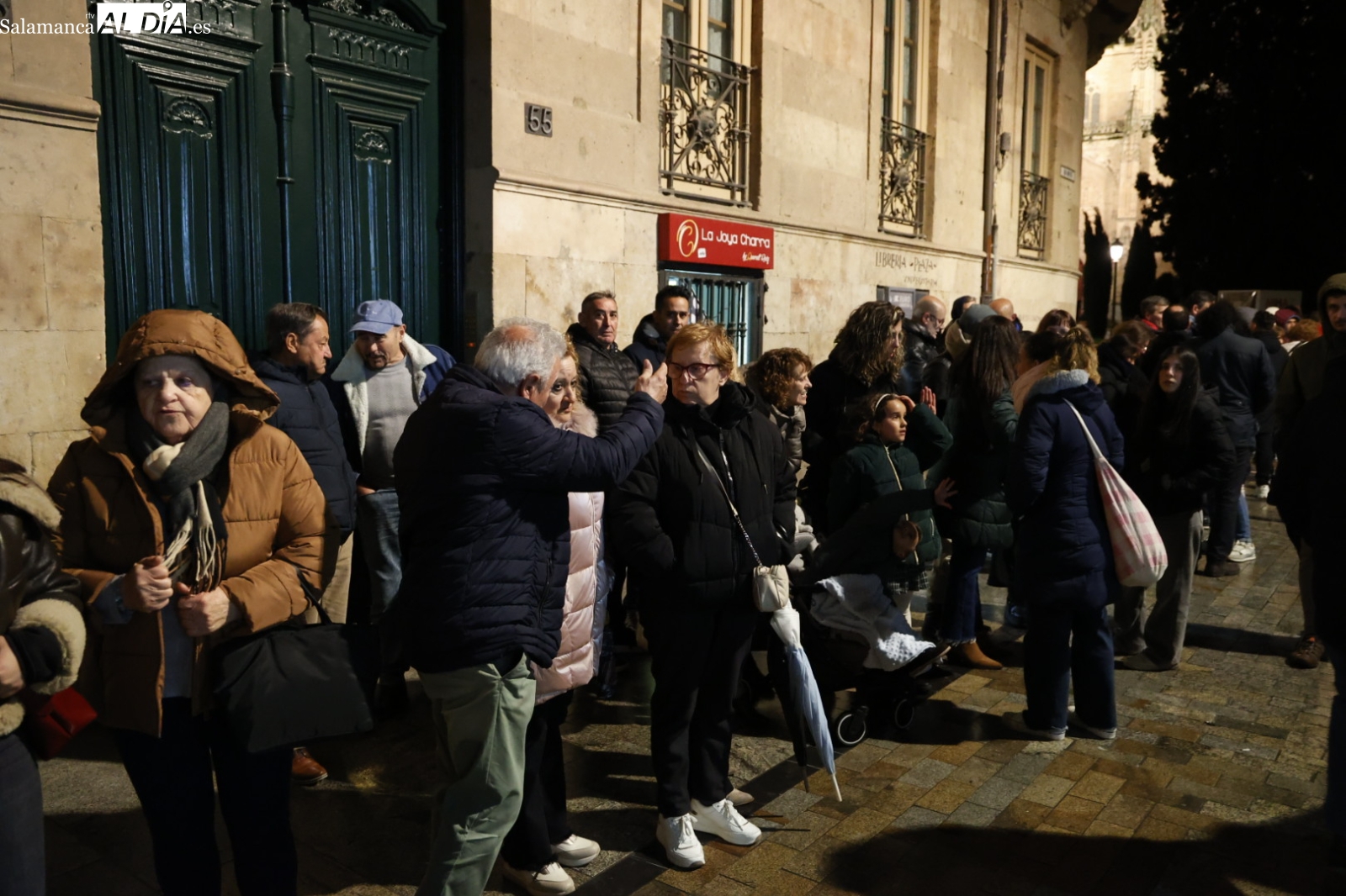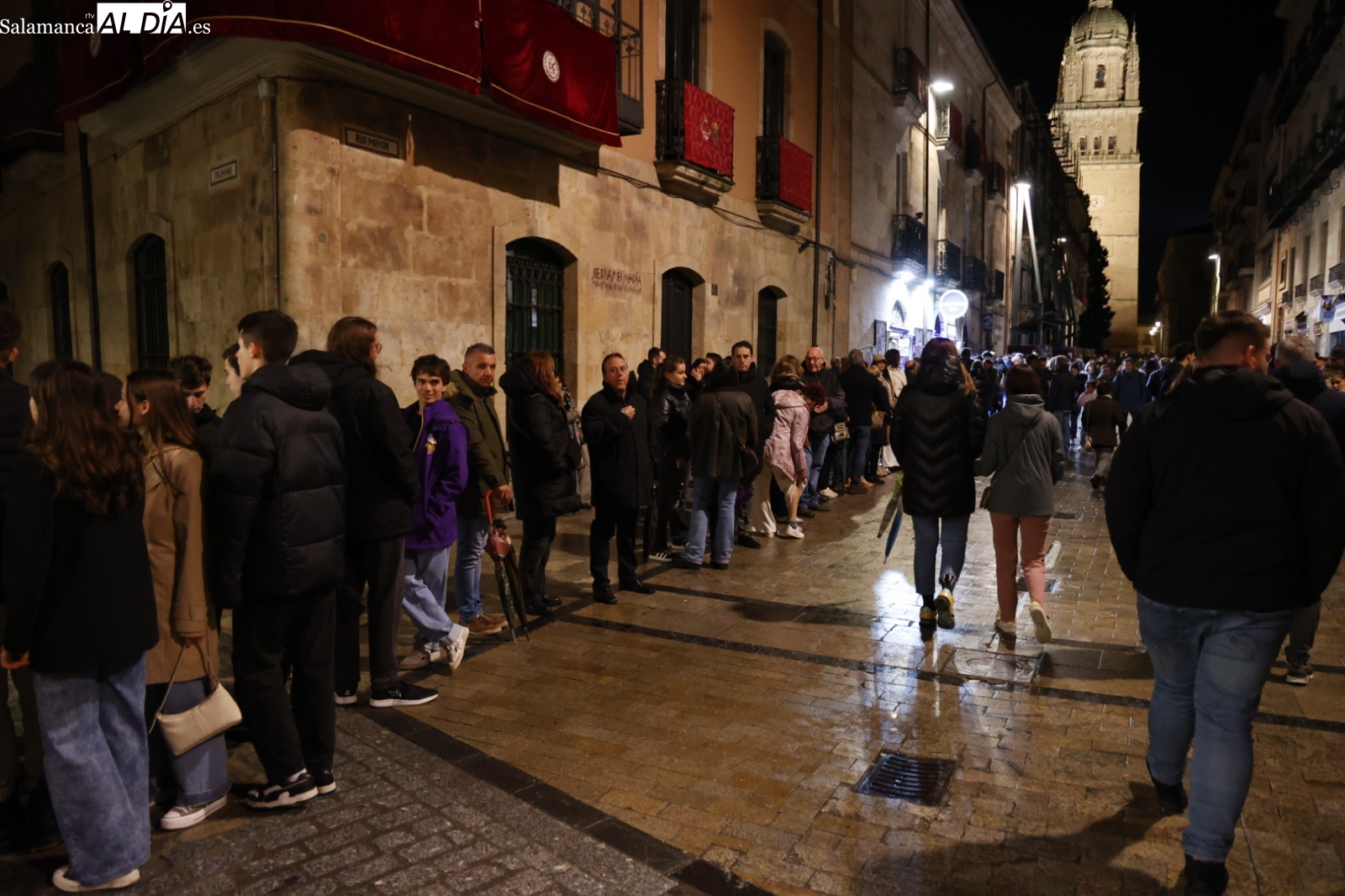 Miles de salmantinos esperaban en las calles del recorrido el paso de la Soledad, pero solo pudieron contemplarla bajo el dintel de la Puerta del Obispo de la Catedral Nueva. Las lágrimas y la emoción eran palpables tanto en los cofrades como en los numerosos devotos que se encontraban en el exterior del templo.
