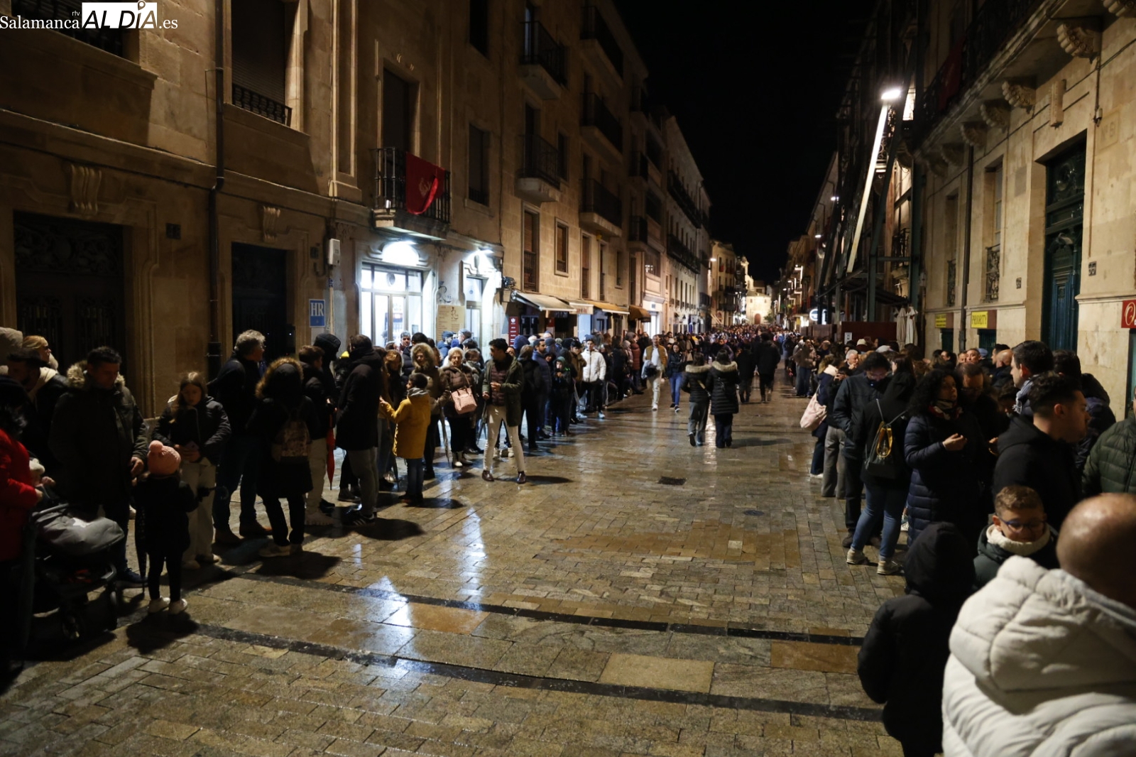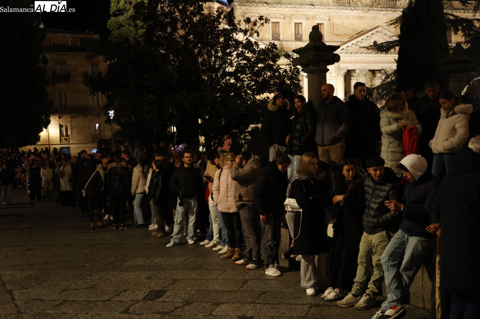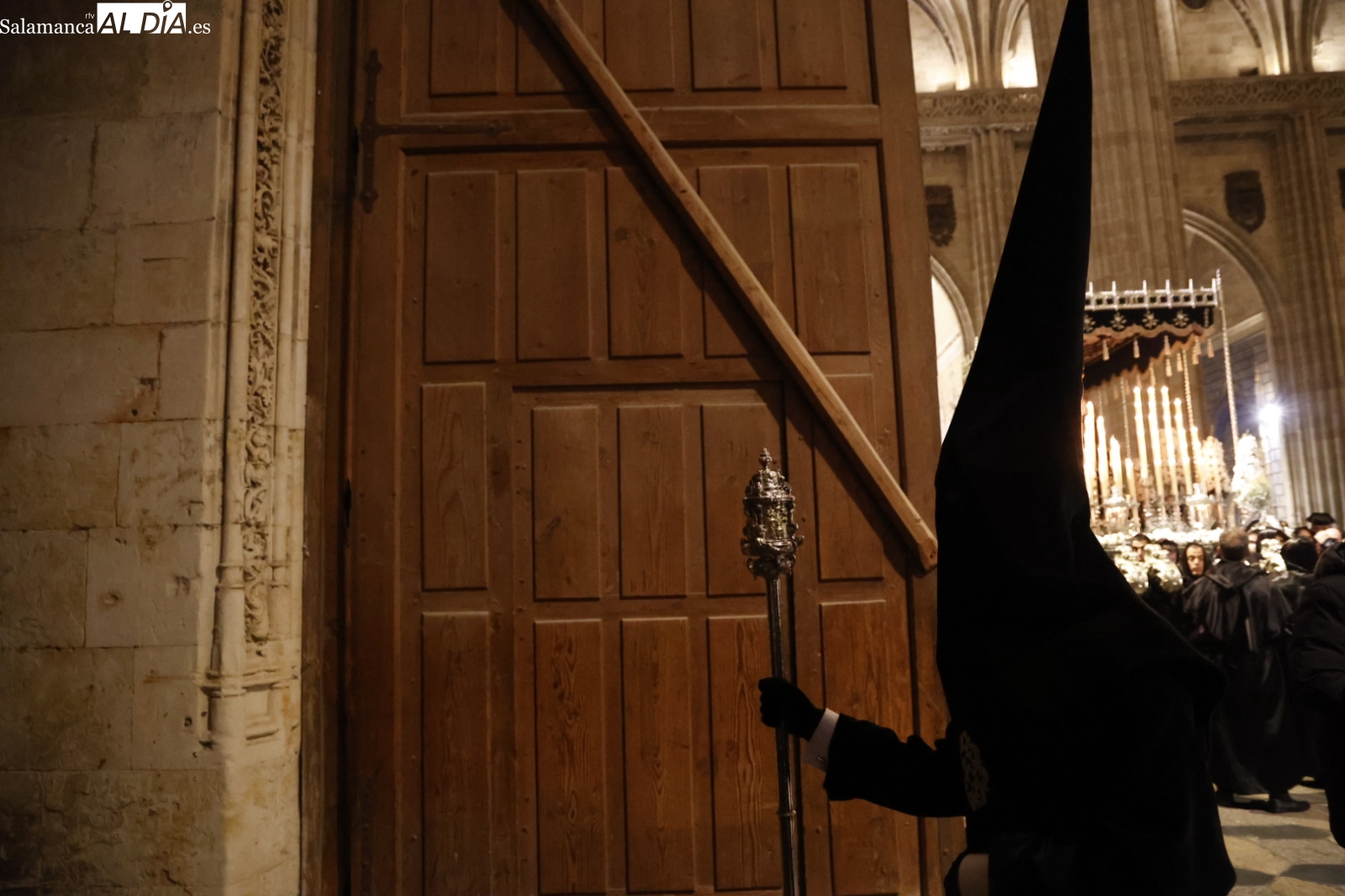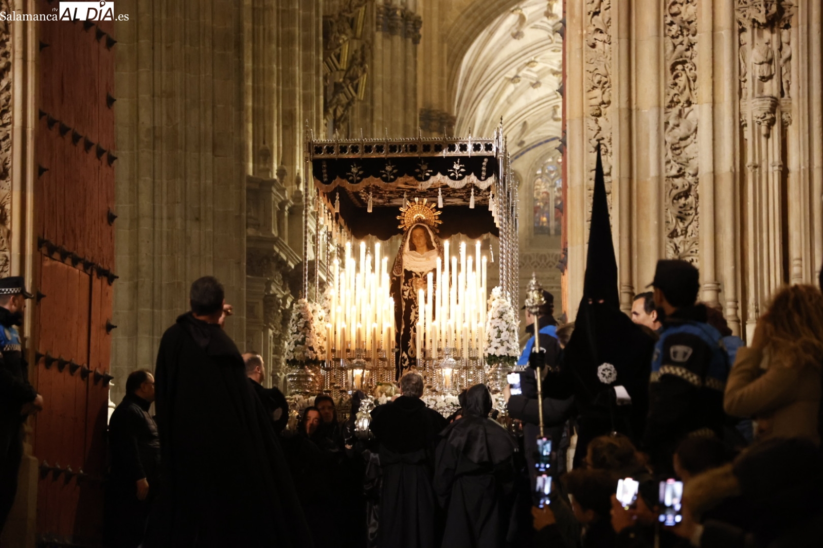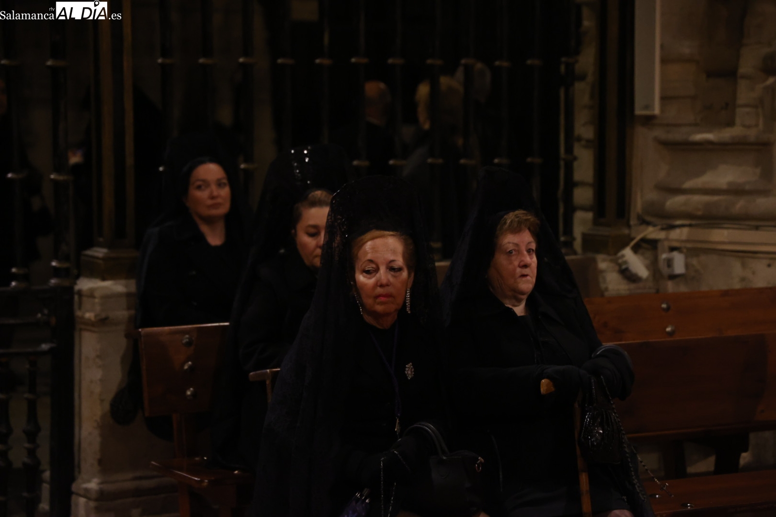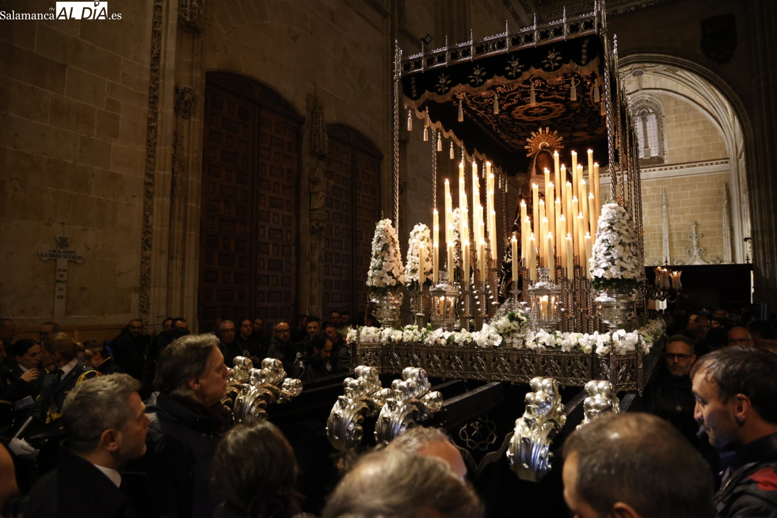 Miles de salmantinos esperaban en las calles del recorrido el paso de la Soledad, pero solo pudieron contemplarla bajo el dintel de la Puerta del Obispo de la Catedral Nueva. Las lágrimas y la emoción eran palpables tanto en los cofrades como en los numerosos devotos que se encontraban en el exterior del templo.