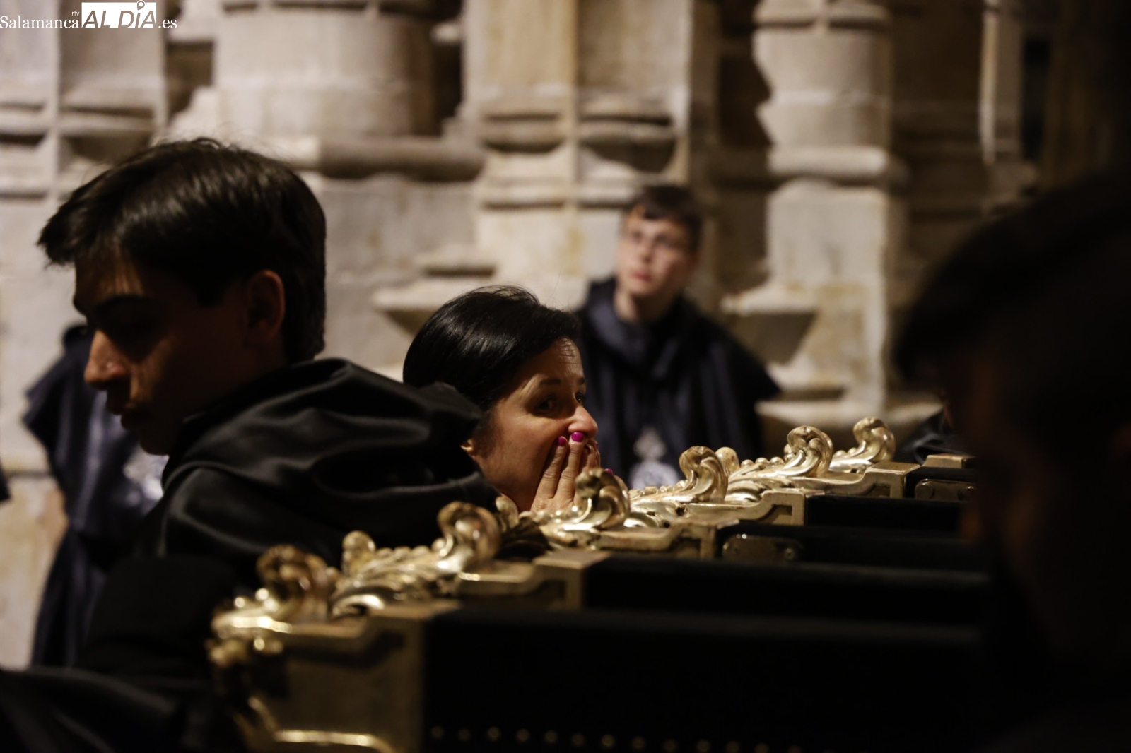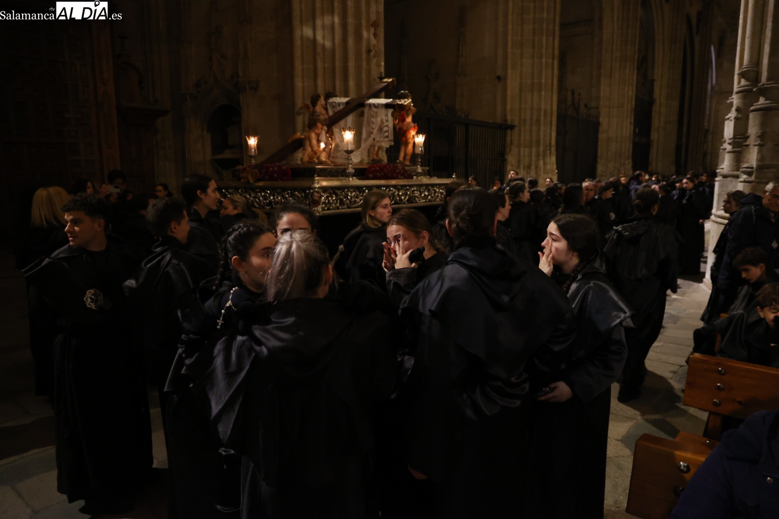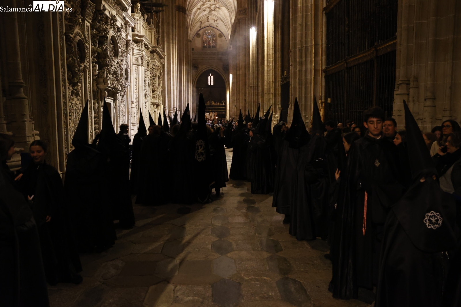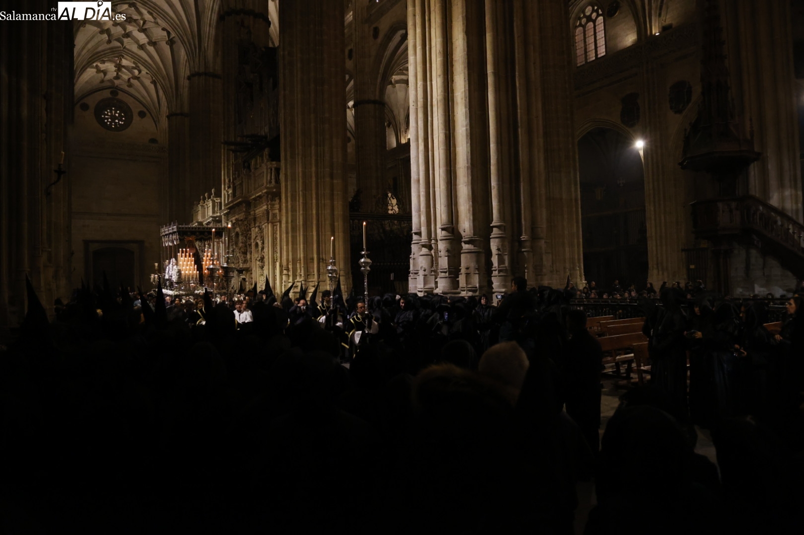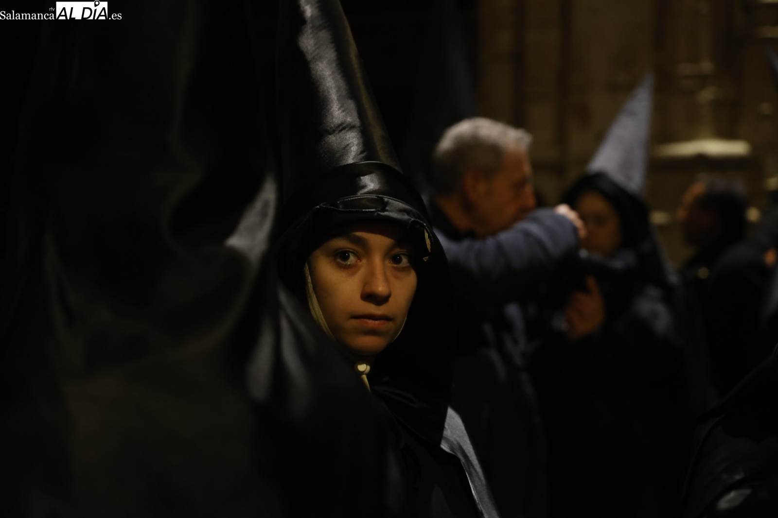 Miles de salmantinos esperaban en las calles del recorrido el paso de la Soledad, pero solo pudieron contemplarla bajo el dintel de la Puerta del Obispo de la Catedral Nueva. Las lágrimas y la emoción eran palpables tanto en los cofrades como en los numerosos devotos que se encontraban en el exterior del templo.