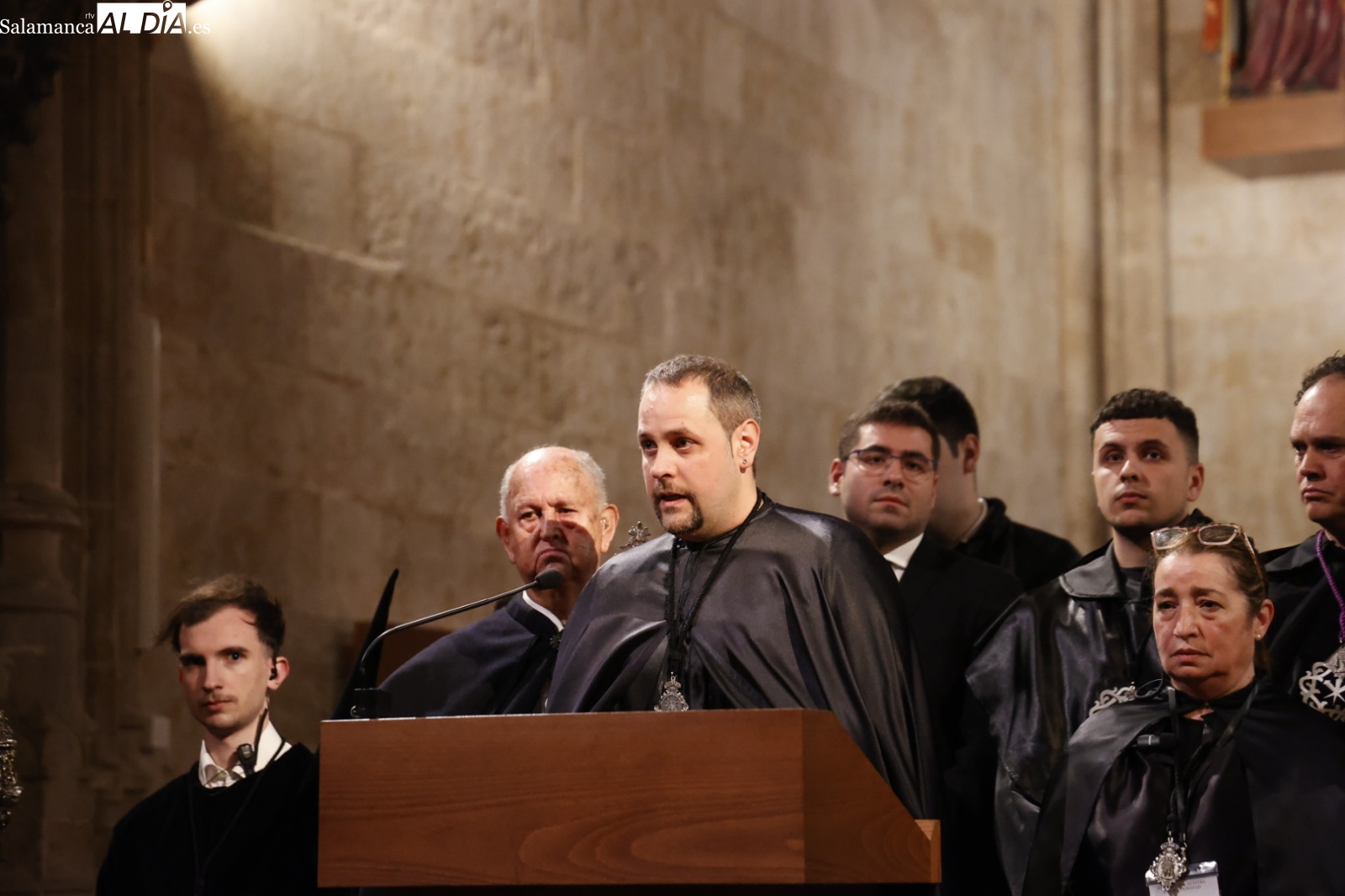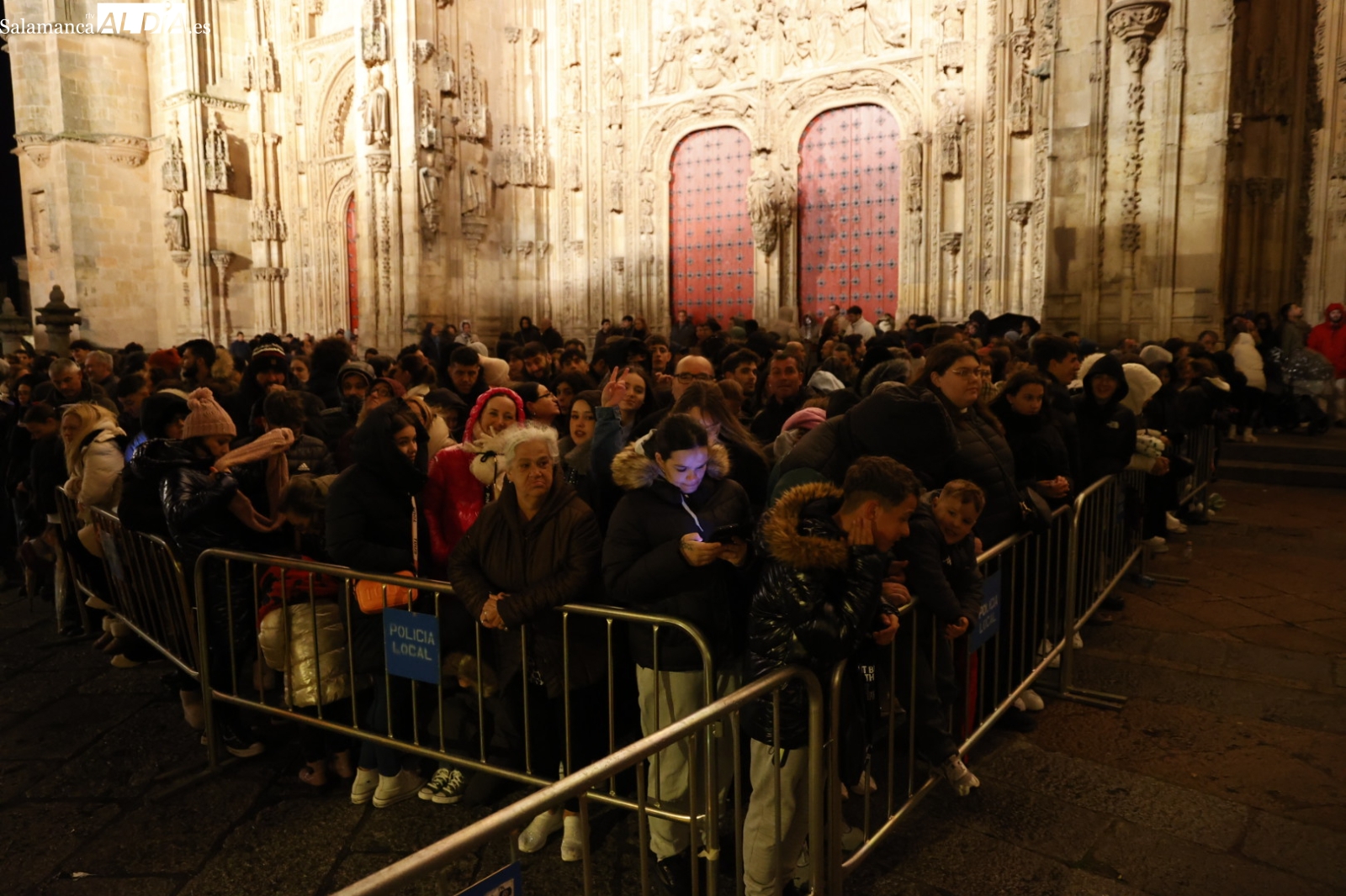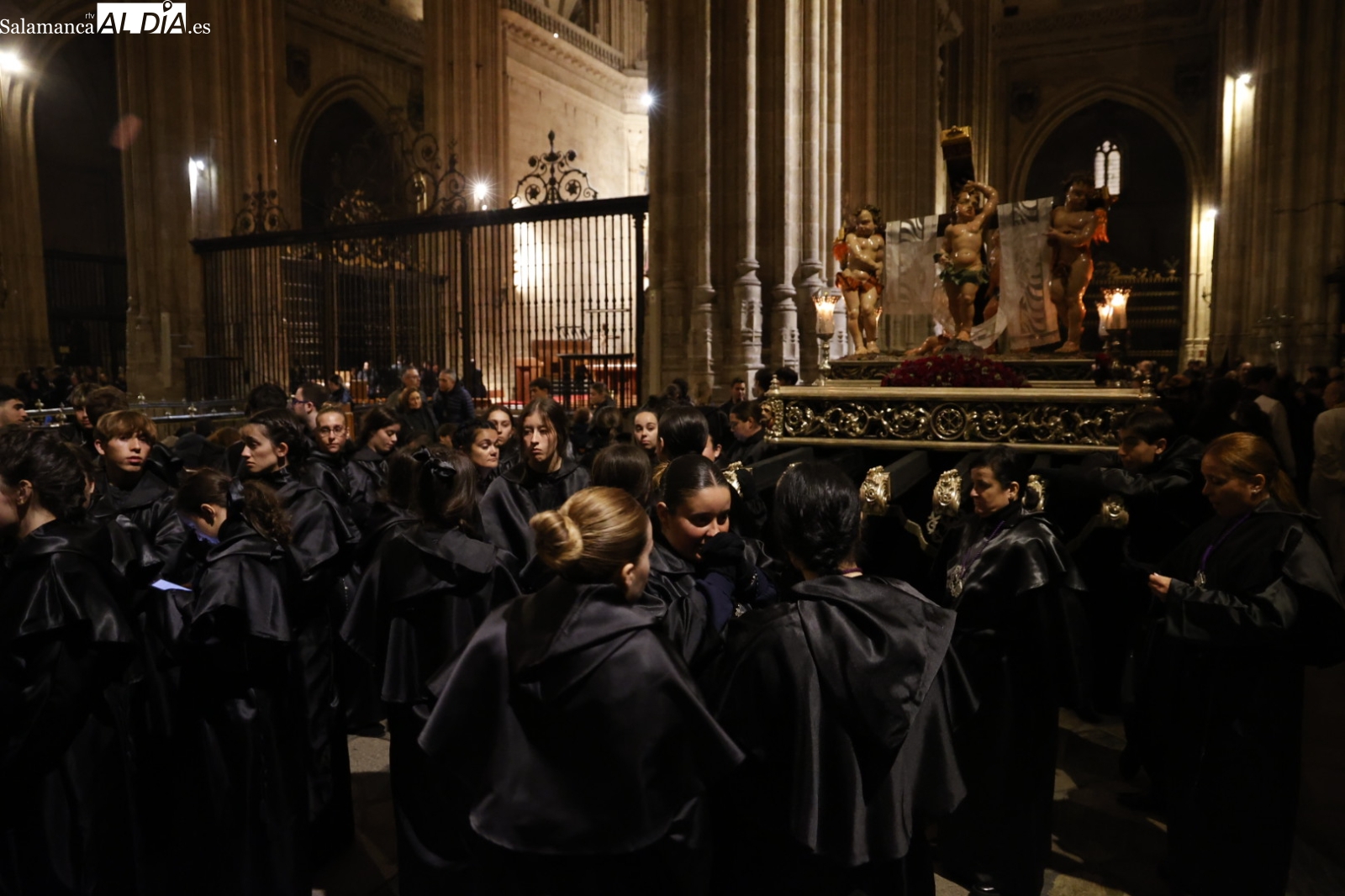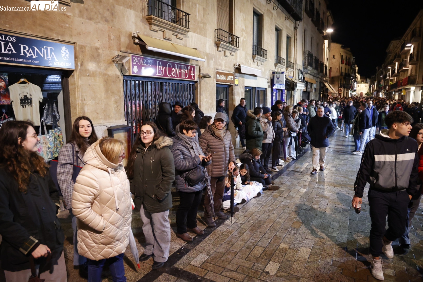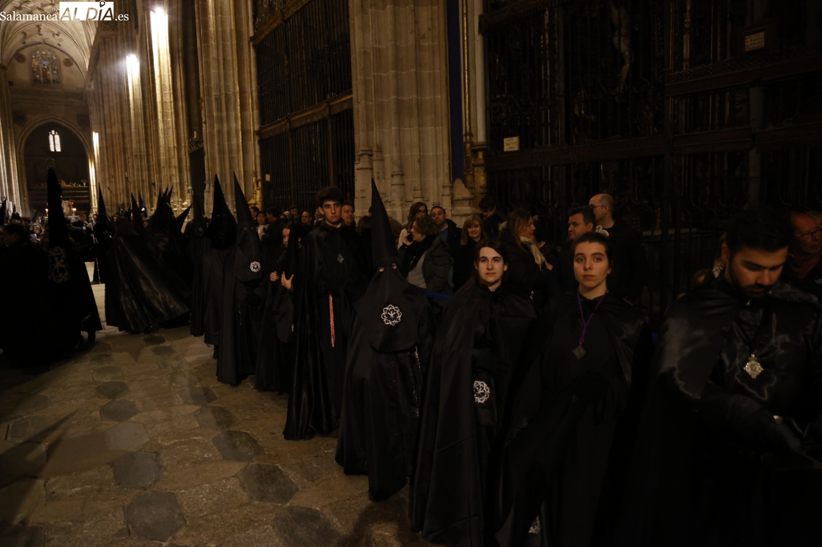 Miles de salmantinos esperaban en las calles del recorrido el paso de la Soledad, pero solo pudieron contemplarla bajo el dintel de la Puerta del Obispo de la Catedral Nueva. Las lágrimas y la emoción eran palpables tanto en los cofrades como en los numerosos devotos que se encontraban en el exterior del templo.