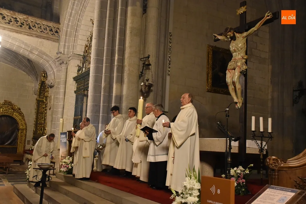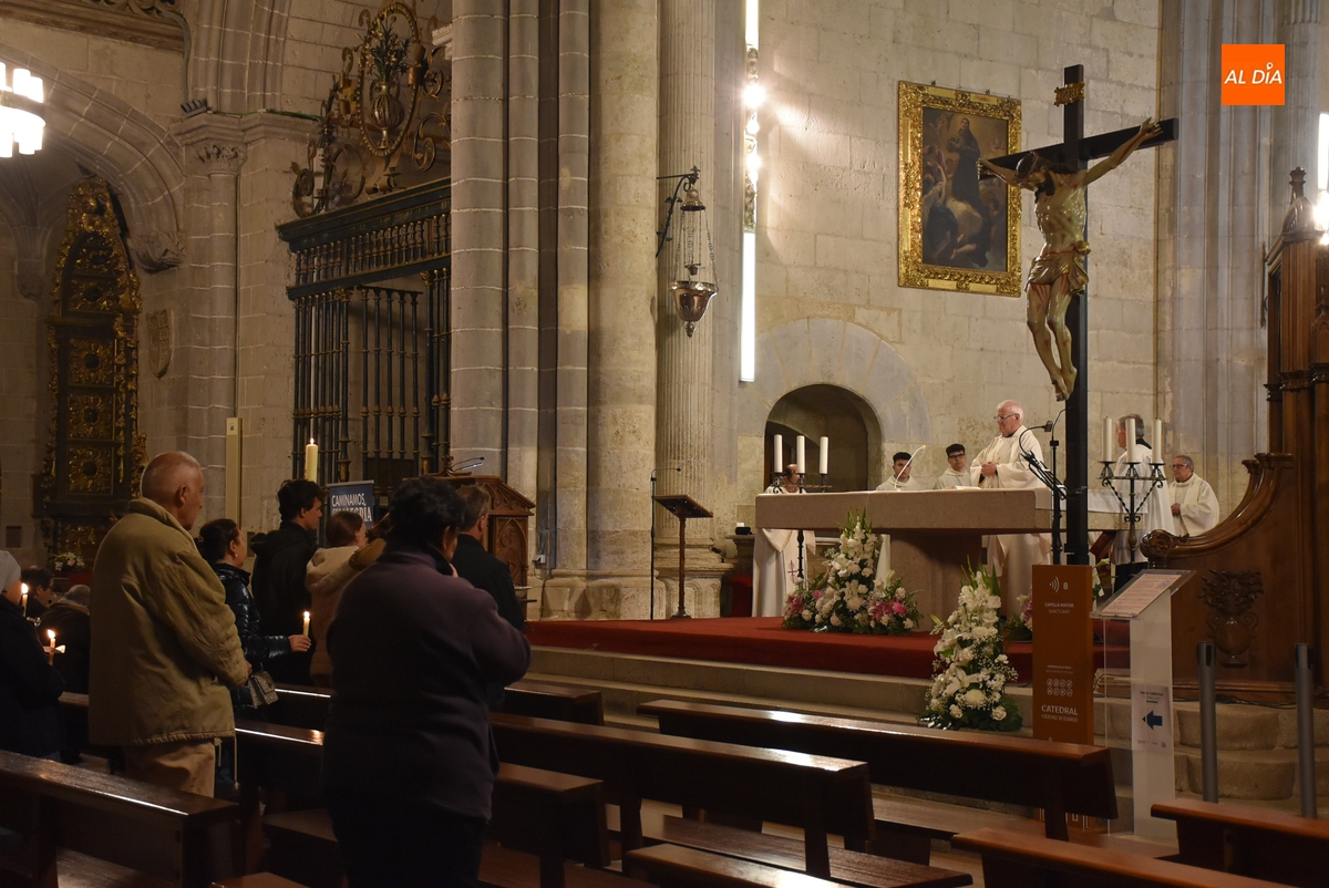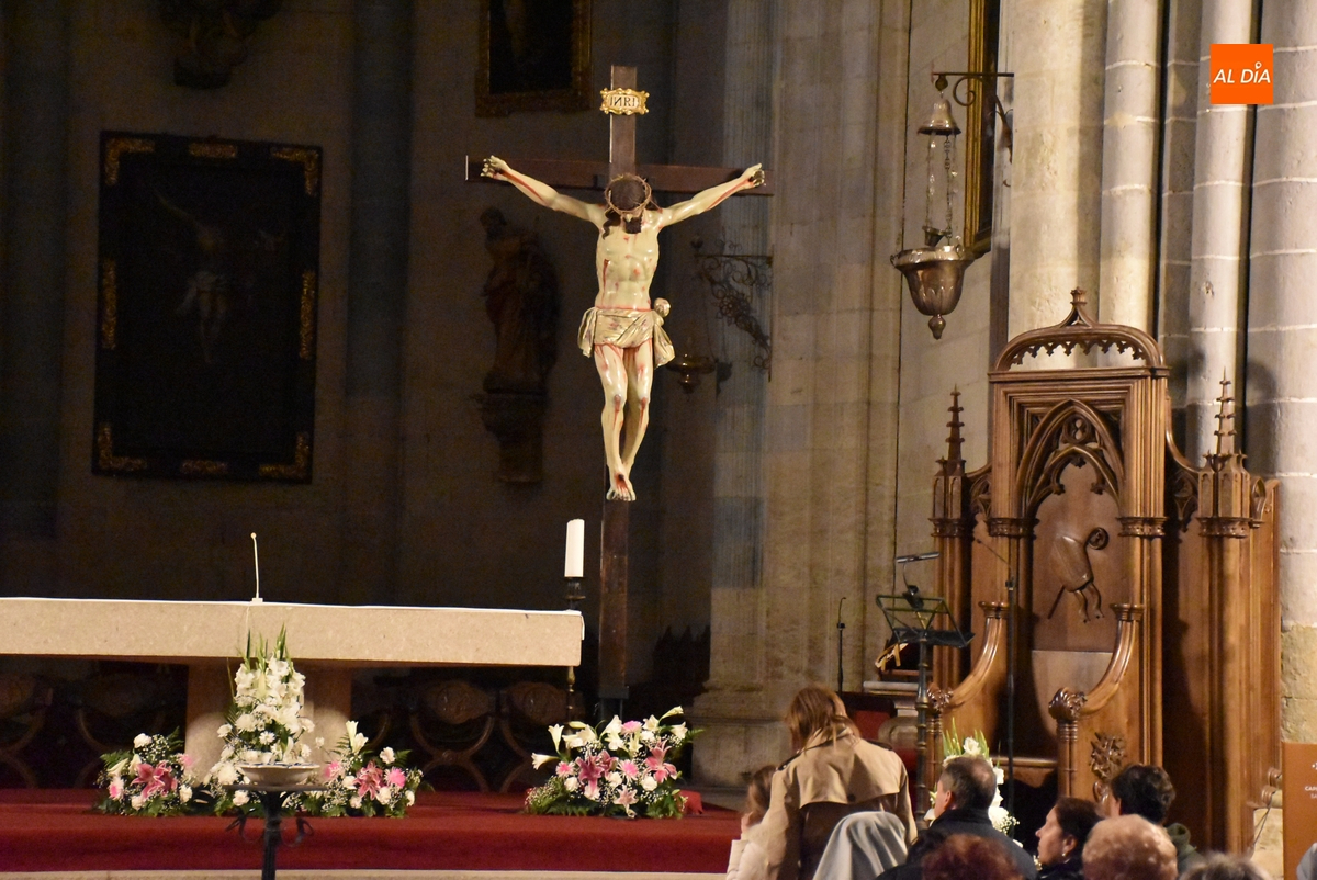 Al igual que cuando fue llevado por primera vez en enero (cuando se abrió en la Diócesis el Año Jubilar), el Cristo del Silencio ha sido situado en pleno altar mayor de la Catedral mirobrigense, desde donde ya presidió en la noche del Sábado Santo la Vigilia Pascual de la Seo.