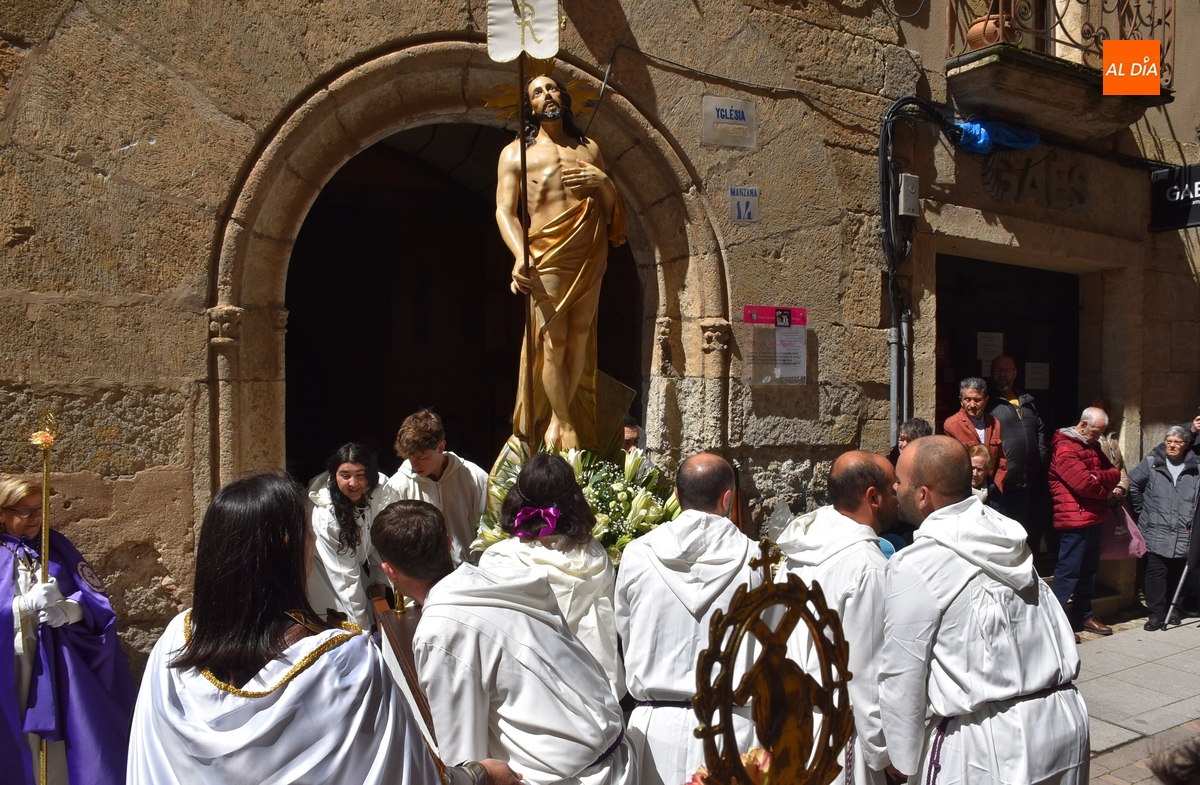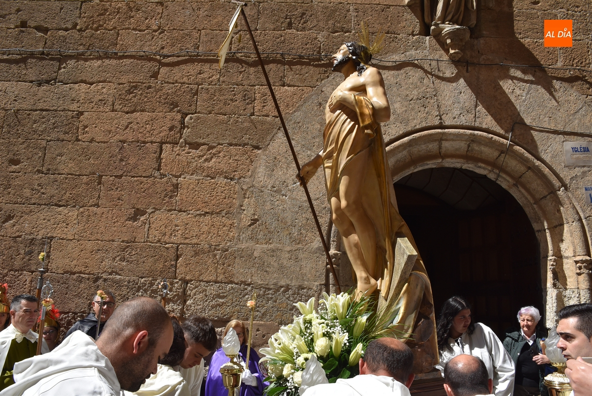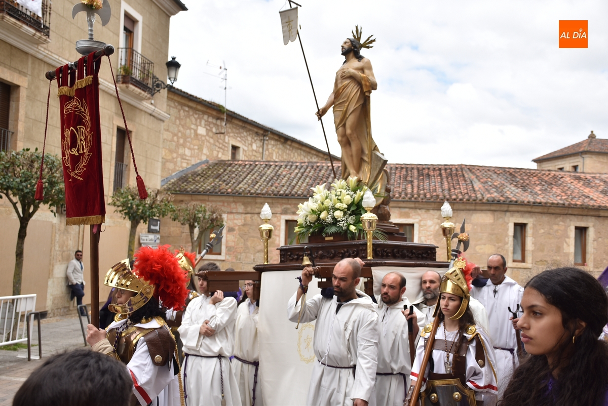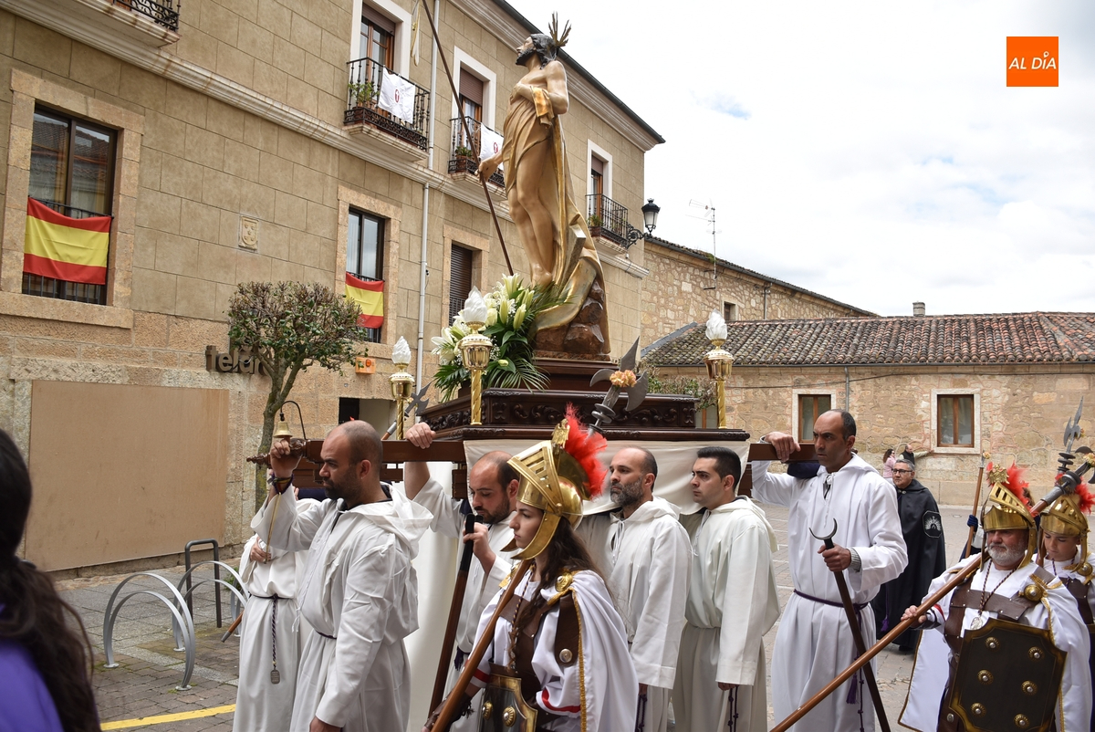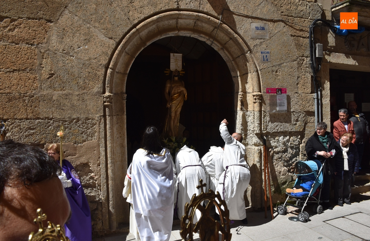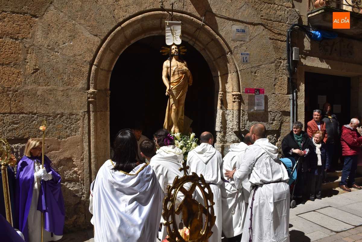 Horas después de comenzar a festejarla con la novedosa procesión de la Sábana Santa, Ciudad Rodrigo tuvo en el tramo final de la mañana del domingo su tradicional procesión de celebración de la Resurrección de Jesucristo, a cargo de la Cofradía de Jesús Nazareno, que procesiona por las calles mirobrigenses la imagen de Jesús Resucitado, que este año se volvió a poner en marcha en la Iglesia de San Agustín.
