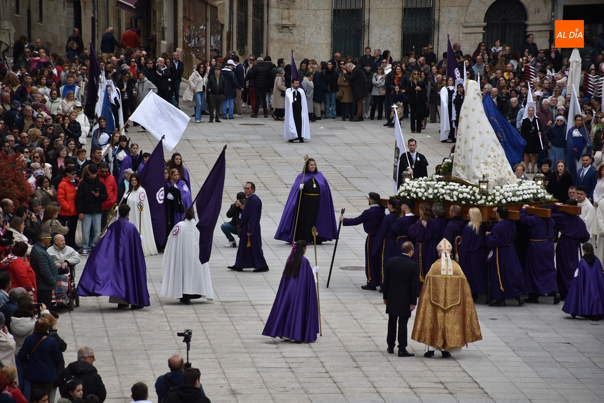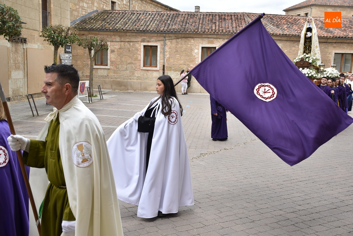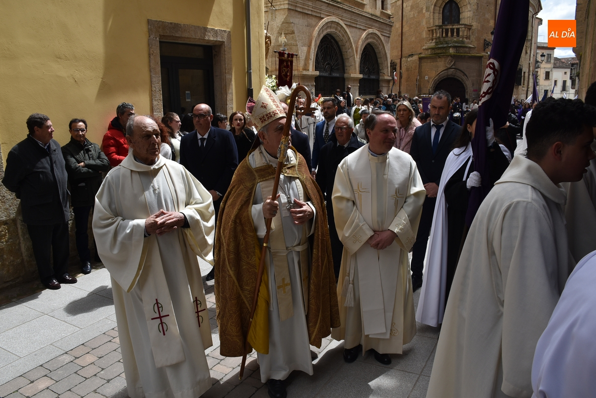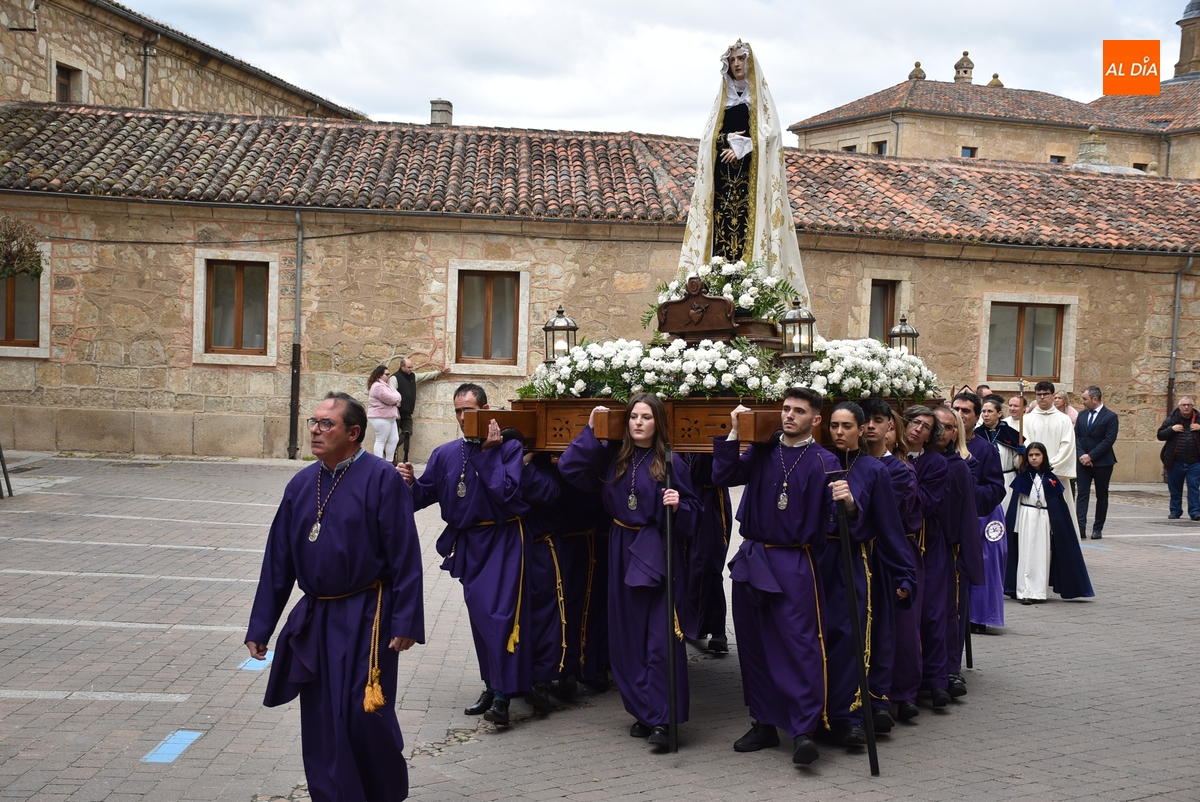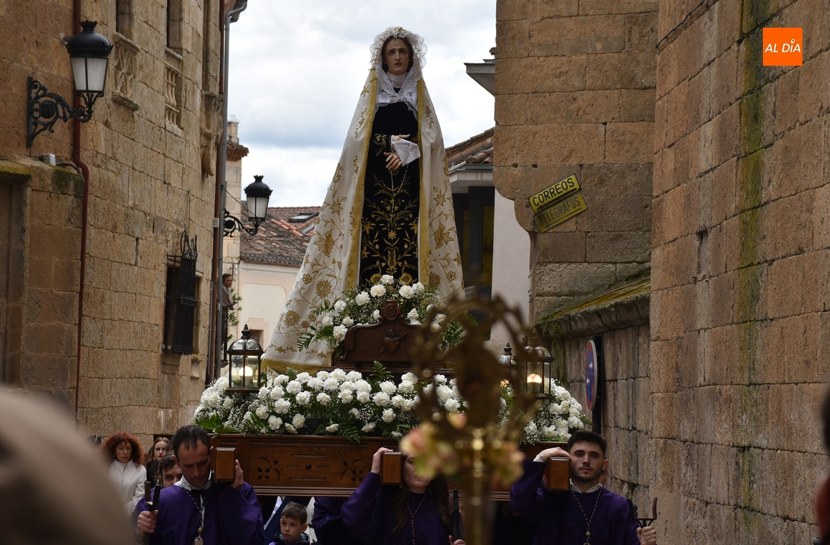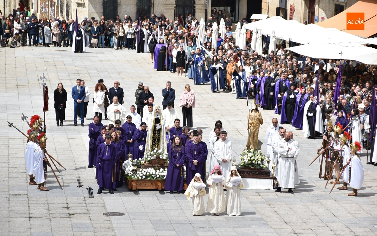 Unos minutos después de ponerse en marcha el Resucitado (que avanzó por Cristóbal de Castillejo, Plaza de San Pedro, Gigantes y Rúa del Sol), arrancó su ruta en la Catedral de Santa María La Dolorosa, quién estuvo acompañada por el Obispo José Luis Retana, el Vicario General de la Diócesis, José María Rodríguez-Veleiro, el sacerdote Bernardino San Nicasio, y como novedad, por miembros de la Corporación Municipal: Marcos Iglesias, Ramón Sastre, José Manuel Jerez, Belén Barco, Víctor Gómez, Rubén Benito, Carmen Lorenzo y Raquel Enríquez.