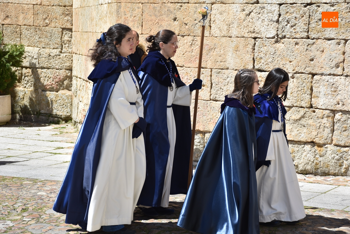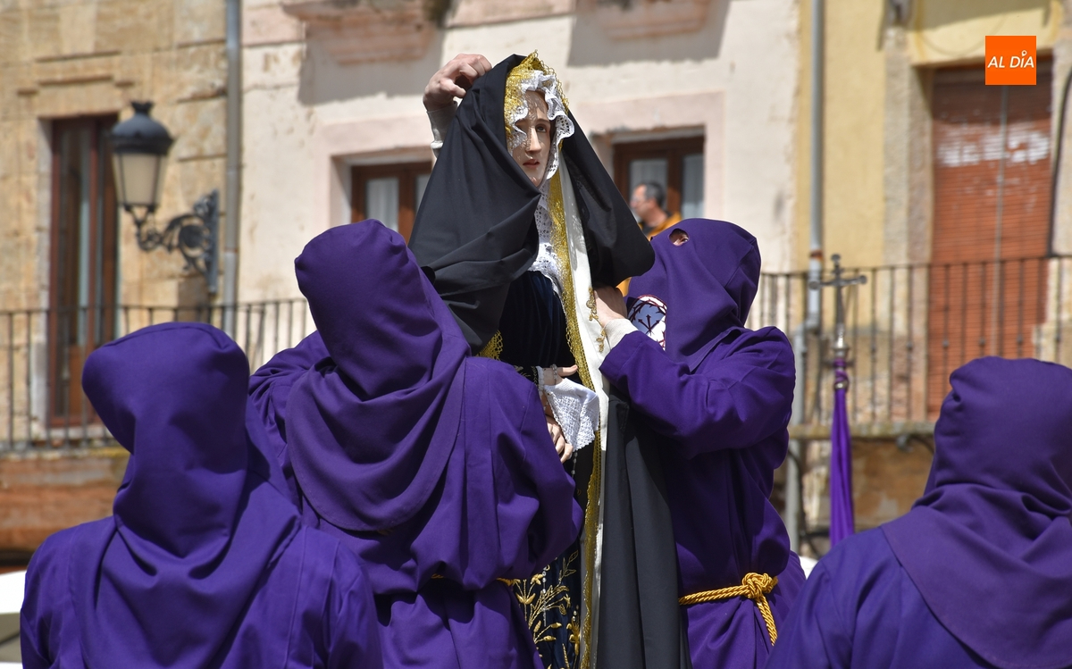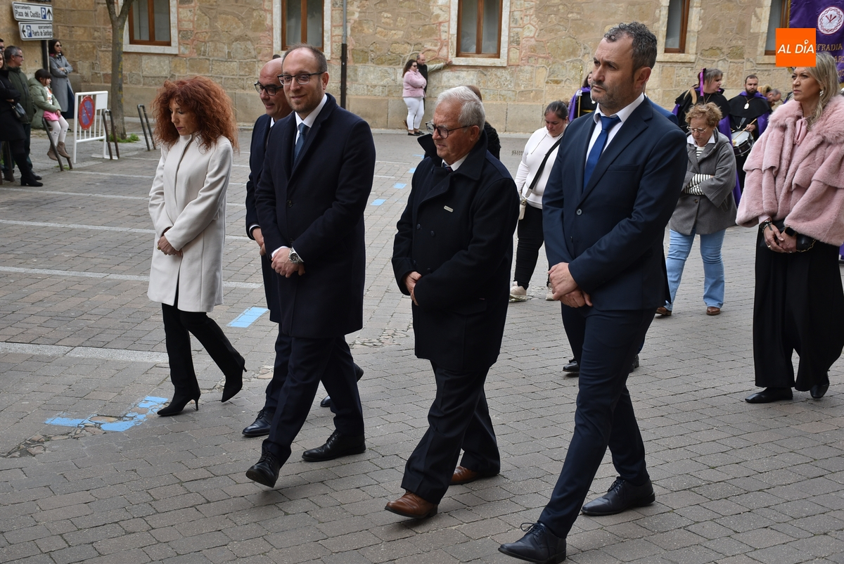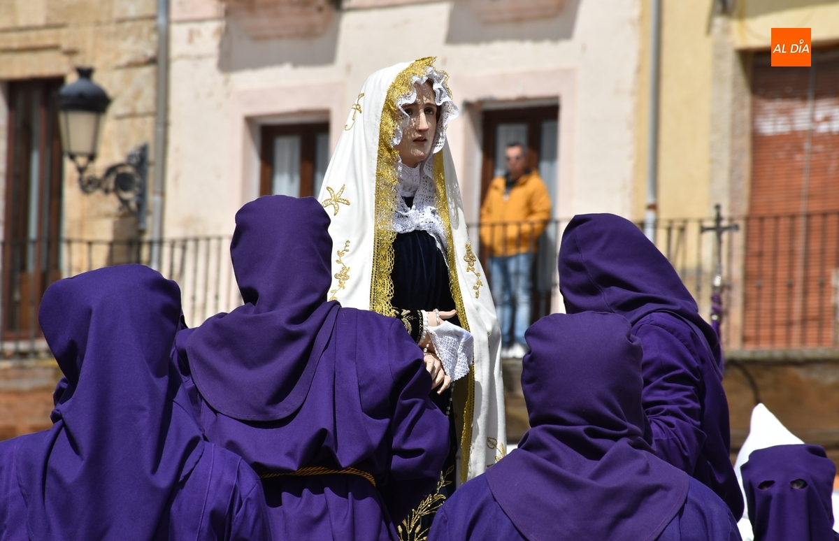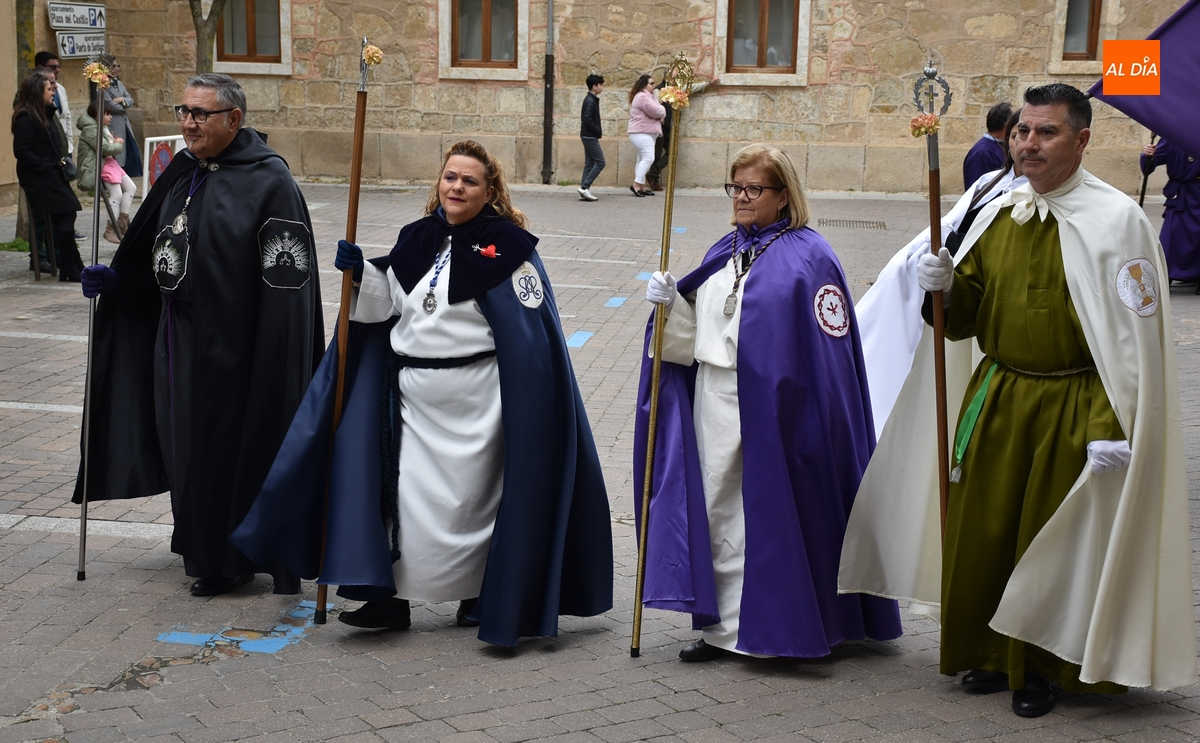 Unos minutos después de ponerse en marcha el Resucitado (que avanzó por Cristóbal de Castillejo, Plaza de San Pedro, Gigantes y Rúa del Sol), arrancó su ruta en la Catedral de Santa María La Dolorosa, quién estuvo acompañada por el Obispo José Luis Retana, el Vicario General de la Diócesis, José María Rodríguez-Veleiro, el sacerdote Bernardino San Nicasio, y como novedad, por miembros de la Corporación Municipal: Marcos Iglesias, Ramón Sastre, José Manuel Jerez, Belén Barco, Víctor Gómez, Rubén Benito, Carmen Lorenzo y Raquel Enríquez.