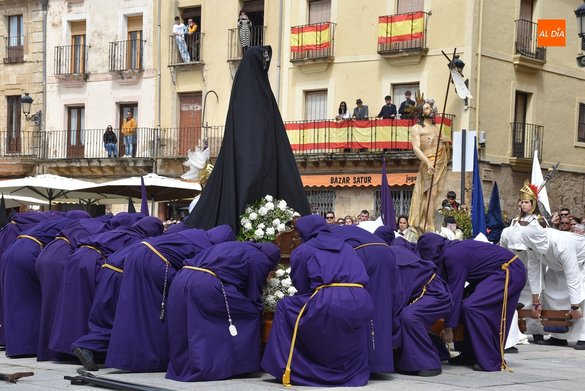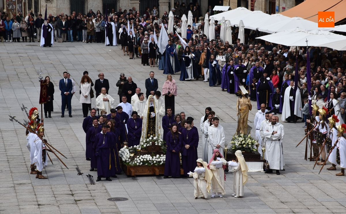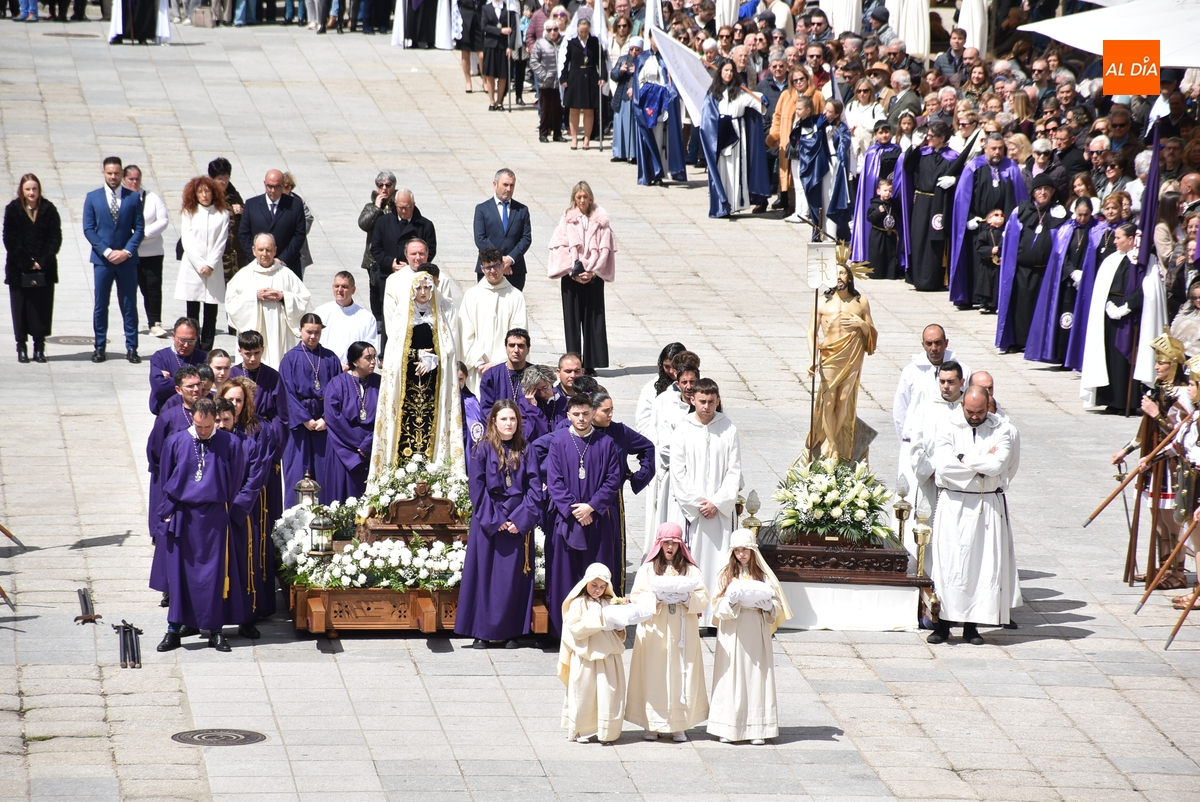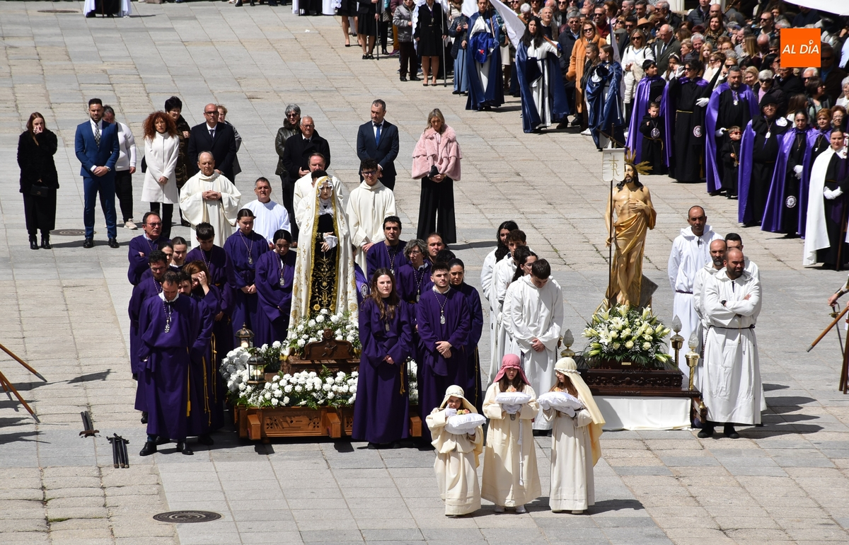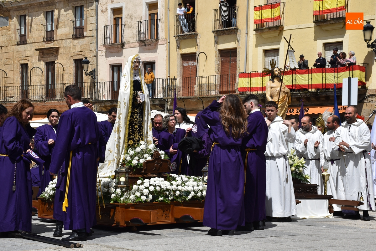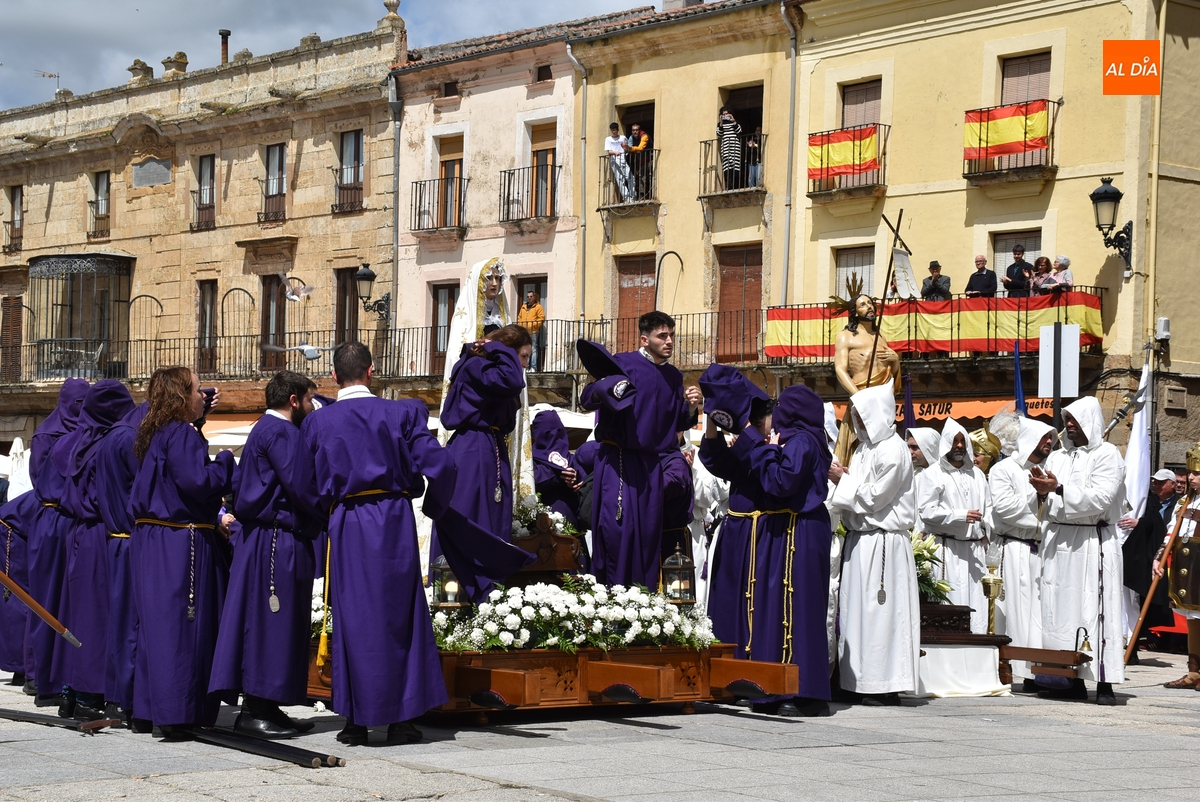 A un buen ritmo, El Resucitado y La Dolorosa se acabaron encontrando en el centro de la Plaza Mayor, siendo descendidos al suelo. En ese momento, se le quitó el luto a La Dolorosa, para dejar al descubierto su manto blanco, mientras los costaleros de ambos pasos se iban quitando sus capuchas y verdugos. Acto seguido, se soltaron las habituales palomas, mientras se hacía sonar al ritmo del Reloj Suelto la campana situada en lo alto de la Casa Consistorial, en cuya balconada venía hablando el capellán del Nazareno, Manolo Peláez.