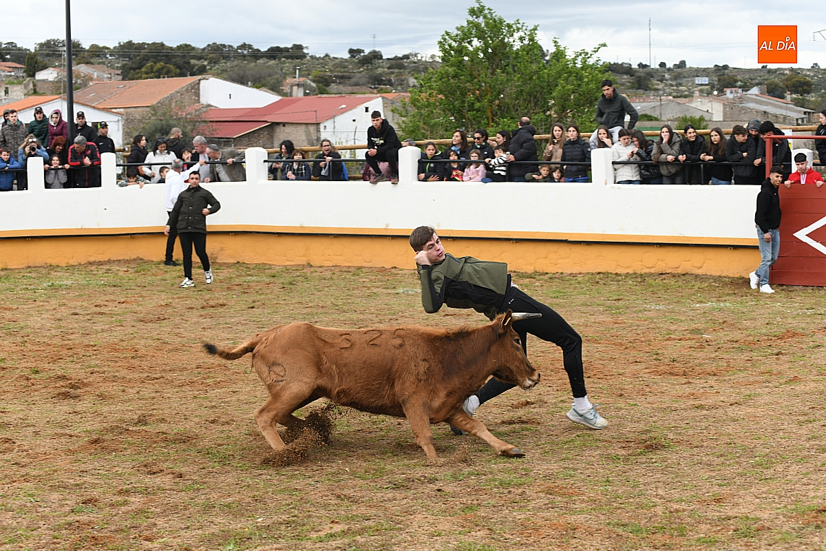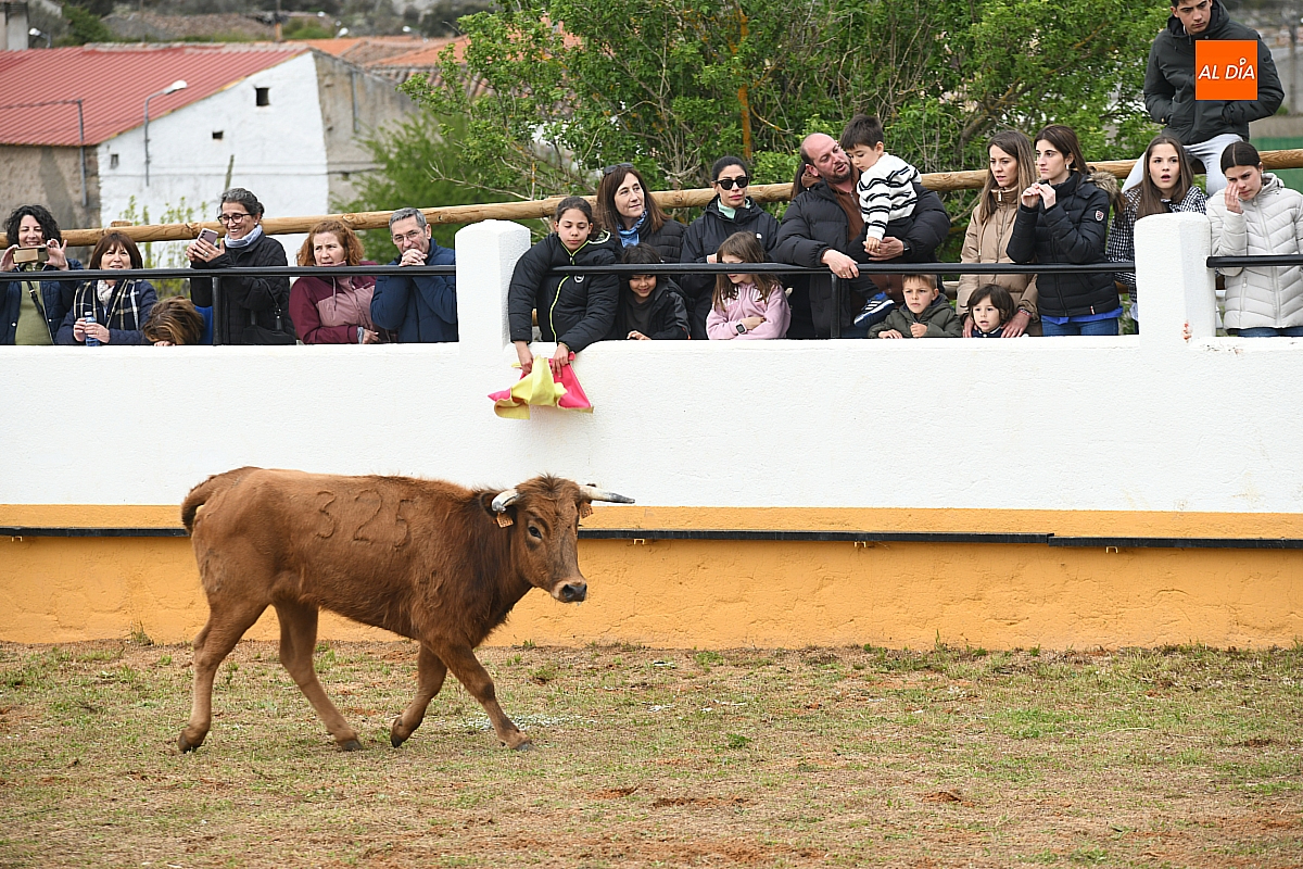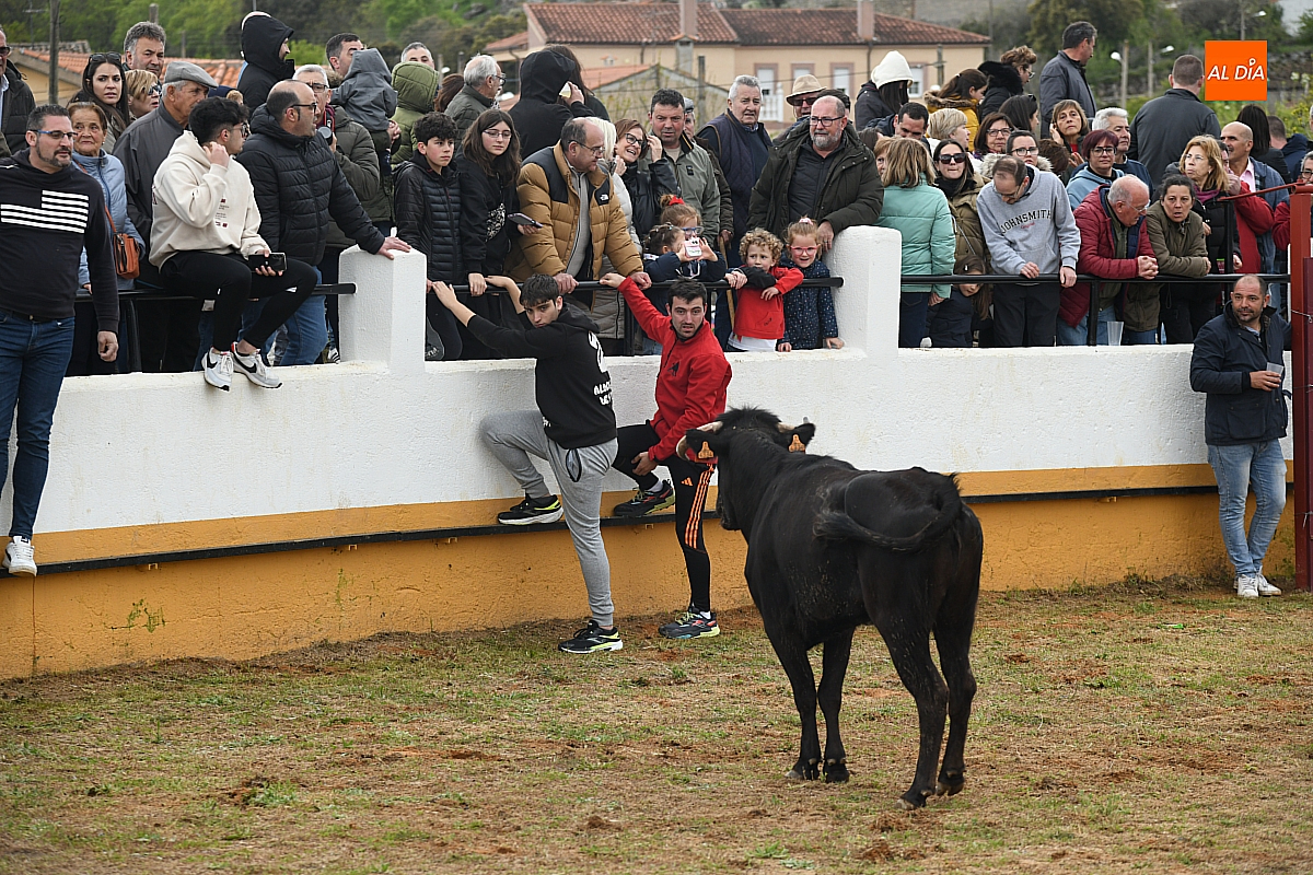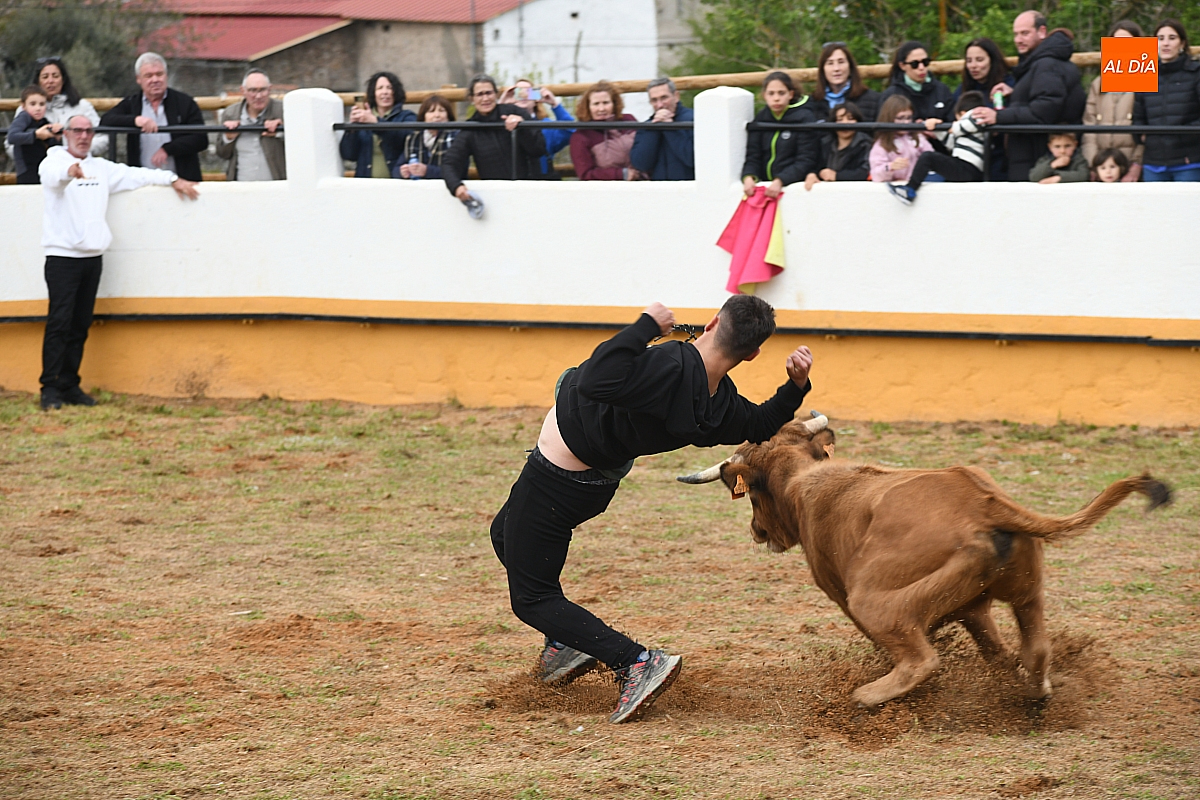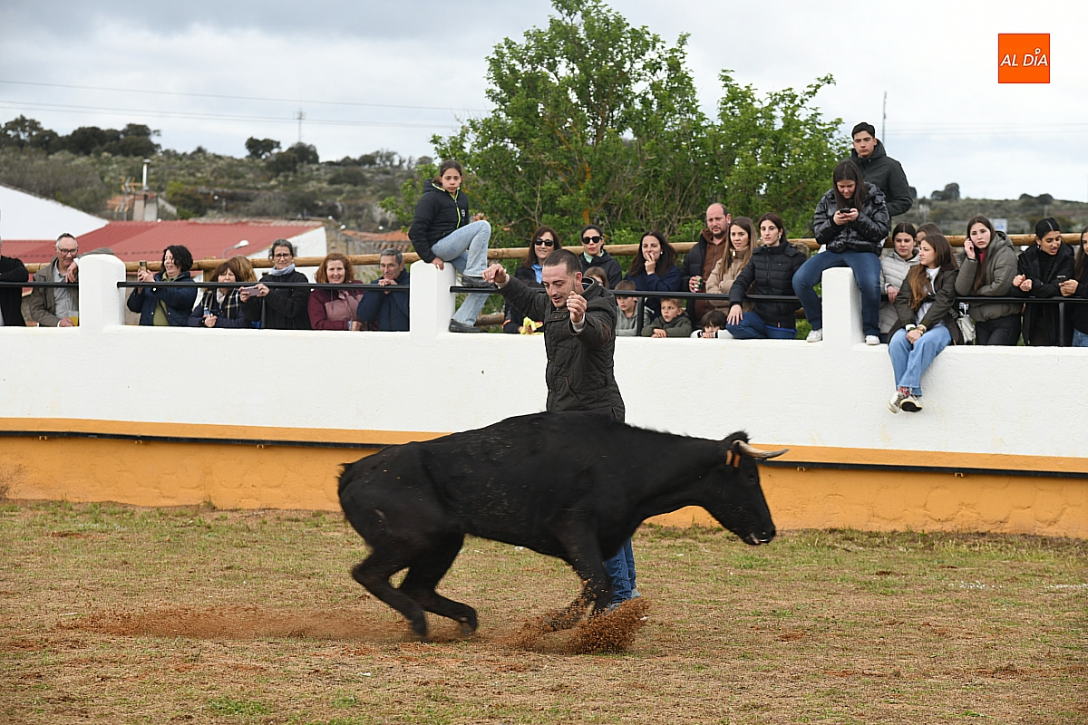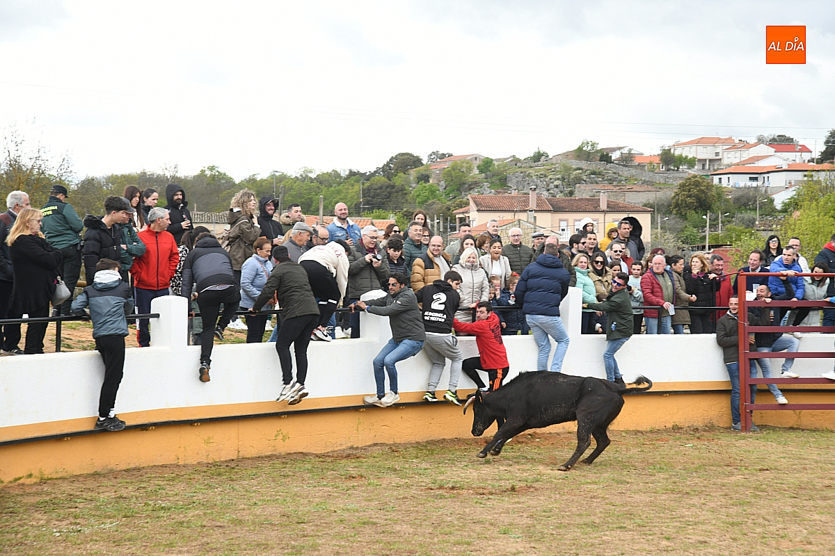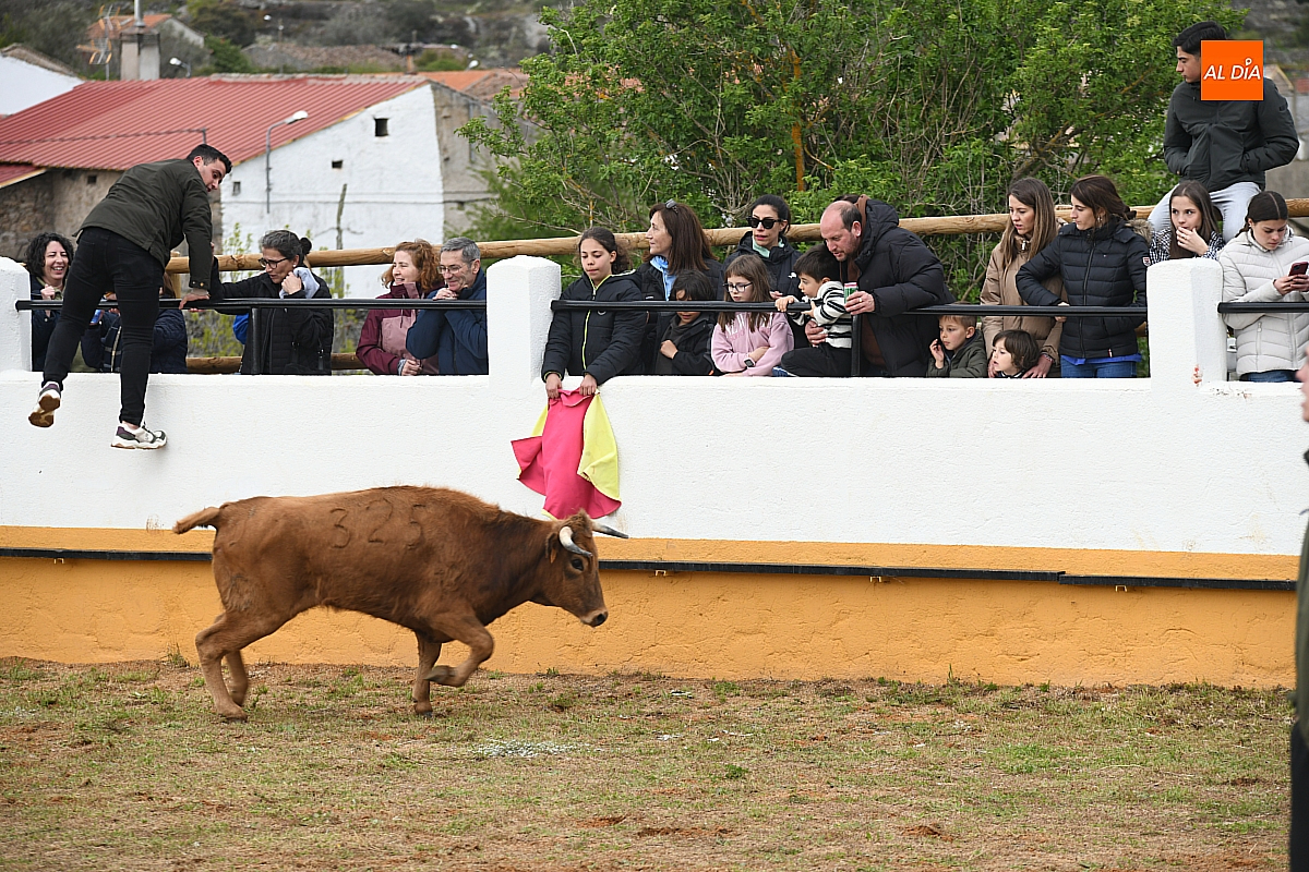 Durante la capea, jóvenes —y no tan jóvenes— disfrutaron de un ambiente animado en el que los más atrevidos demostraron su destreza ante las reses. Los más pequeños también tuvieron su espacio de diversión con carretones, fomentando así su afición al mundo taurino, tan arraigado en tierras salmantinas y portuguesas cercanas a La Raya.
