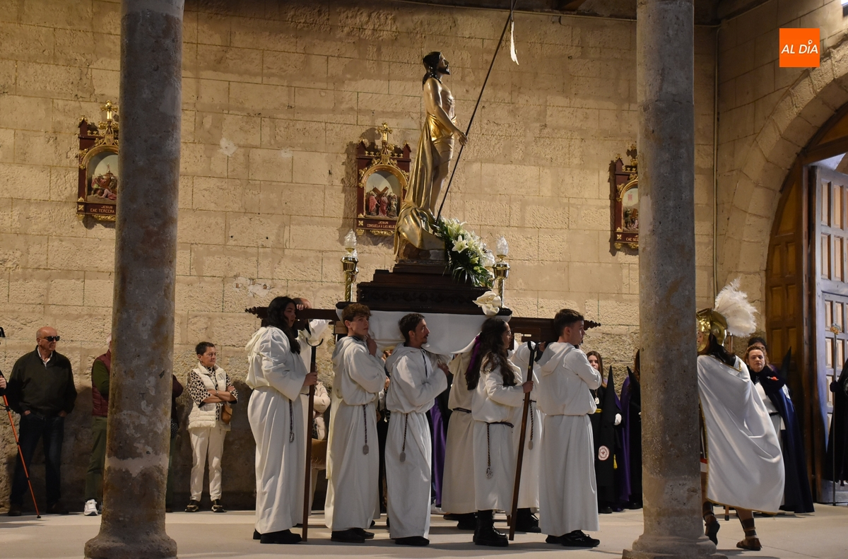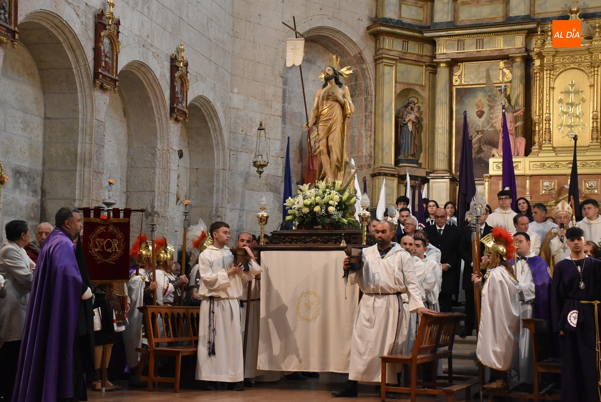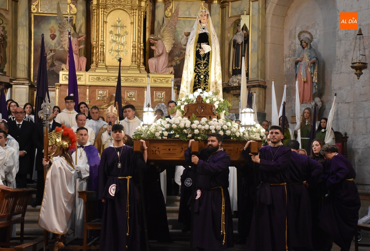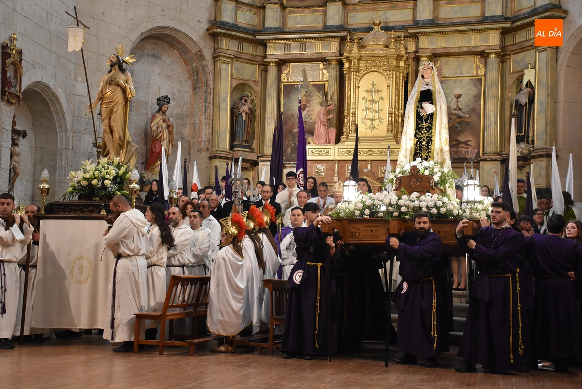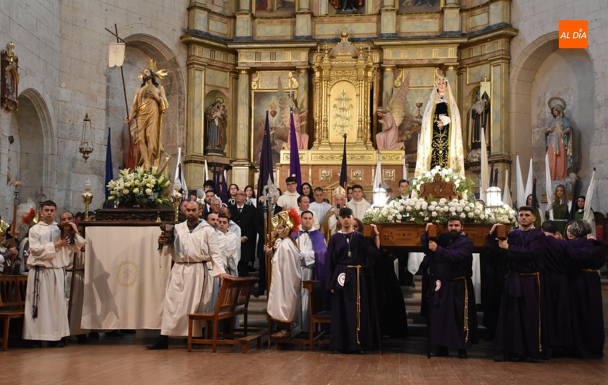Allí fue introducida en primer lugar la imagen de La Dolorosa, y a continuación la del Resucitado (que la había dejado pasar), colocándose ambas junto a las escaleras del altar de San Agustín, donde se fueron situando los participantes en la procesión que habían portado banderas, pertenecientes a las cofradías de Jesús Nazareno, La Oración del Huerto, Nuestra Señora de las Angustias y Nuestra Señora de La Soledad.