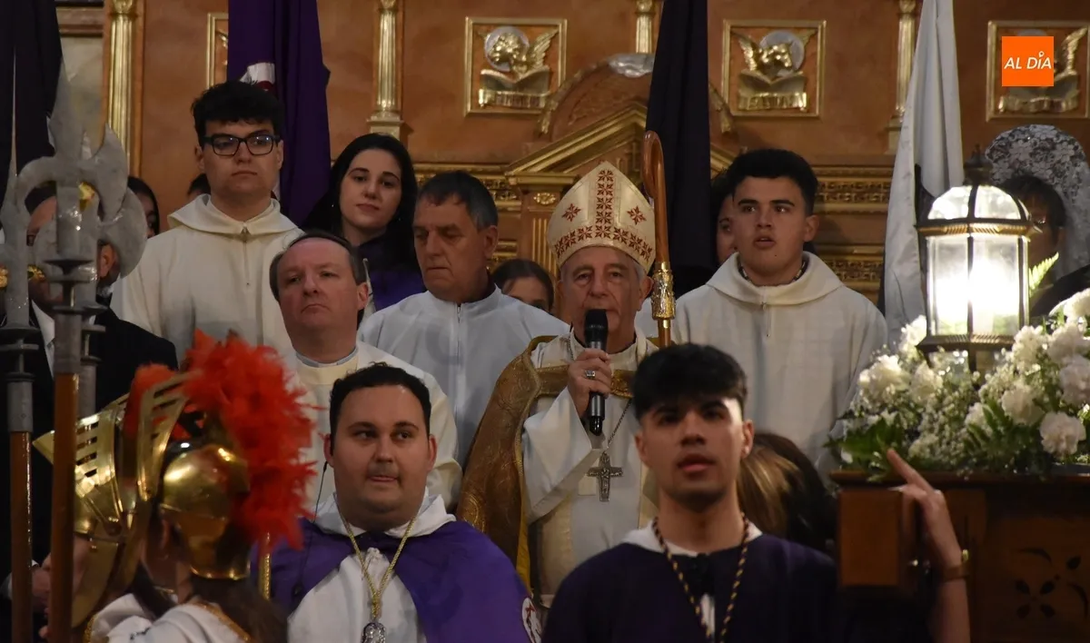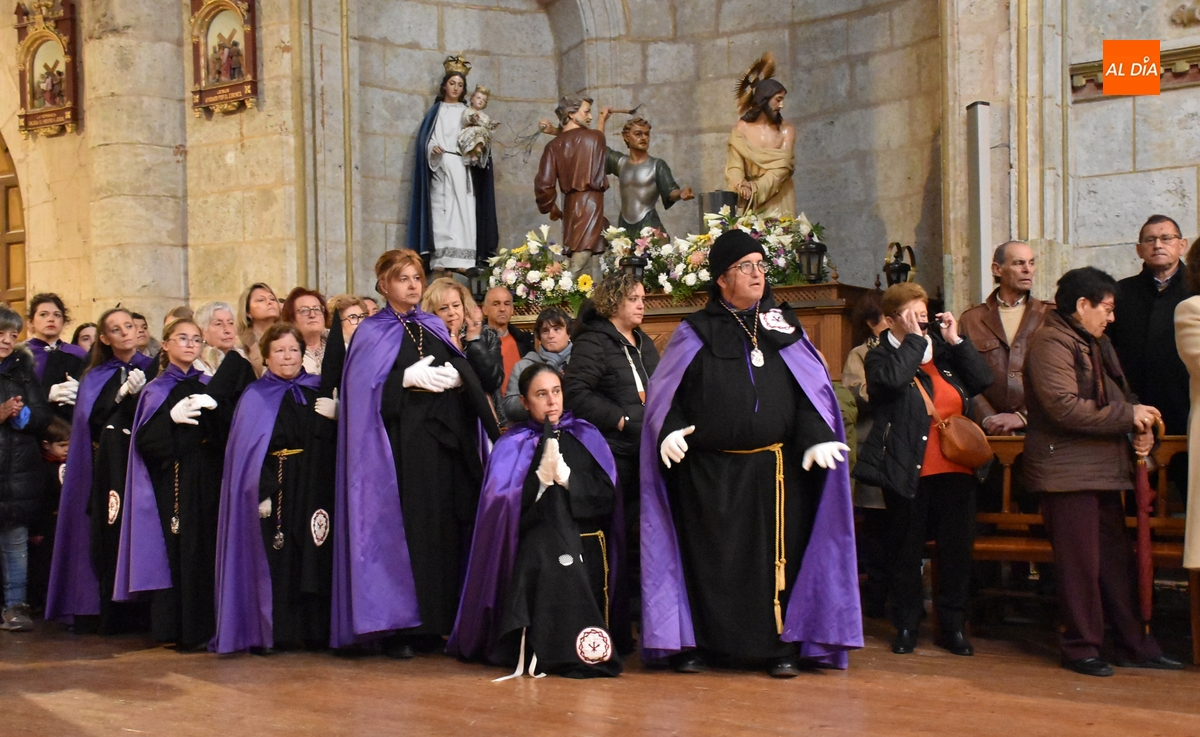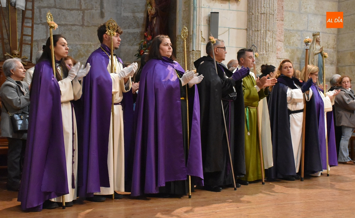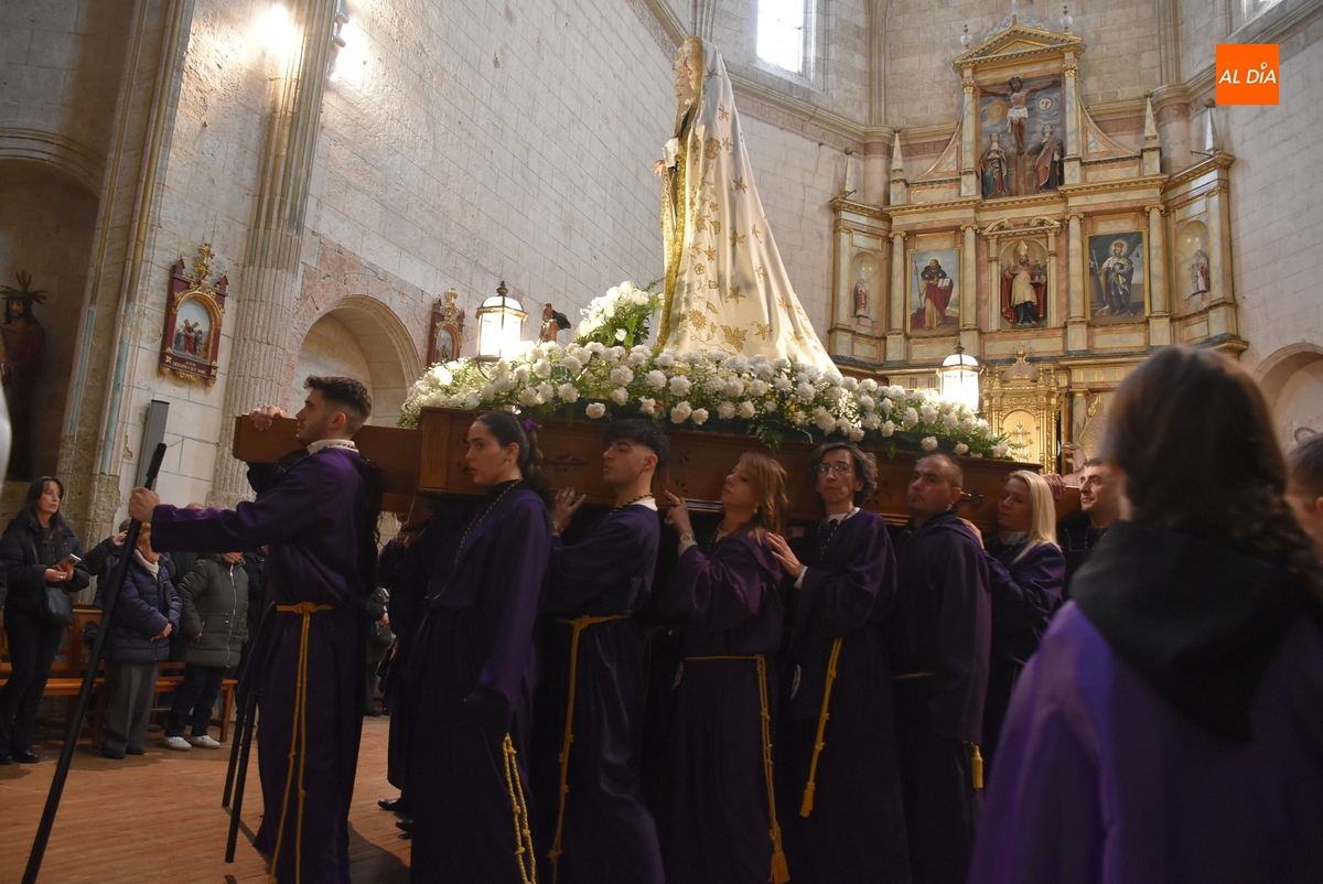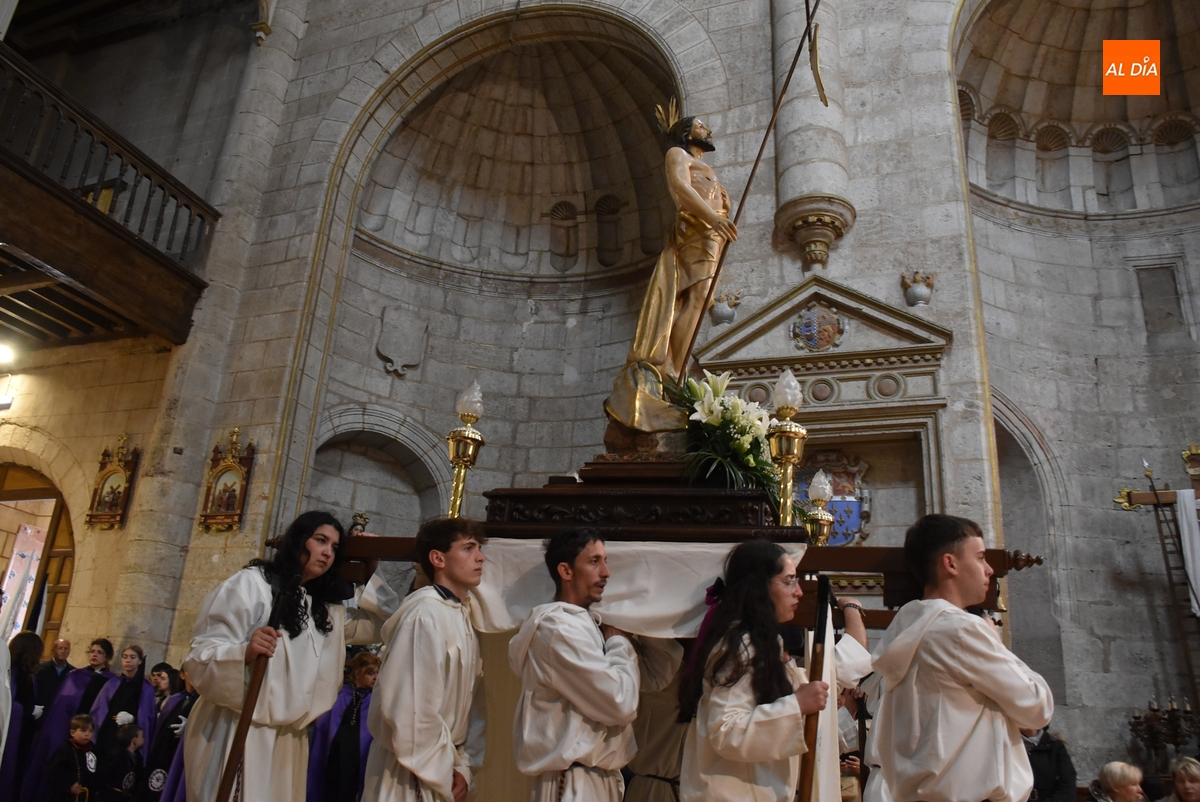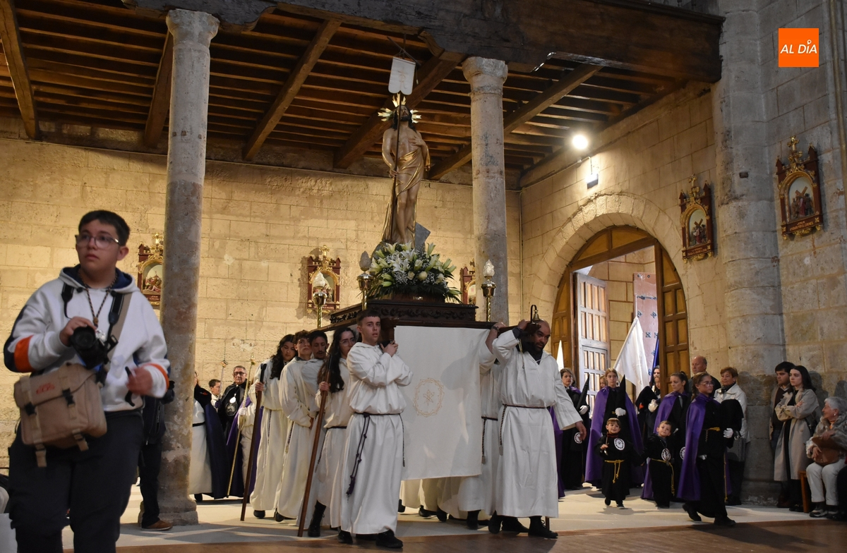 Allí fue introducida en primer lugar la imagen de La Dolorosa, y a continuación la del Resucitado (que la había dejado pasar), colocándose ambas junto a las escaleras del altar de San Agustín, donde se fueron situando los participantes en la procesión que habían portado banderas, pertenecientes a las cofradías de Jesús Nazareno, La Oración del Huerto, Nuestra Señora de las Angustias y Nuestra Señora de La Soledad.