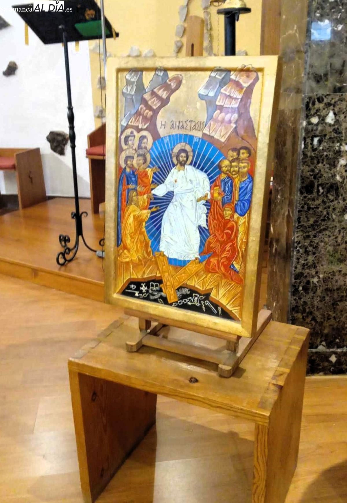Porque esta celebración de la Resurrección en la parroquia chiquita tiene mucho de confraternidad, de abrazo ecuménico. De alegría indudablemente, porque en las palabras de Tomás Gil, párroco de la Unidad Pastoral Cristo, Luz de los Pueblos, junto con Juan Andrés Martín, la resurrección es un motivo de gozo, primer día del año que se extiende una semana más, esa semana de Pascua llena de alegría que se inicia con un día de sol y una celebración compartida en la que se escucha la lectura en español por parte de uno de los participantes ucranianos y después, en un silencio emocionado, el mensaje, en su lengua que termina con la repetición de la frase que todos entienden: Khrystòs Voskres! a la que se contesta Voystinu Voskres! (Cristo ha resucitado / Verdaderamente ha resucitado).