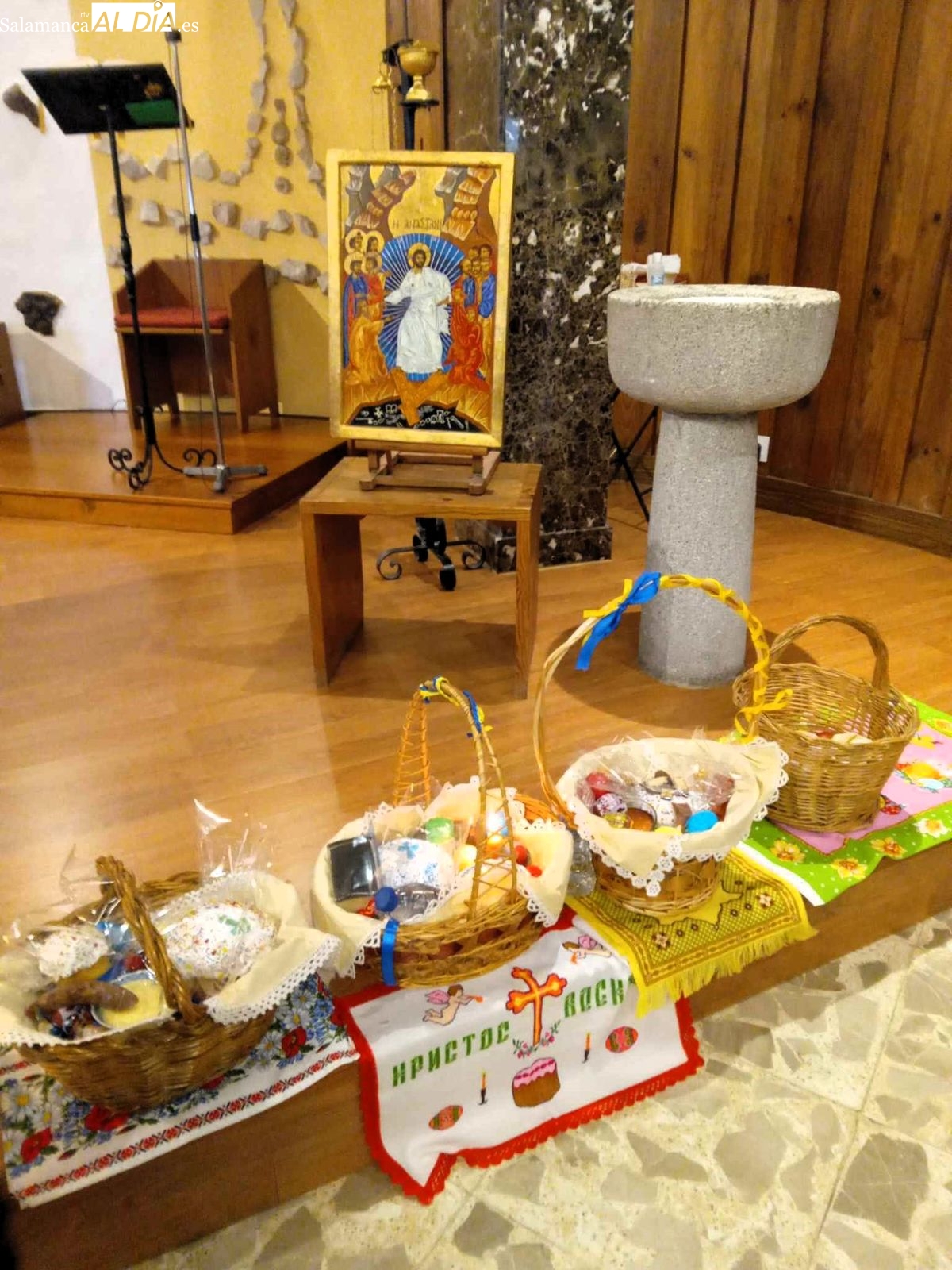 Tiene esta celebración conjunta alegría y nostalgia por la tierra abandonada. Tristeza por el dolor de una guerra que no cesa y por la que se pide el final. Una guerra que afecta no al poderoso, sino al hombre de la calle representado por un Cristo que resucita para llenar de alegría, de color y de cestas generosas la vida de los humildes. Y las velas y los huevos, símbolos del nacimiento y de la renovación ya en la iconografía religiosa más antigua, se convierten en elementos de fiesta para celebrar con la familia y las gentes el día más importante del calendario cristiano. Un calendario que en este domingo de resurrección, en la parroquia pequeña, tiene la grandeza del ecumenismo y un pequeño regalo en forma de icono.