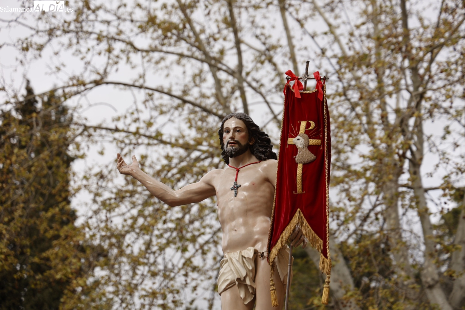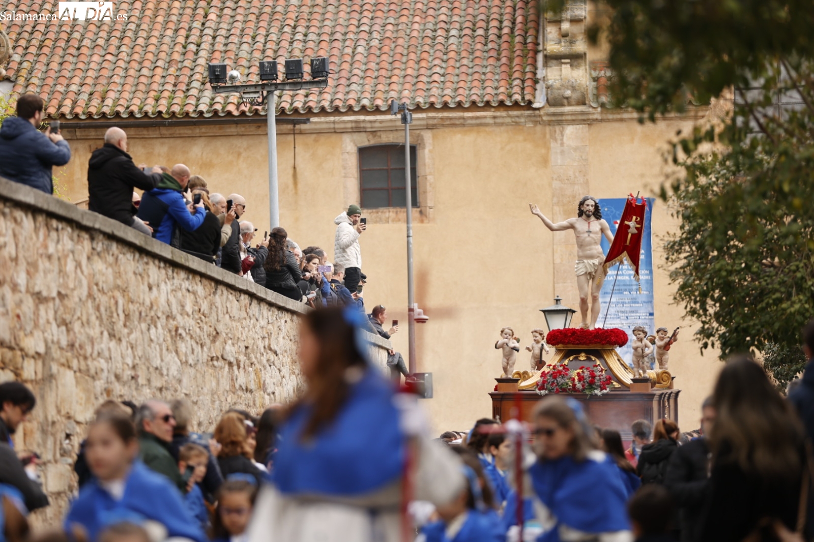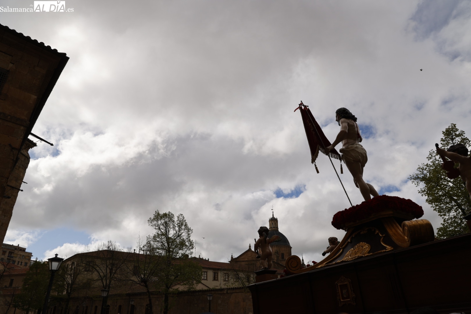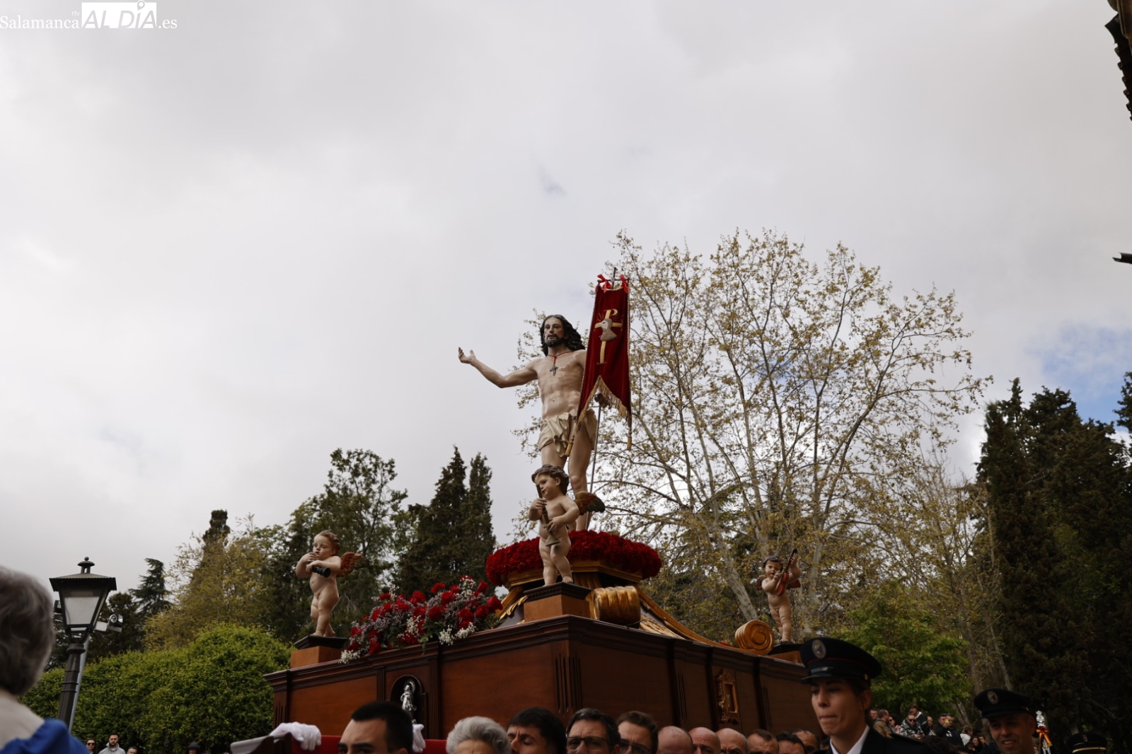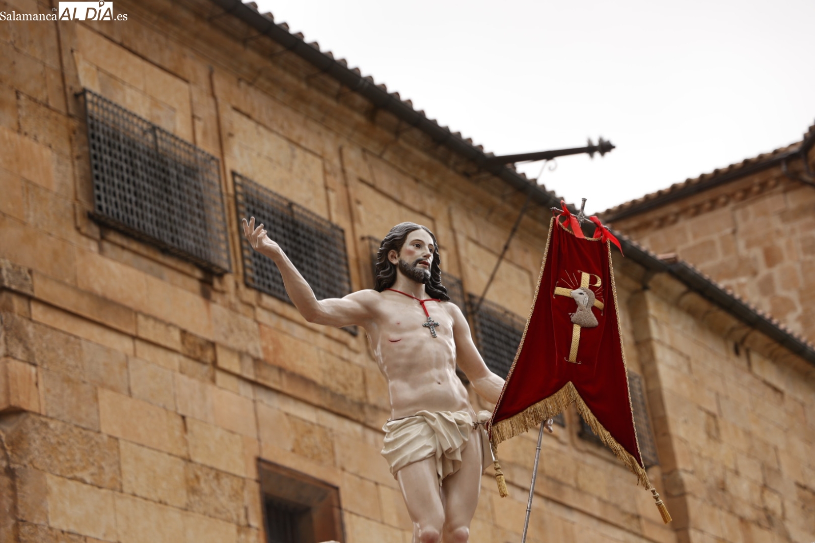 Salió el sol en Salamanca para no perderse la salida de Jesús Resucitado desde la capilla de la Vera Cruz a las diez y media de la mañana. A los sones de la Agrupación Musical María Santísima de la Estrella, la talla de Alejandro Carnicero procesionó hasta el atrio de la Catedral Nueva, donde se produjo el encuentro con la Virgen de la Alegría, que anteriormente procesionó por un recorrido diferente.