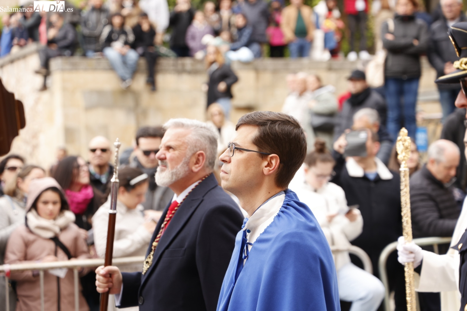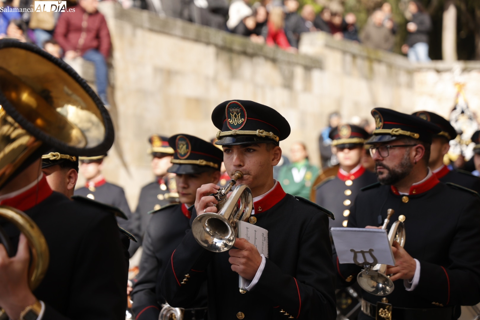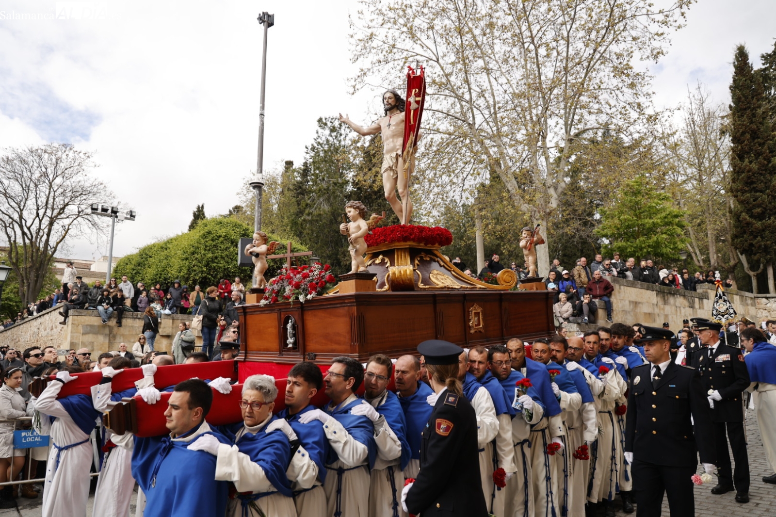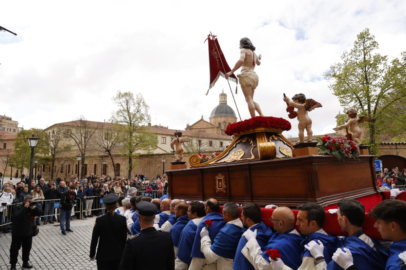 Salió el sol en Salamanca para no perderse la salida de Jesús Resucitado desde la capilla de la Vera Cruz a las diez y media de la mañana. A los sones de la Agrupación Musical María Santísima de la Estrella, la talla de Alejandro Carnicero procesionó hasta el atrio de la Catedral Nueva, donde se produjo el encuentro con la Virgen de la Alegría, que anteriormente procesionó por un recorrido diferente.