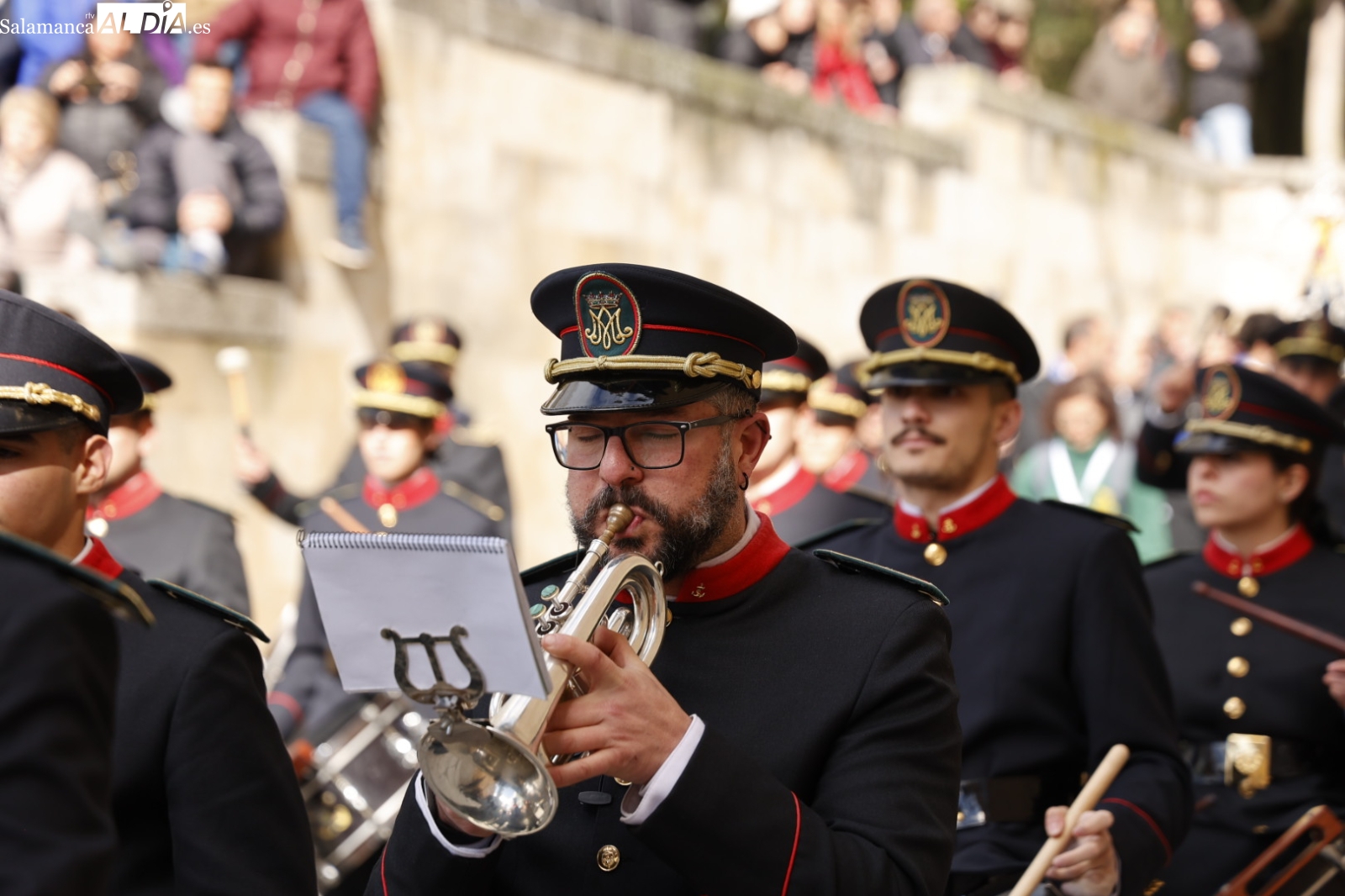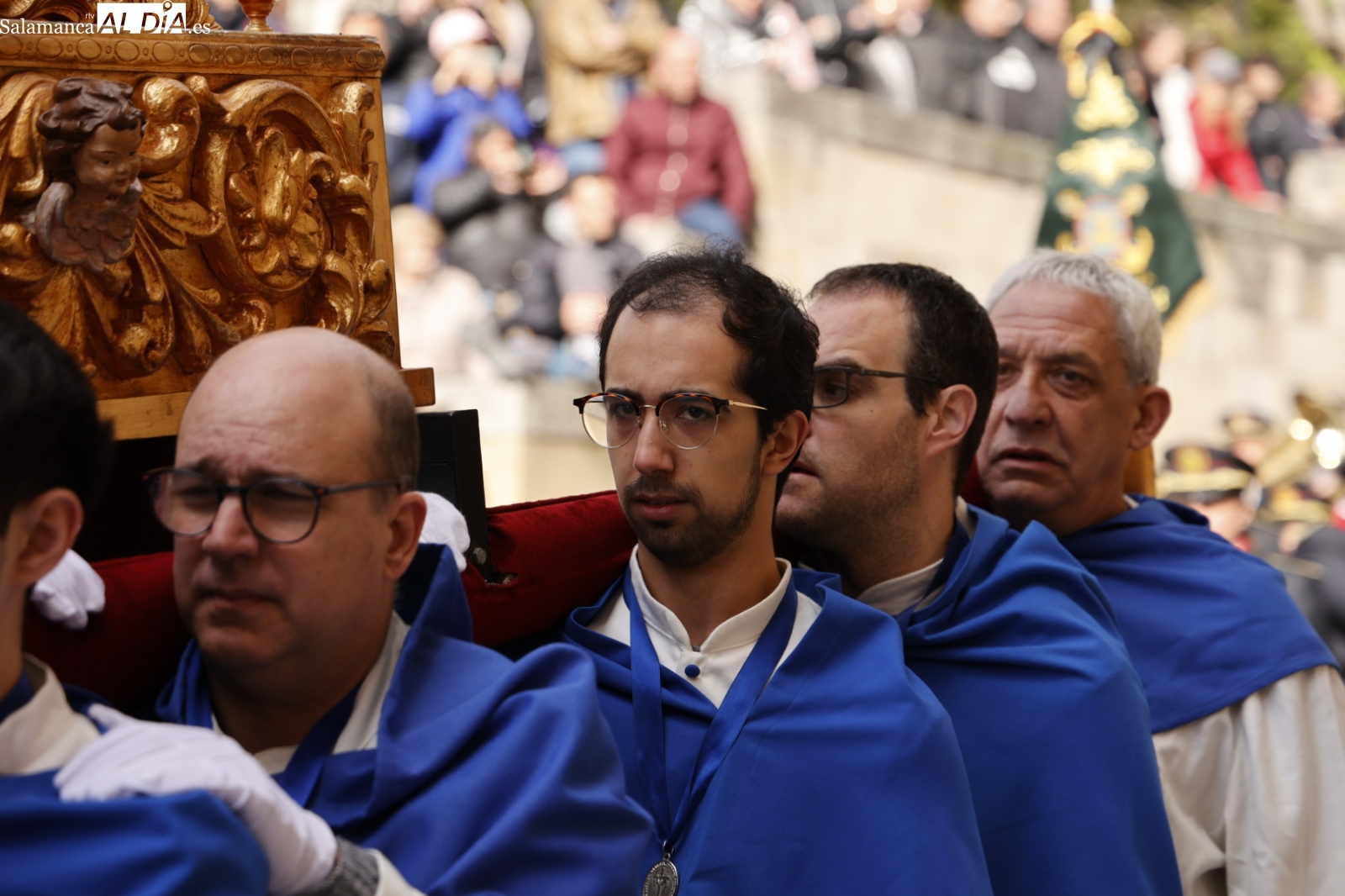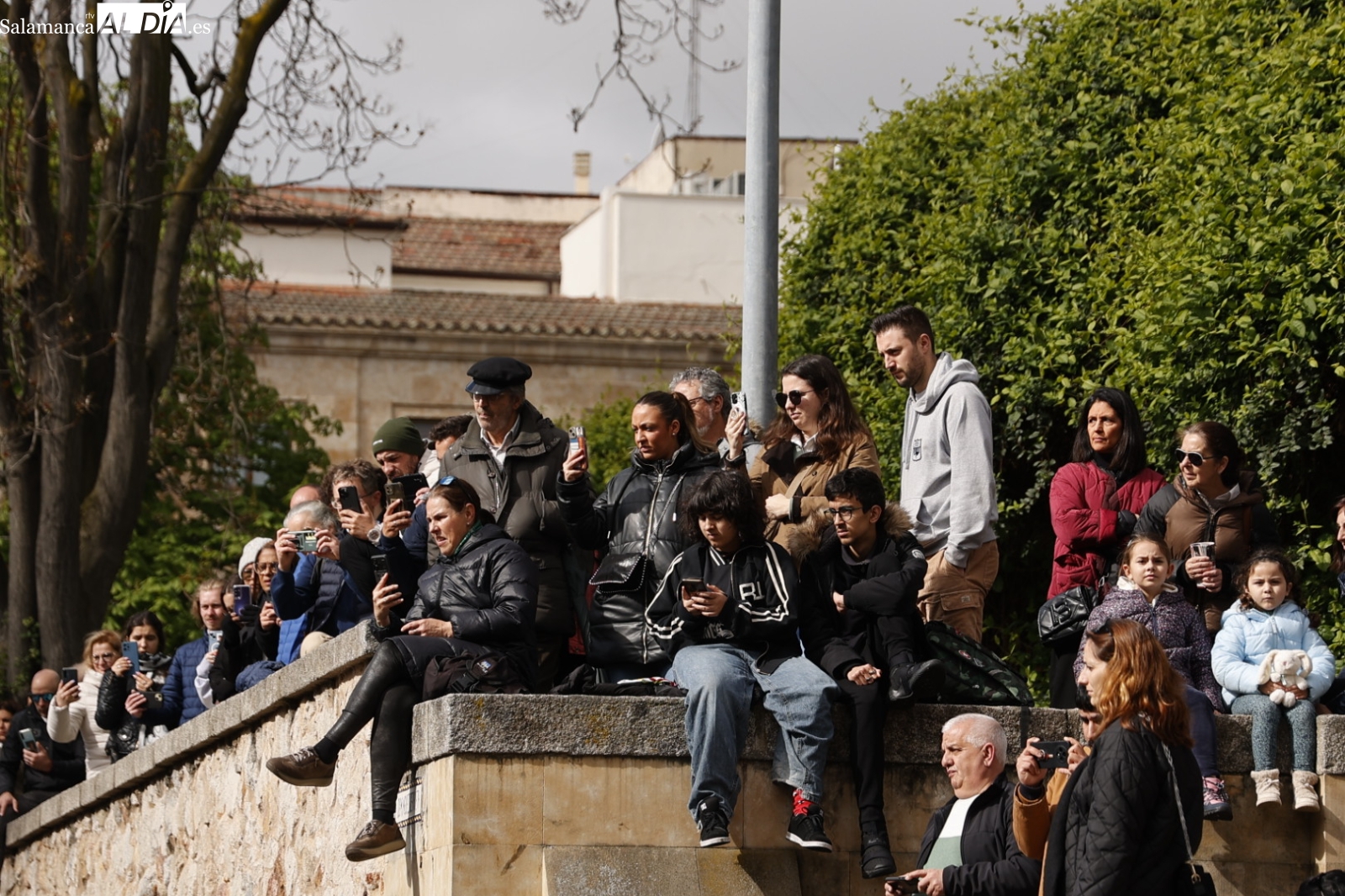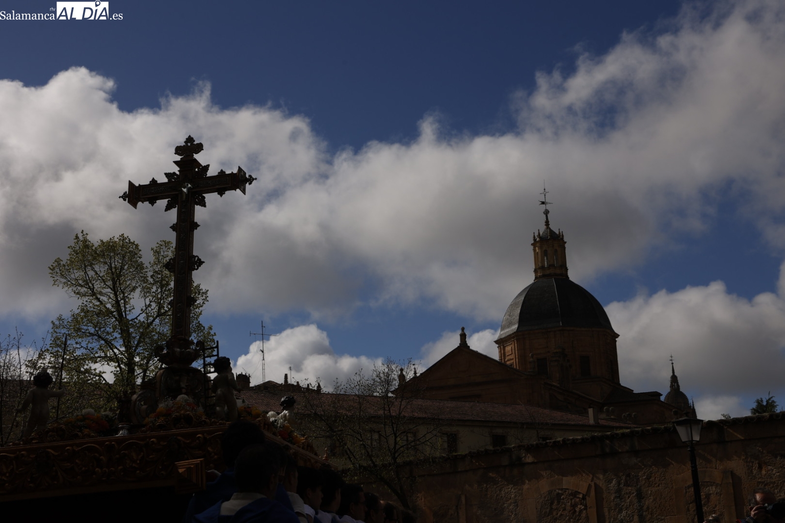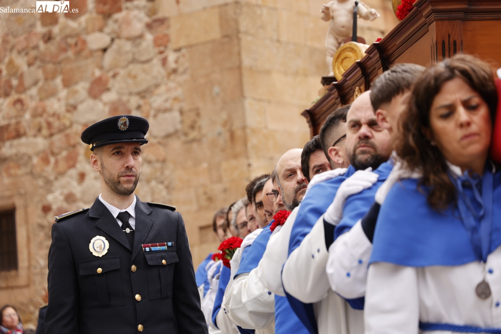 Salió el sol en Salamanca para no perderse la salida de Jesús Resucitado desde la capilla de la Vera Cruz a las diez y media de la mañana. A los sones de la Agrupación Musical María Santísima de la Estrella, la talla de Alejandro Carnicero procesionó hasta el atrio de la Catedral Nueva, donde se produjo el encuentro con la Virgen de la Alegría, que anteriormente procesionó por un recorrido diferente.