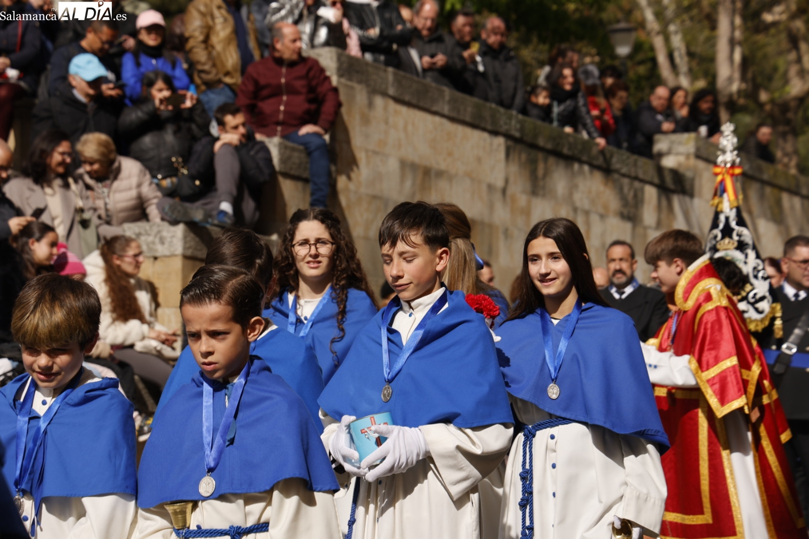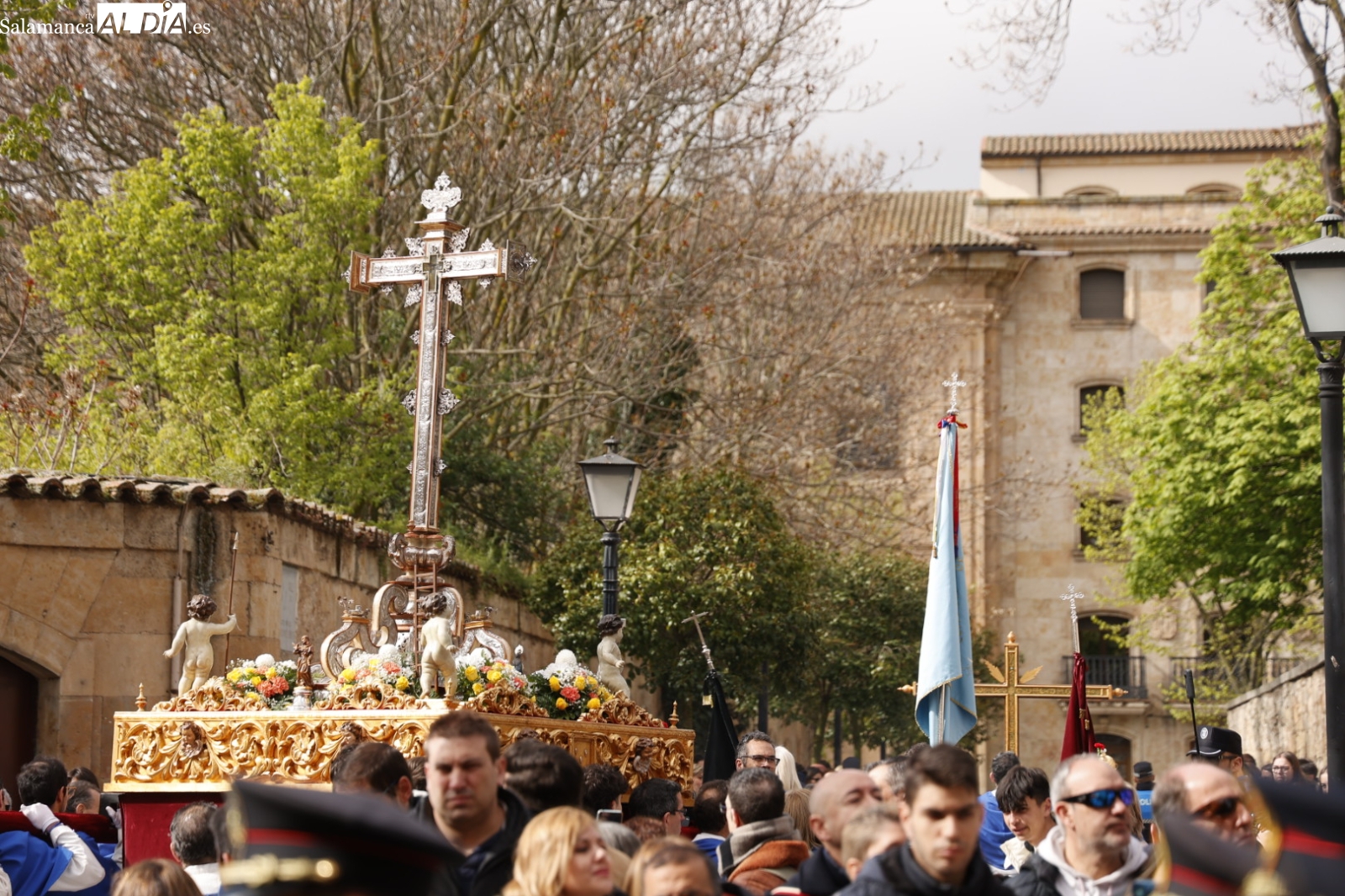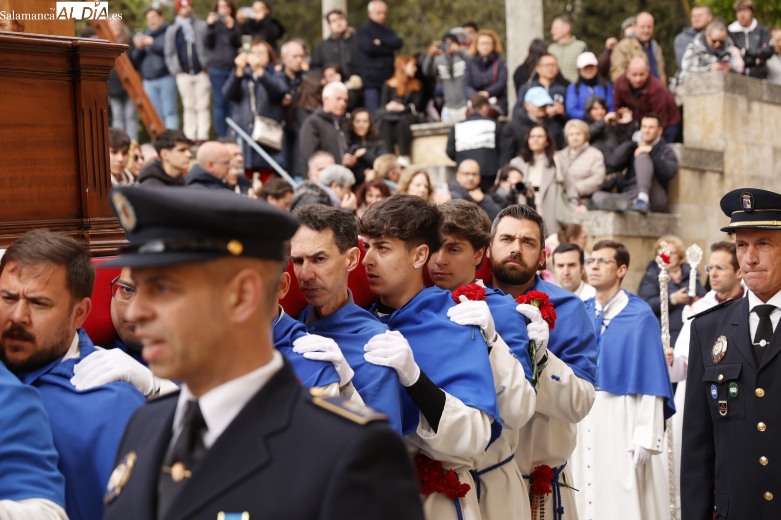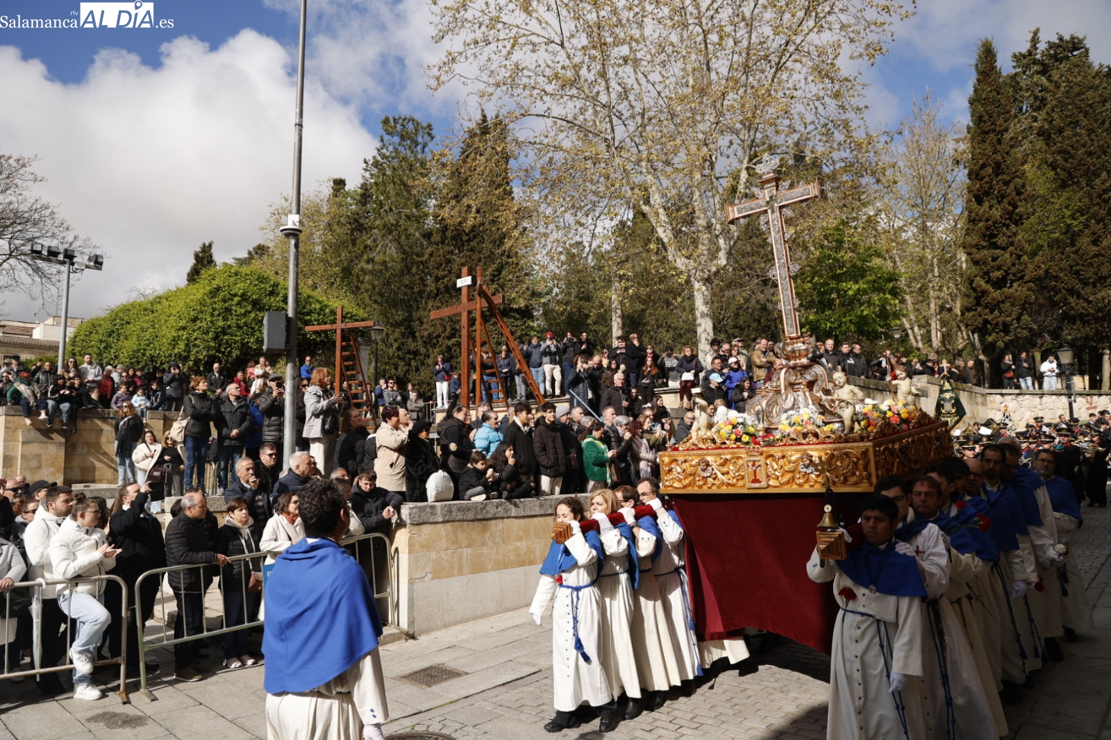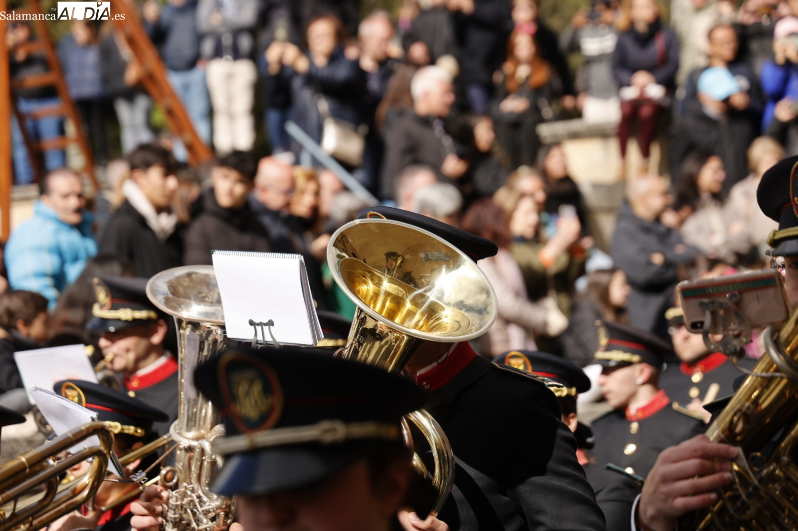 Salió el sol en Salamanca para no perderse la salida de Jesús Resucitado desde la capilla de la Vera Cruz a las diez y media de la mañana. A los sones de la Agrupación Musical María Santísima de la Estrella, la talla de Alejandro Carnicero procesionó hasta el atrio de la Catedral Nueva, donde se produjo el encuentro con la Virgen de la Alegría, que anteriormente procesionó por un recorrido diferente.