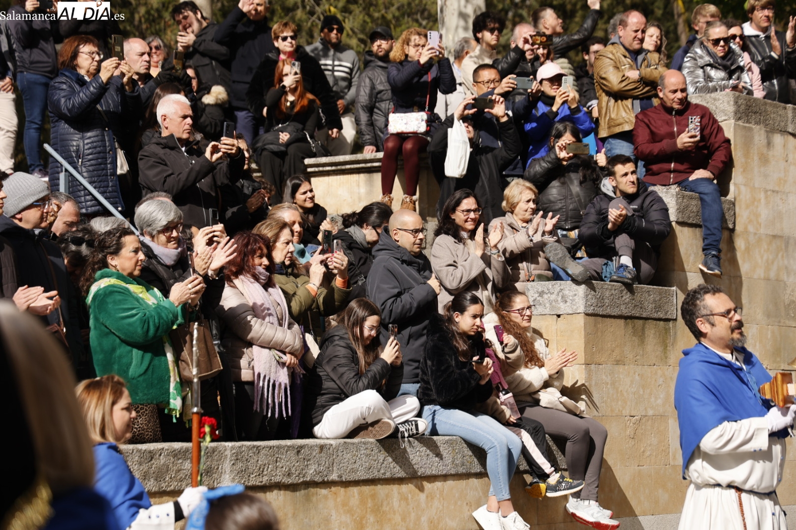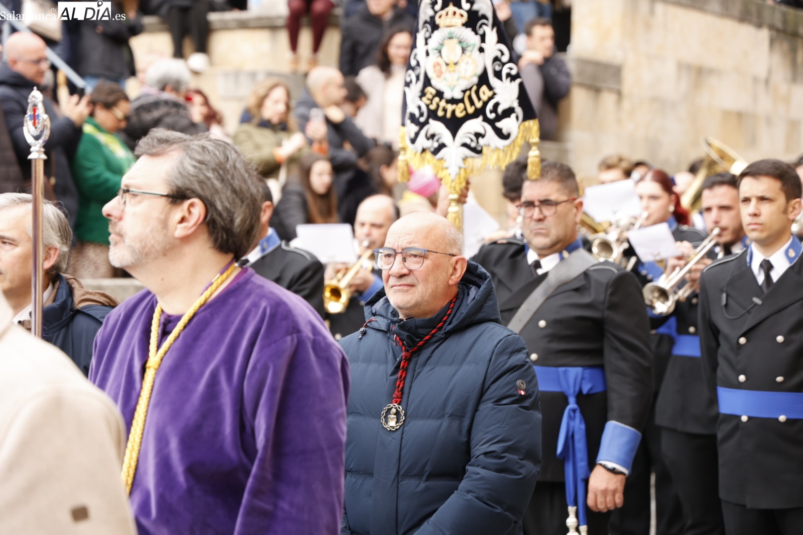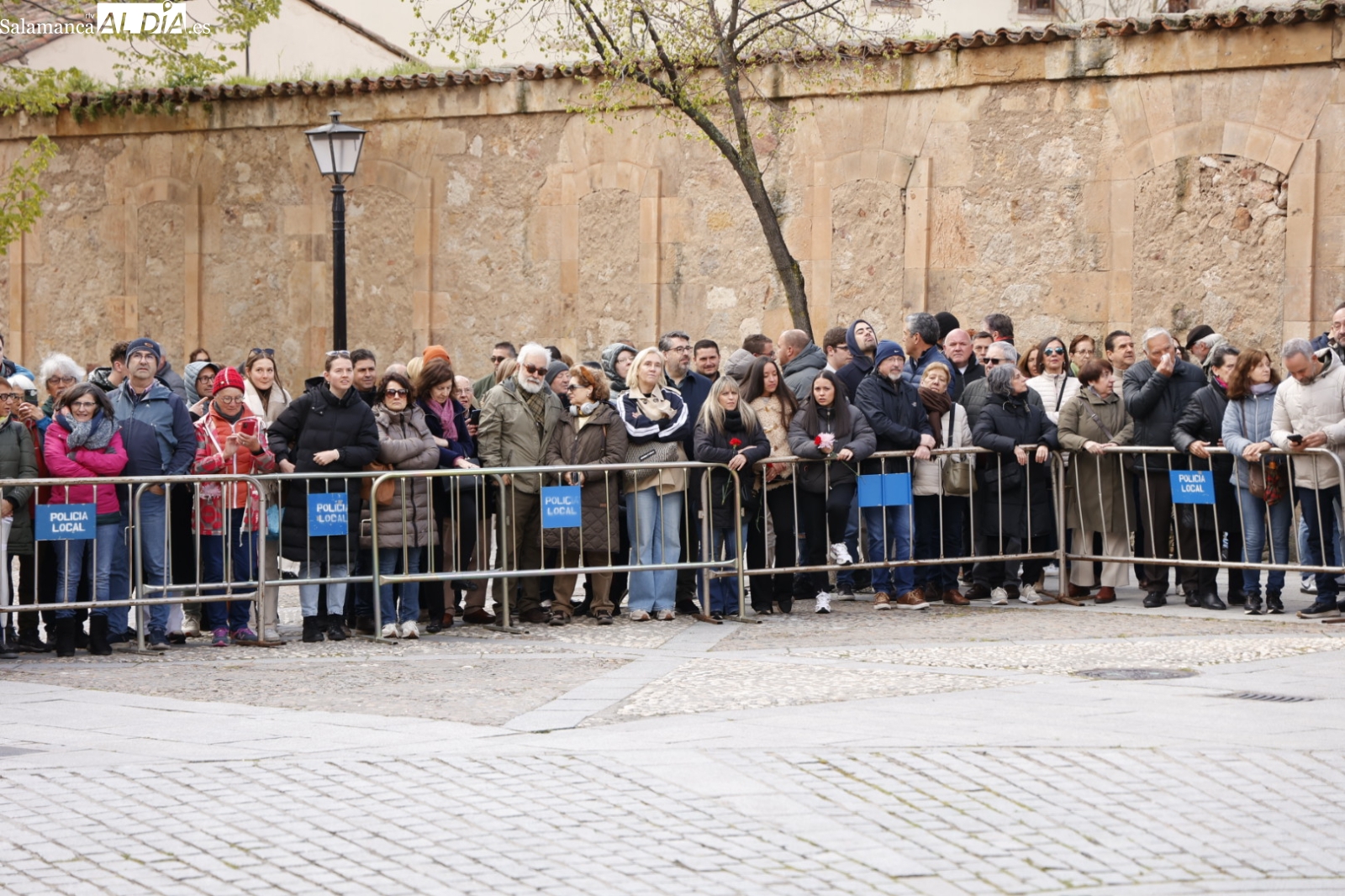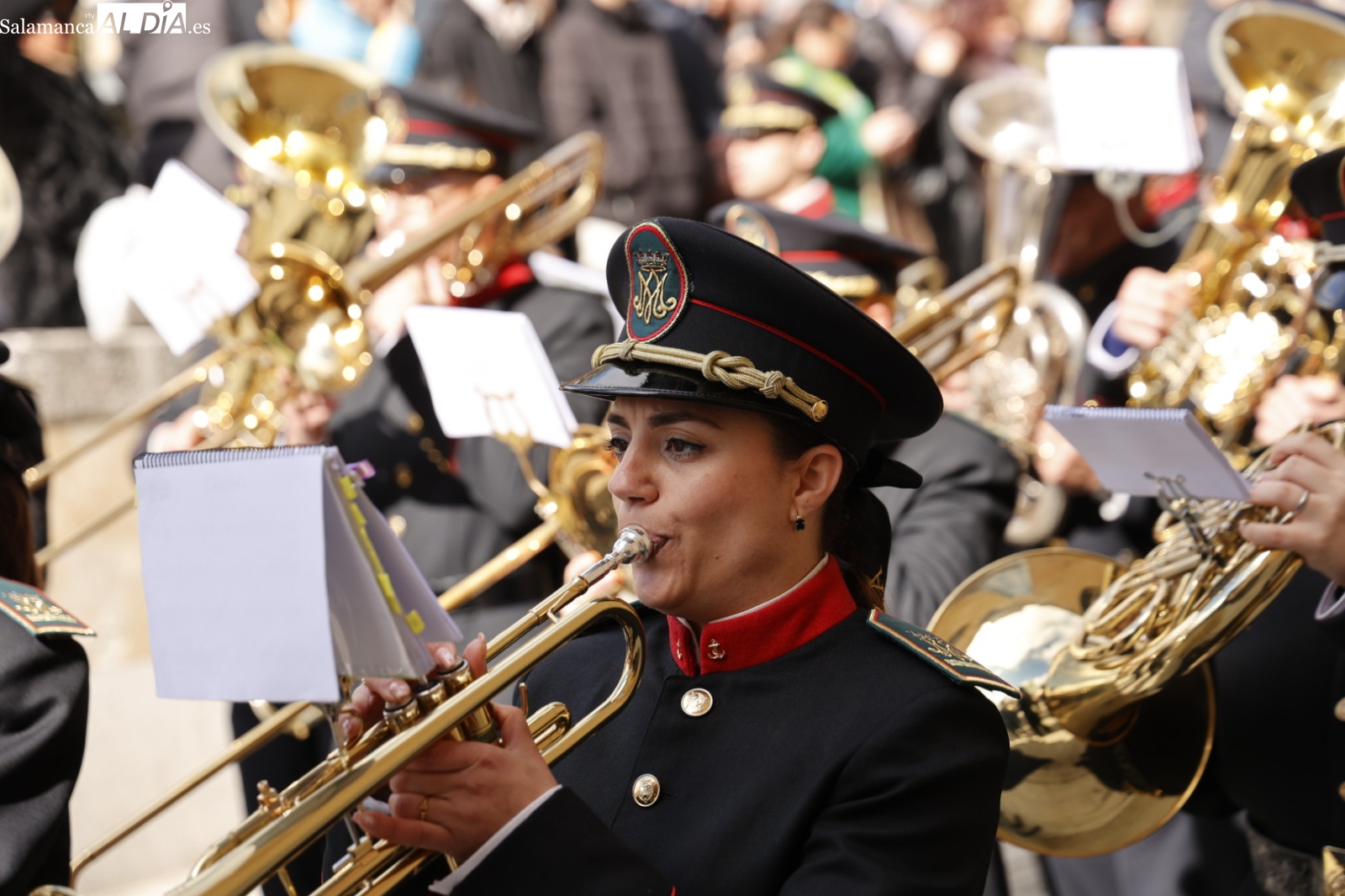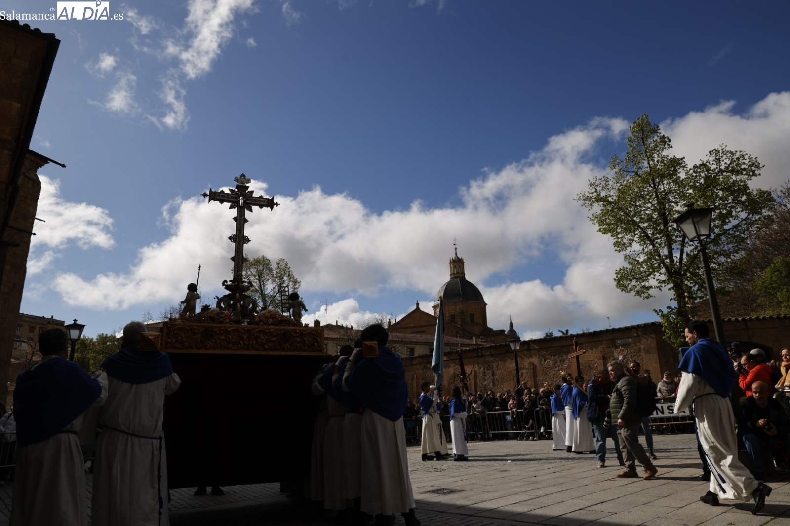 Salió el sol en Salamanca para no perderse la salida de Jesús Resucitado desde la capilla de la Vera Cruz a las diez y media de la mañana. A los sones de la Agrupación Musical María Santísima de la Estrella, la talla de Alejandro Carnicero procesionó hasta el atrio de la Catedral Nueva, donde se produjo el encuentro con la Virgen de la Alegría, que anteriormente procesionó por un recorrido diferente.