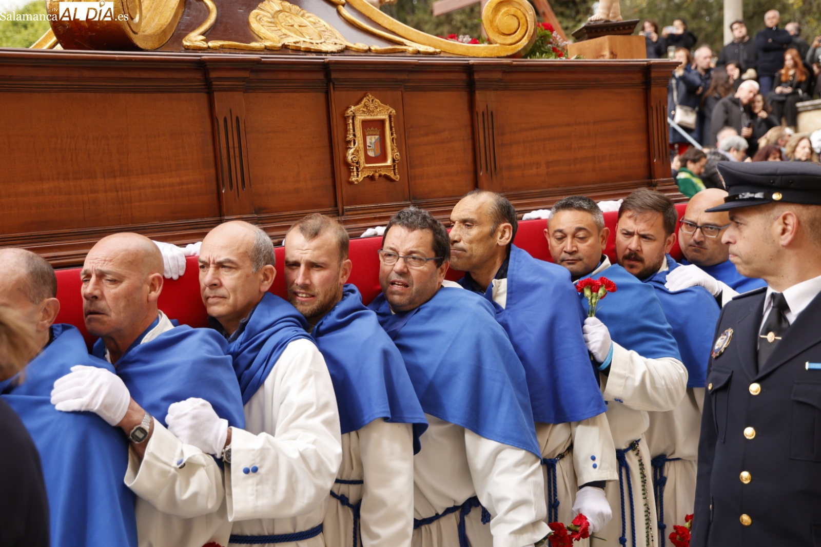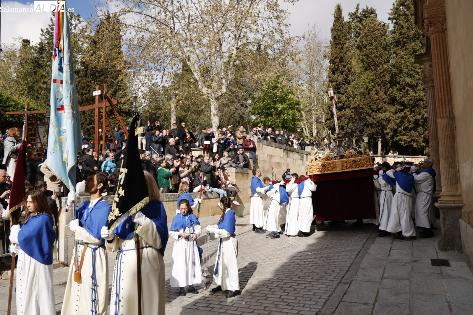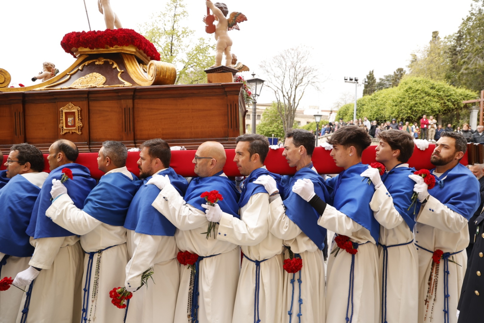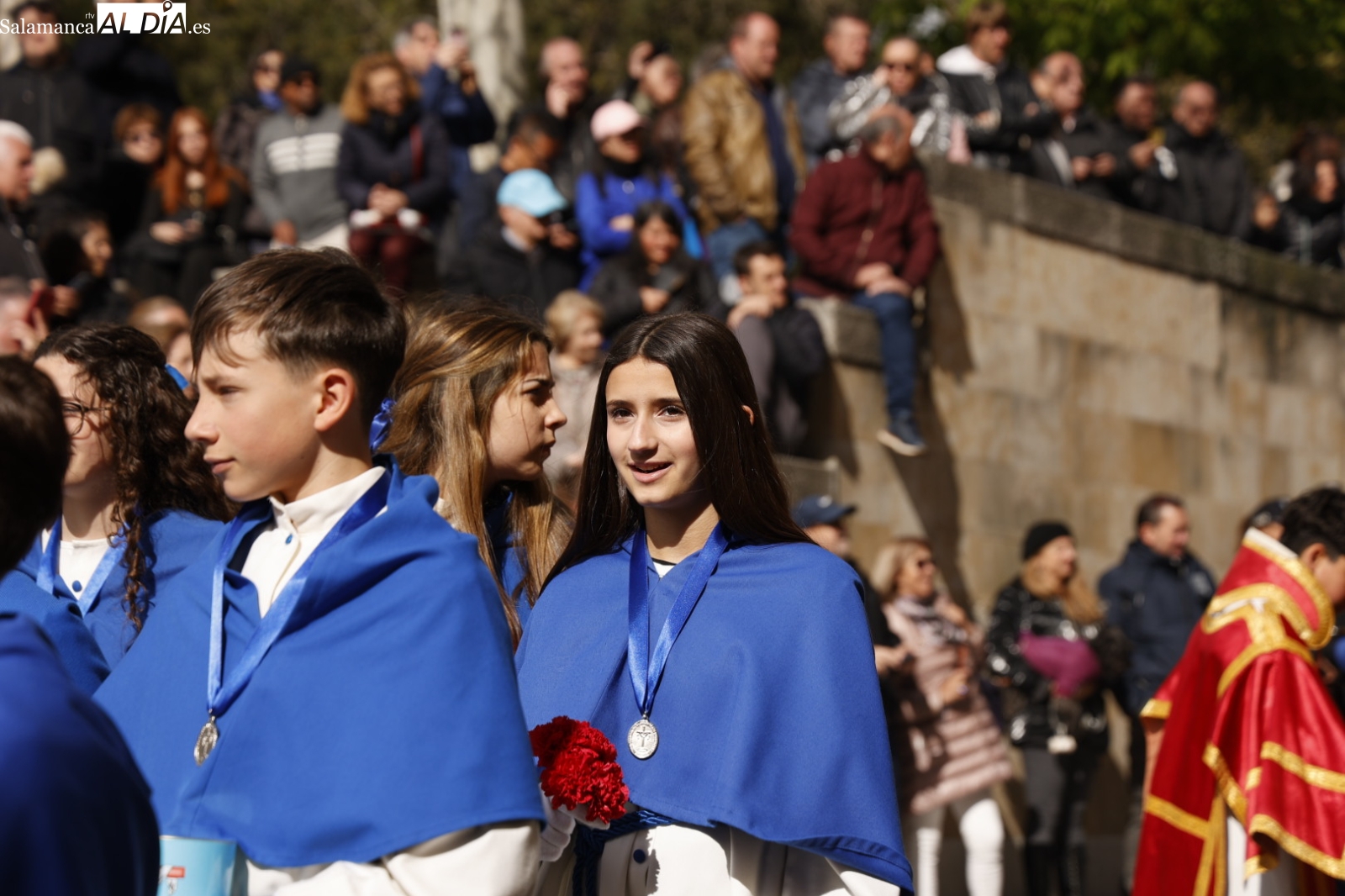 Salió el sol en Salamanca para no perderse la salida de Jesús Resucitado desde la capilla de la Vera Cruz a las diez y media de la mañana. A los sones de la Agrupación Musical María Santísima de la Estrella, la talla de Alejandro Carnicero procesionó hasta el atrio de la Catedral Nueva, donde se produjo el encuentro con la Virgen de la Alegría, que anteriormente procesionó por un recorrido diferente.