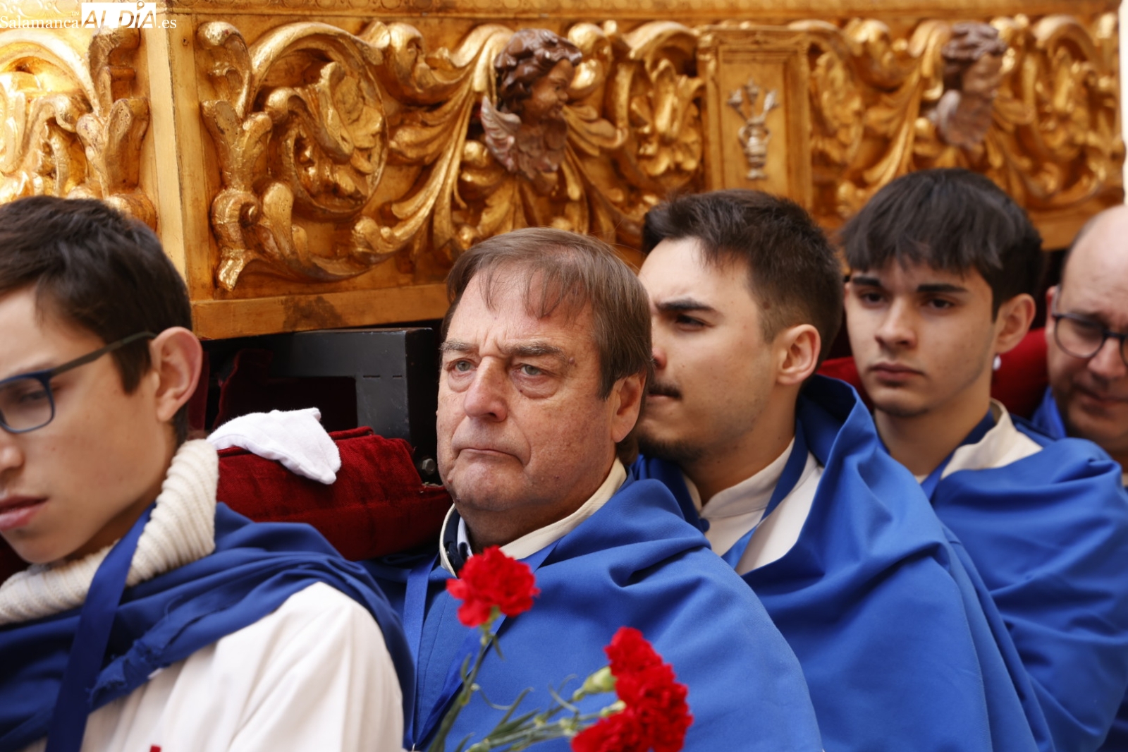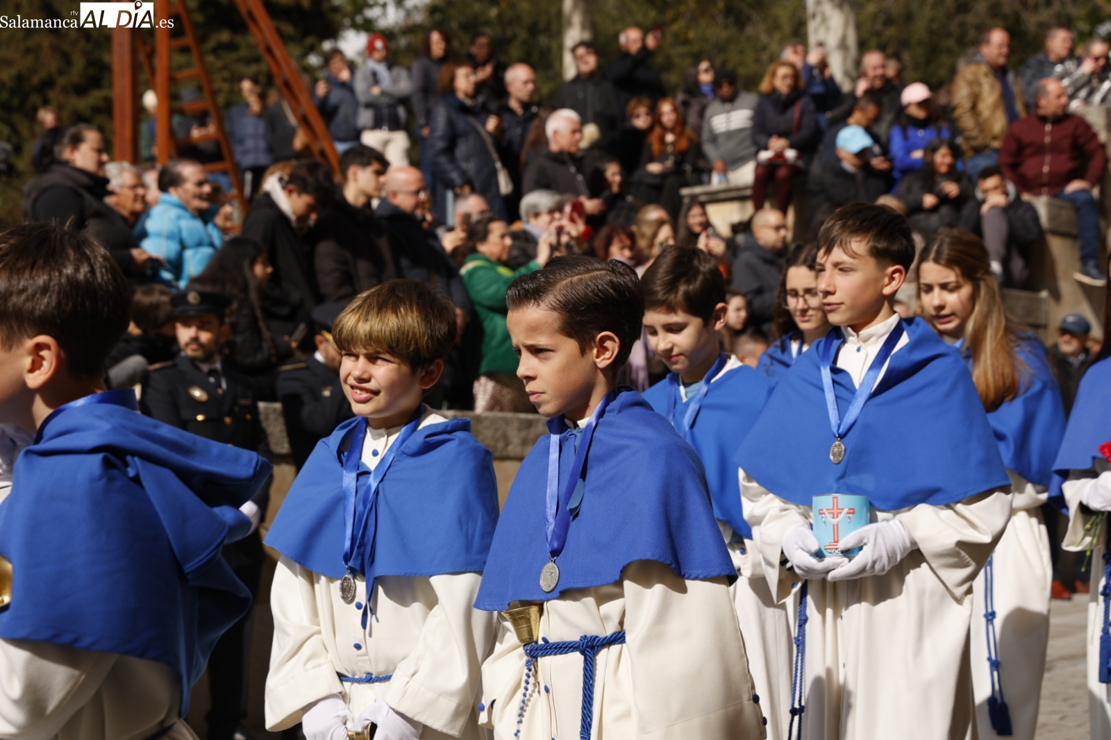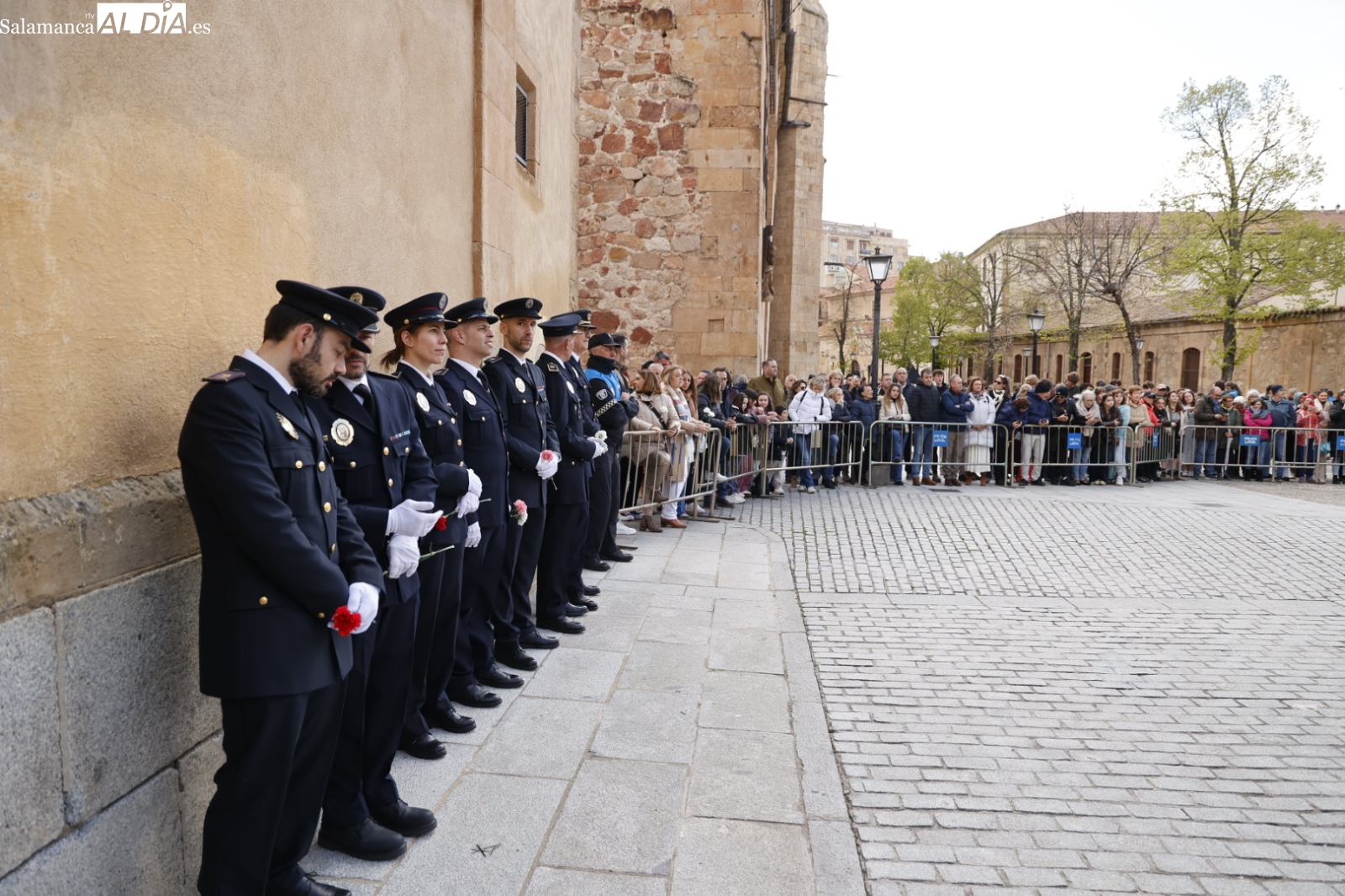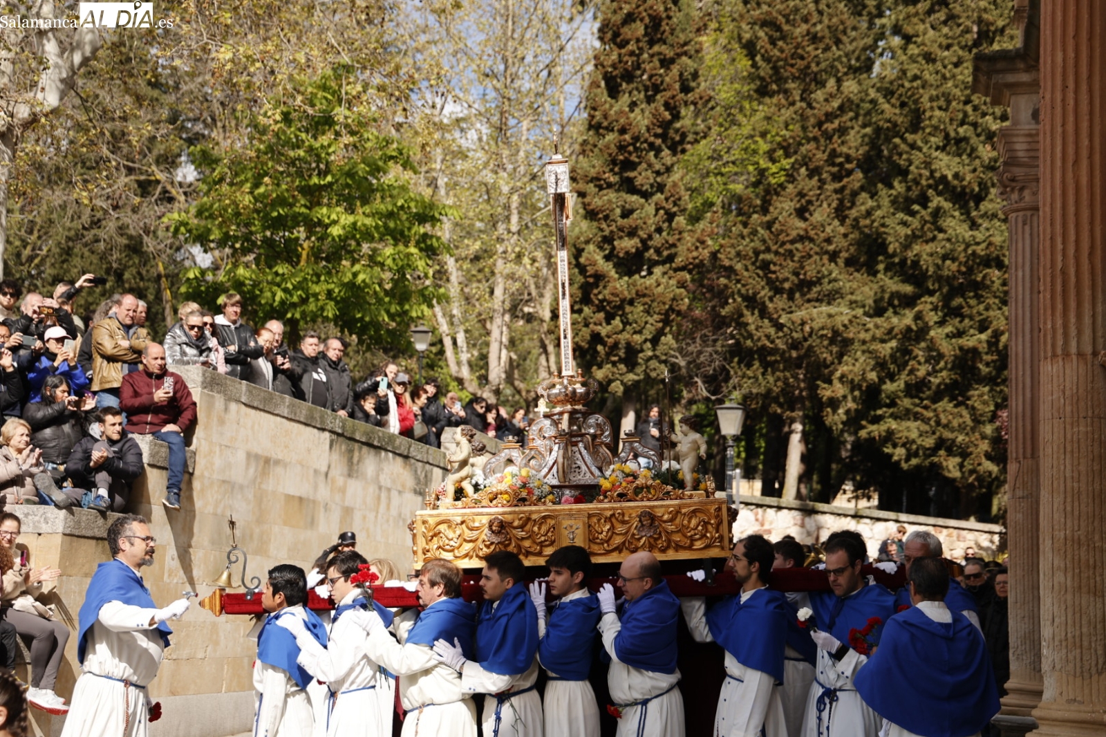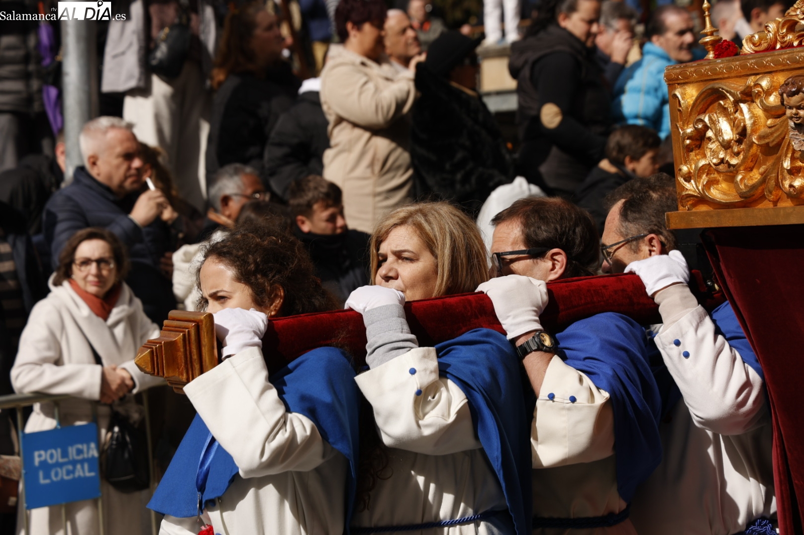 Salió el sol en Salamanca para no perderse la salida de Jesús Resucitado desde la capilla de la Vera Cruz a las diez y media de la mañana. A los sones de la Agrupación Musical María Santísima de la Estrella, la talla de Alejandro Carnicero procesionó hasta el atrio de la Catedral Nueva, donde se produjo el encuentro con la Virgen de la Alegría, que anteriormente procesionó por un recorrido diferente.