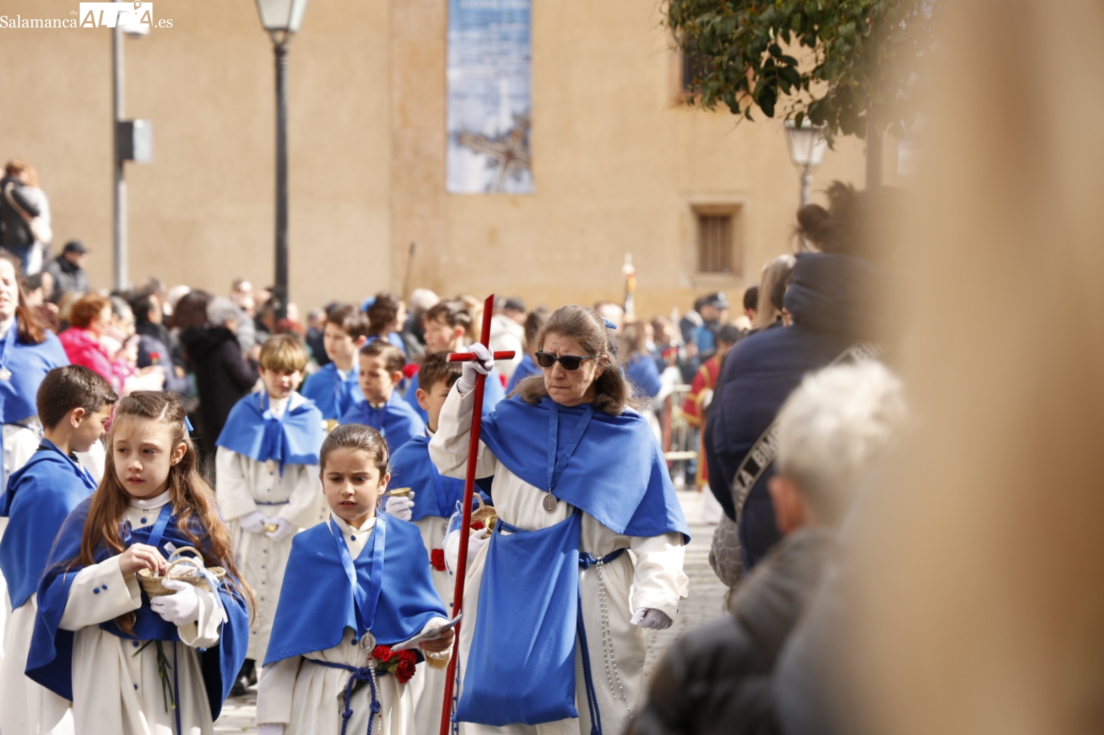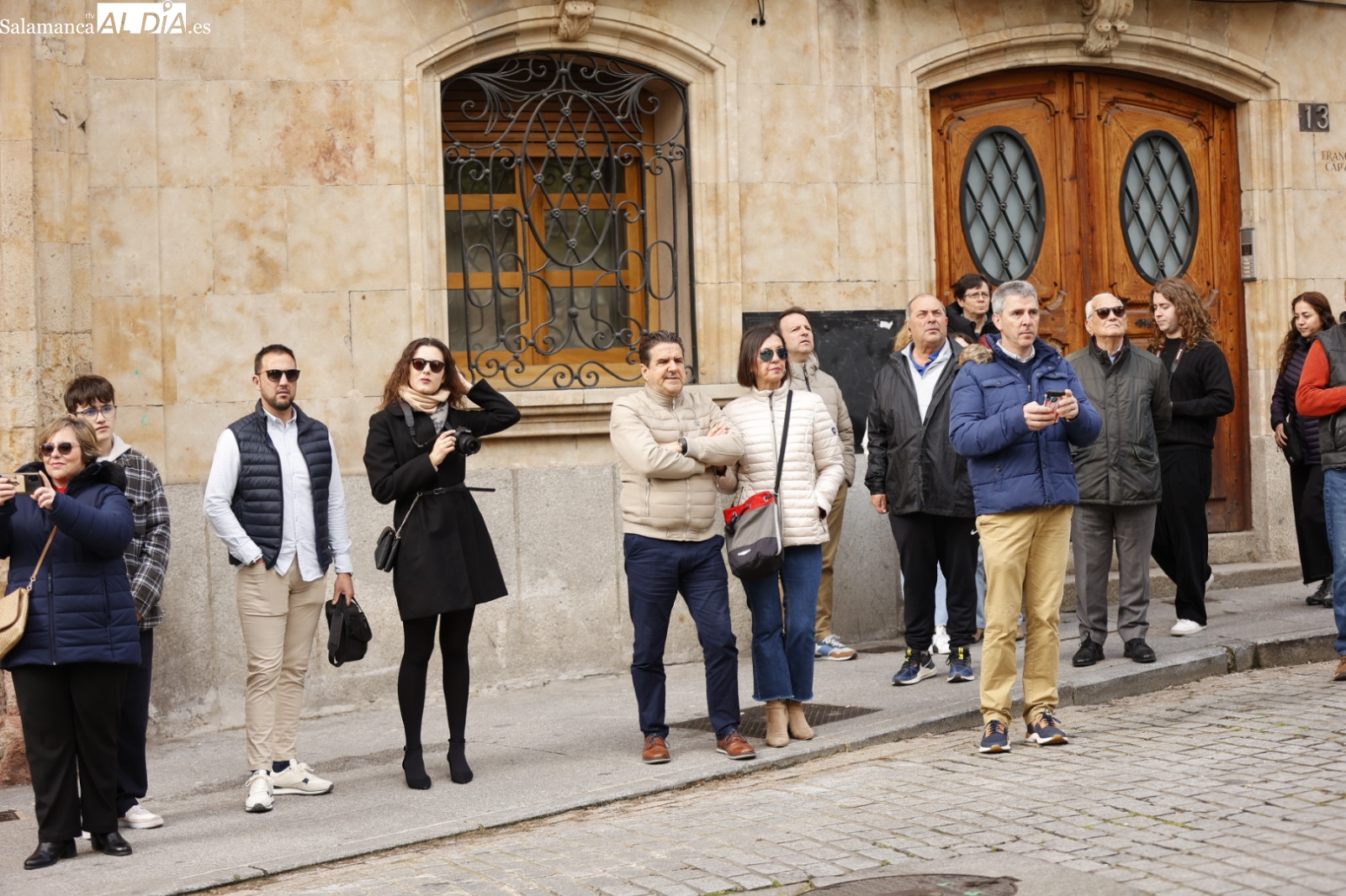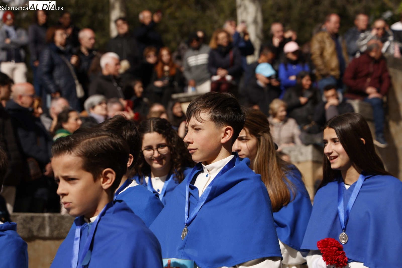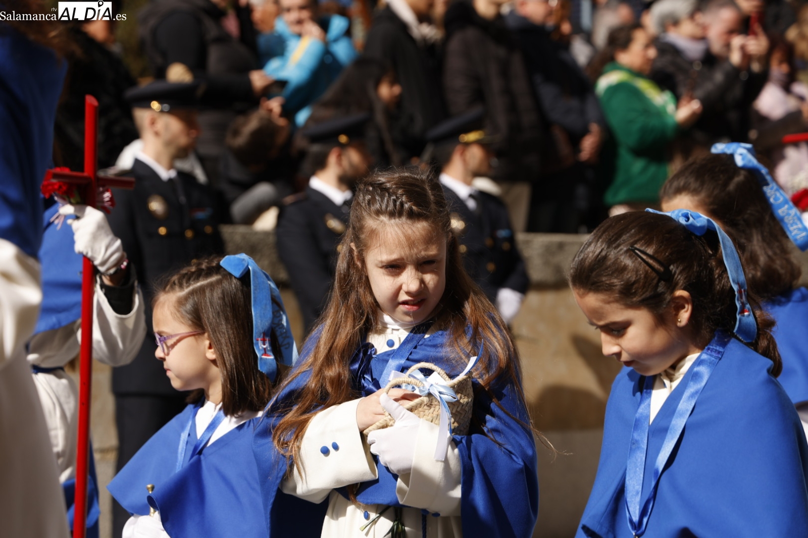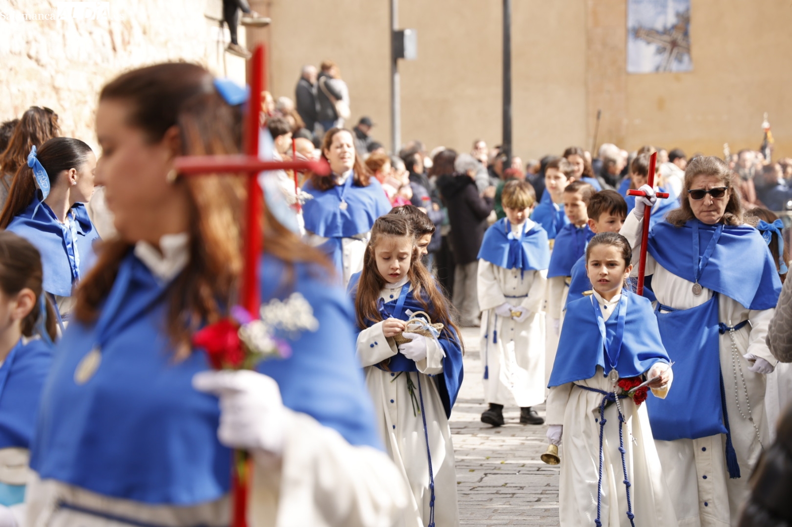 Salió el sol en Salamanca para no perderse la salida de Jesús Resucitado desde la capilla de la Vera Cruz a las diez y media de la mañana. A los sones de la Agrupación Musical María Santísima de la Estrella, la talla de Alejandro Carnicero procesionó hasta el atrio de la Catedral Nueva, donde se produjo el encuentro con la Virgen de la Alegría, que anteriormente procesionó por un recorrido diferente.