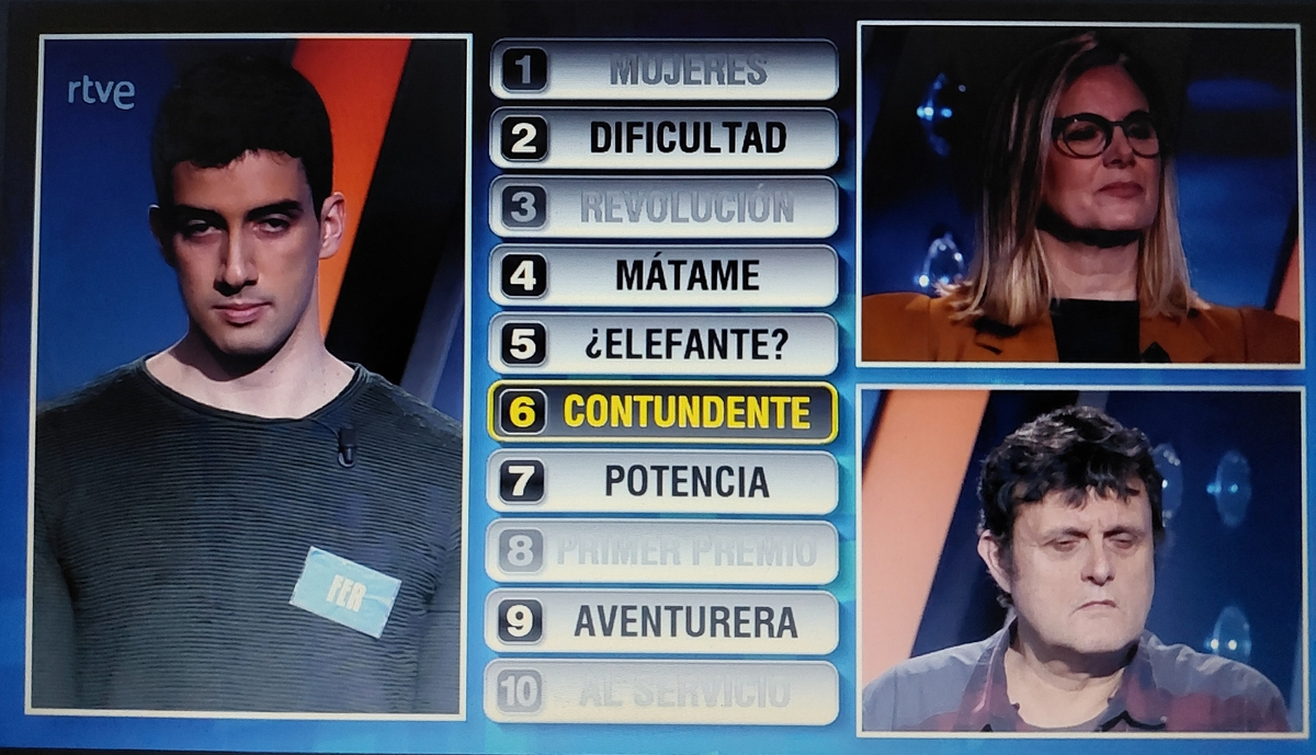 Detrás de la palabra ‘Contundente’, y tras añadir Jordi Hurtado ‘contundente embutido salmantino’, se escondía el enunciado “El farinato es un embutido con apariencia de chorizo que comparte con éste ingredientes como el pimentón, el ajo o la manteca de cerdo, pero a diferencia de éste, en vez de carne, lleva miga de pan y anís”, preguntándose ‘¿De qué ciudad salmantina es originario?’.