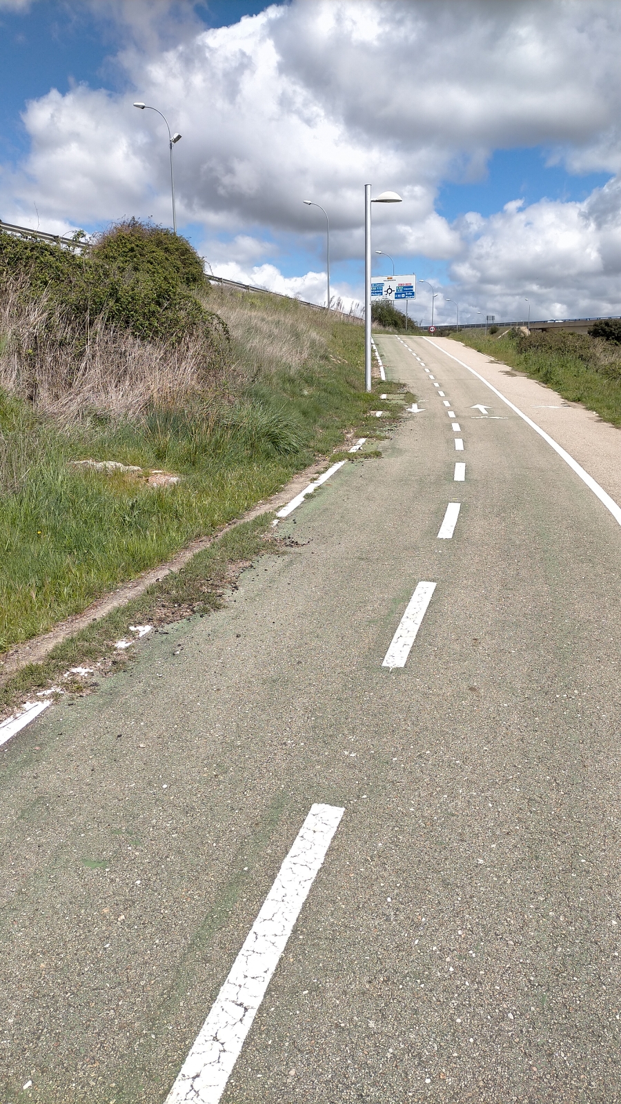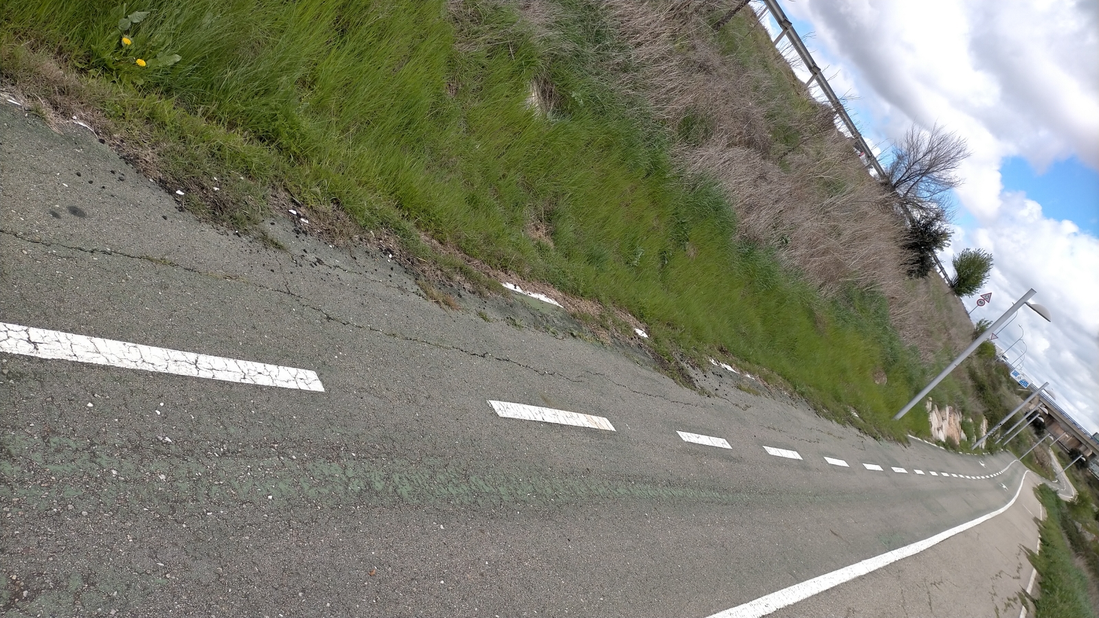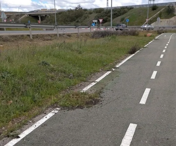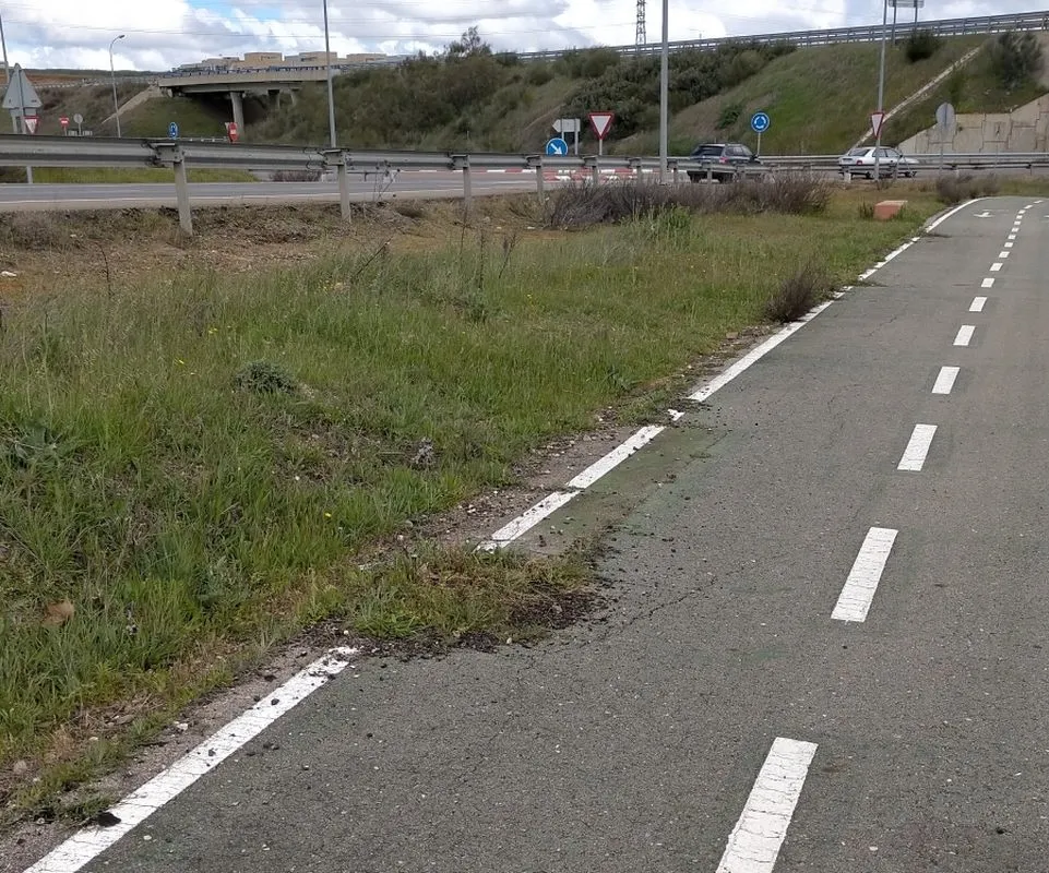 El carril, originalmente diseñado como una vía segura y delimitada por líneas blancas discontinuas sobre asfalto gris, muestra claros signos de falta de mantenimiento. La vegetación ha comenzado a ganar terreno sobre esta infraestructura ciclista, comprometiendo potencialmente la seguridad de quienes la utilizan para sus desplazamientos diarios o actividades recreativas.