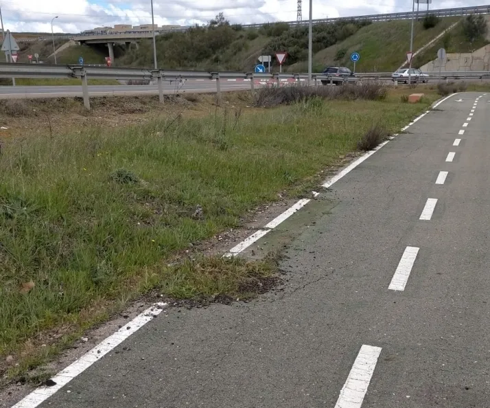 Las imágenes recibidas en nuestra redacción muestran el preocupante estado de deterioro que presenta un carril bici en Salamanca, concretamente el que une la ciudad charra con el municipio de Aldeatejada, en paralelo a la carretera de Vecinos, un poco antes de llegar a la urbanización Las Fuentes y pasando el nuevo Mercadona.