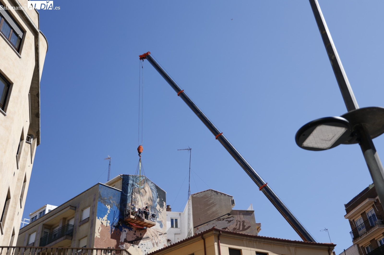 Como se puede apreciar en las imágenes y en el vídeo captado por David Sañudo, Sfhir trabaja sobre una plataforma que cuelga de una grúa, despertando la atención de vecinos y paseantes por la zona. Un mural de más de 100 metros cuadrados con dos paredes medianeras más el patio de la comunidad que se conforma entre ambas se denominará La Musa del Oeste.