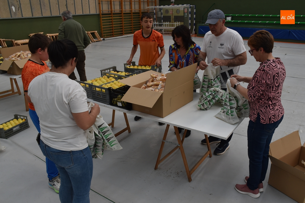 En estas bolsas se introdujeron una manzana y un croissant, quedando pendiente las dos bebidas habituales, una botella de agua y un Aquarius, que en la mañana del domingo se entregarán aparte, ya que producto de las ‘altas’ temperaturas que se esperan, estarán en una serie de neveras en el ágora mirobrigense, para así entregarlas frescas.