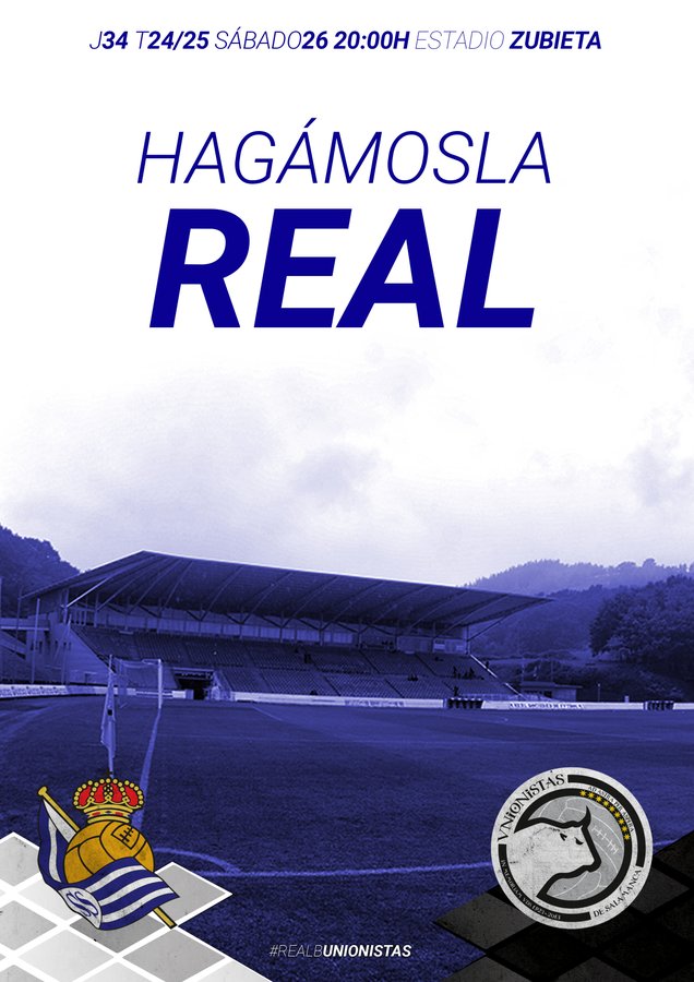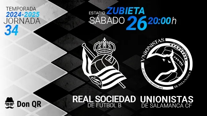 ¡Saludos y bienvenidos a la retransmisión en directo del Real B - Unionistas! Desde SALAMANCArtv AL DÍA te contamos todo lo que pase en el partido y así no te pierdes absolutamente nada gracias a nuestro minuto a minuto. El balón comenzará a rodar en Zubieta a partir de las 20:00 horas en la jornada 34 de Liga de Primera Federación.