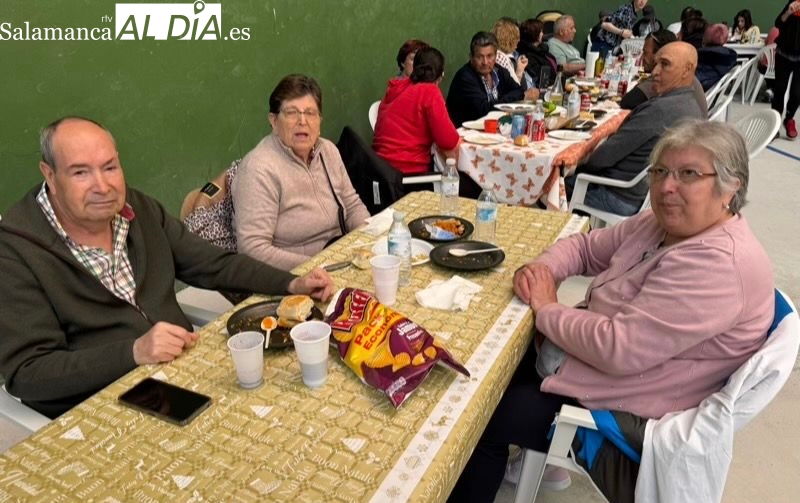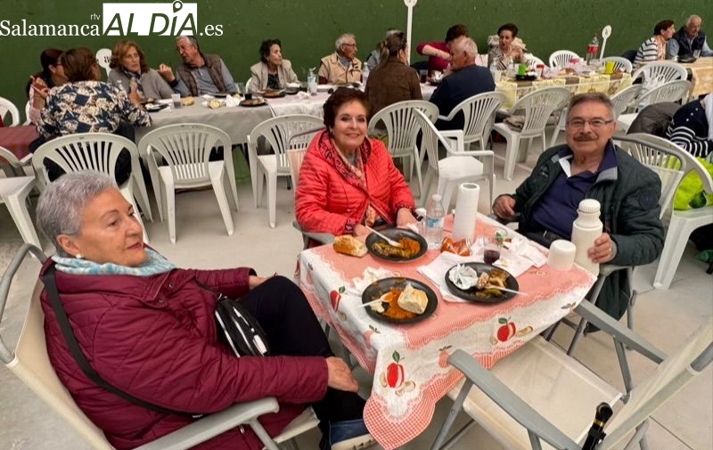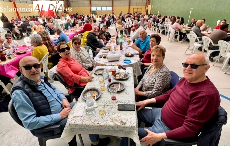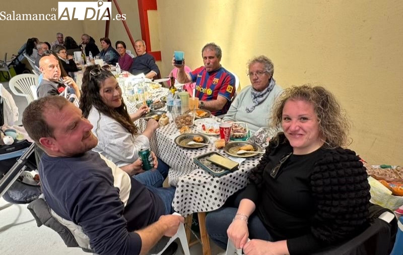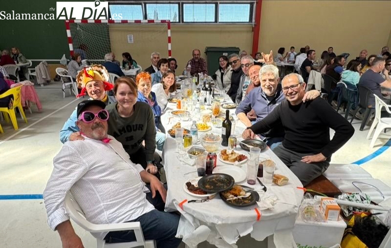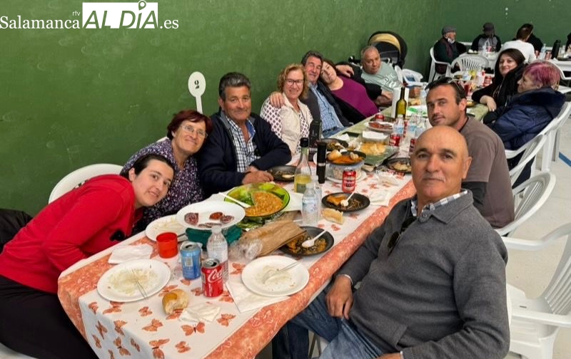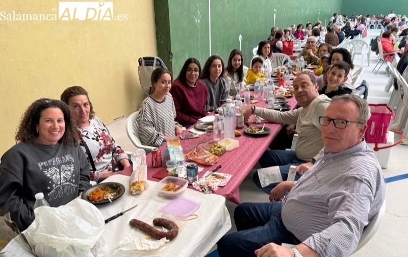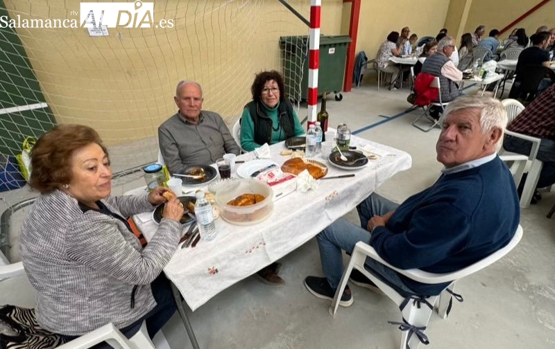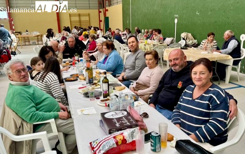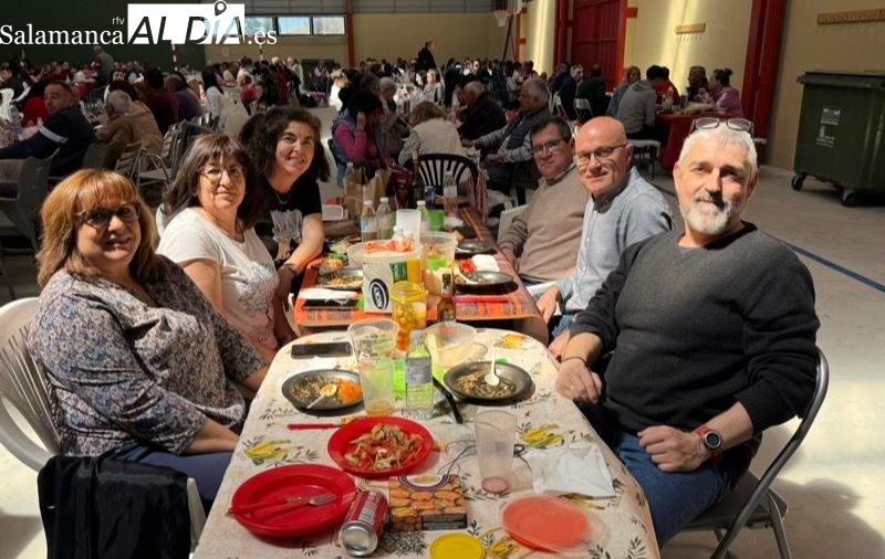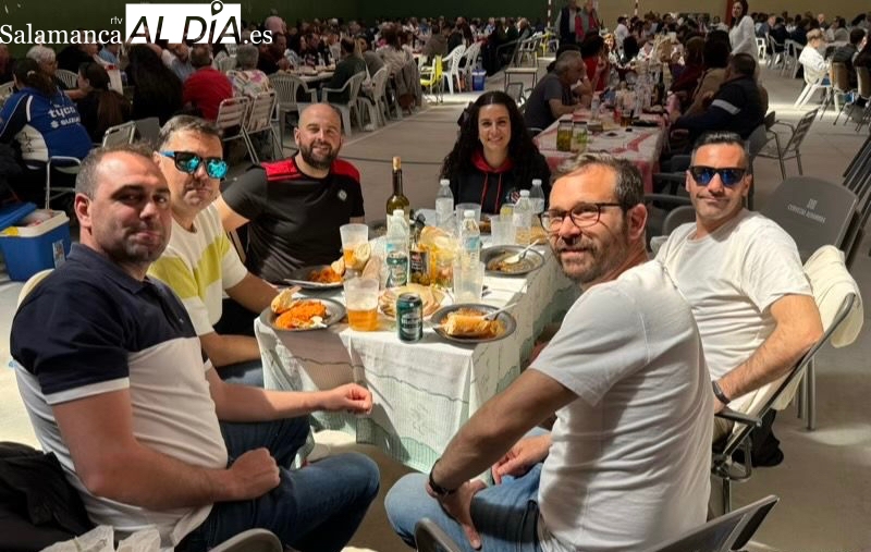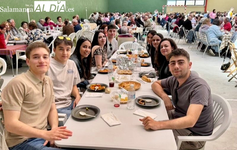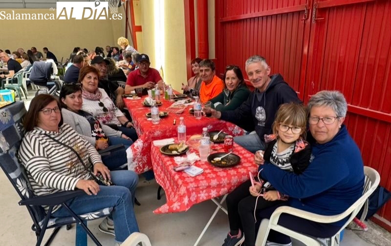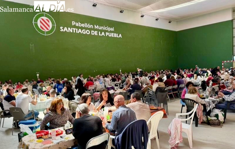 La respuesta de vecinos y amigos de numerosos municipios de la comarca a la gran Comida Popular Solidaria de las fiestas de San Jorge en Santiago de la Puebla se ha convertido en multitudinaria, con un pabellón municipal lleno hasta la bandera para disfrutar de un rico plato de patatas machaconas con sus torreznos, suculenta cita que se ha convertido en uno de los actos principales del programa festivo organizado desde el Ayuntamiento santiagues.