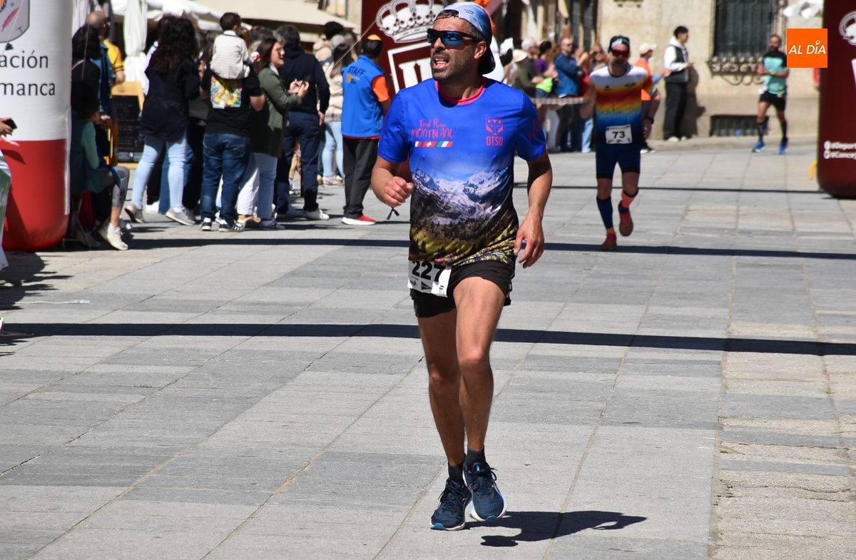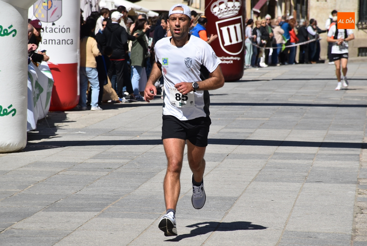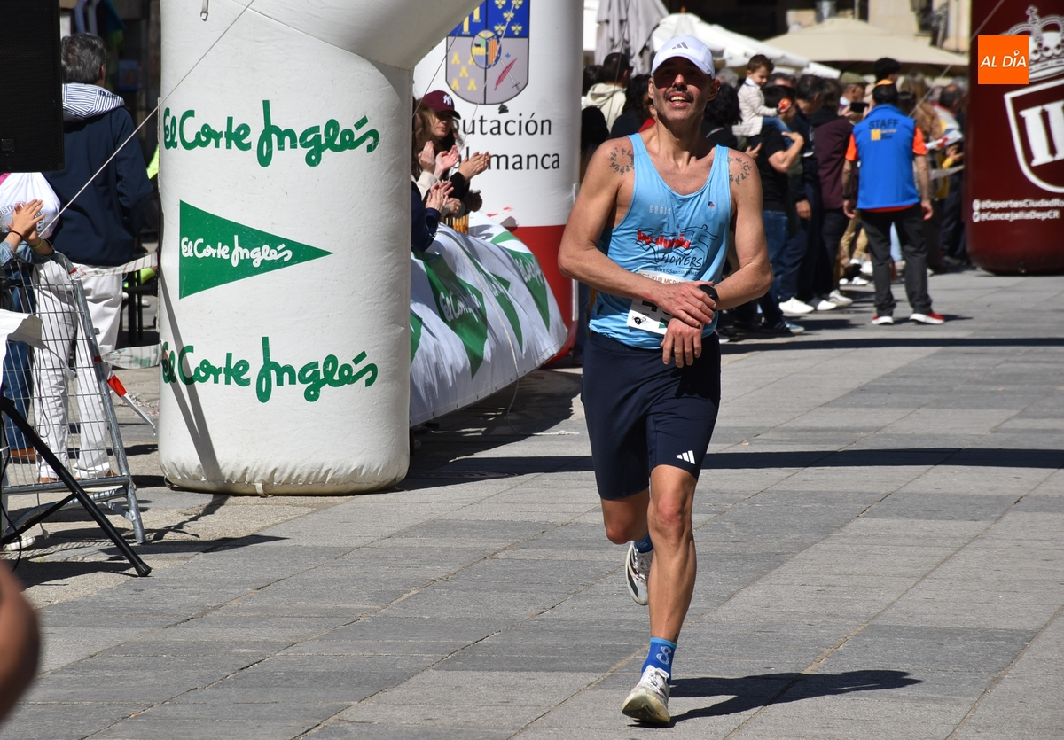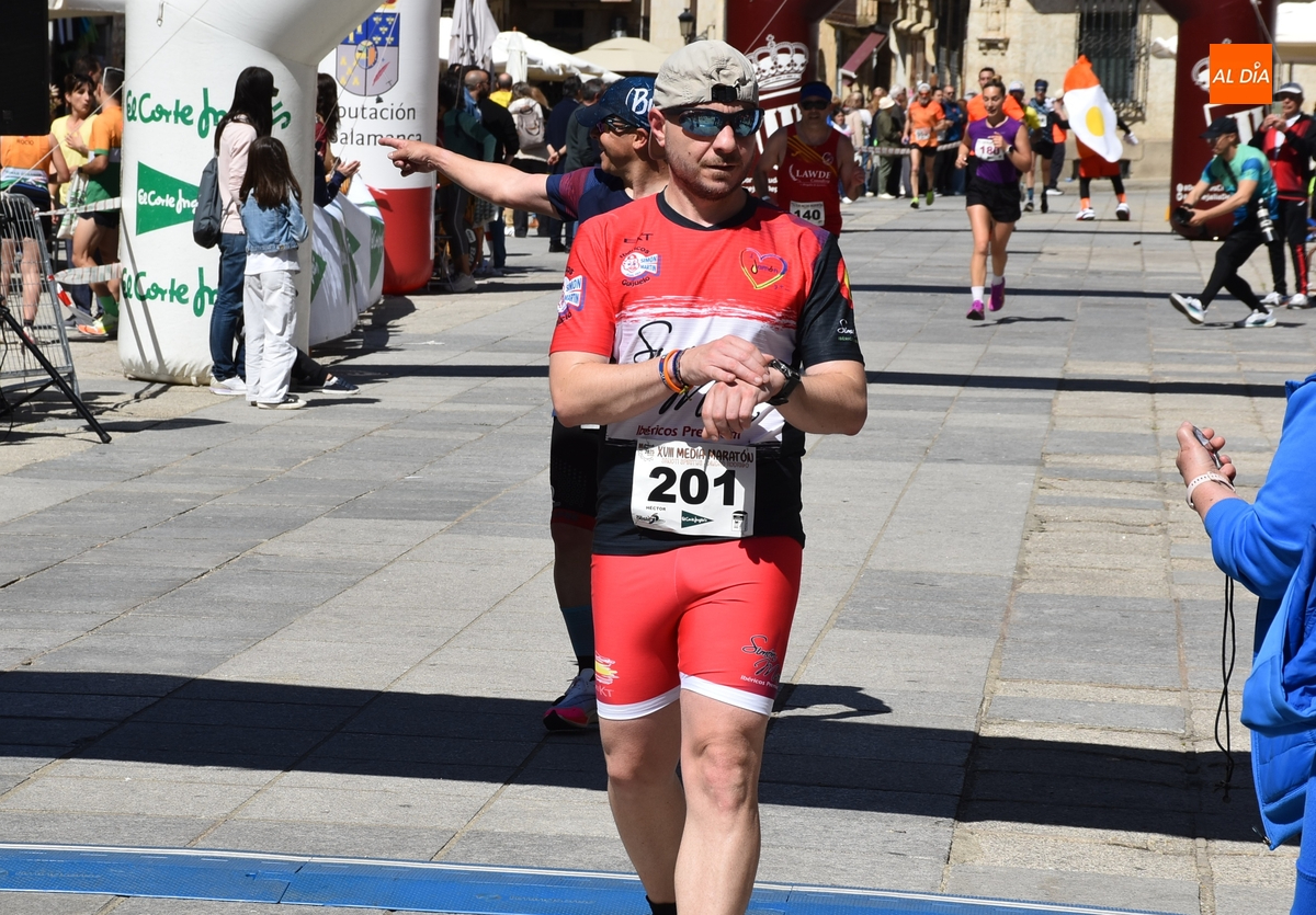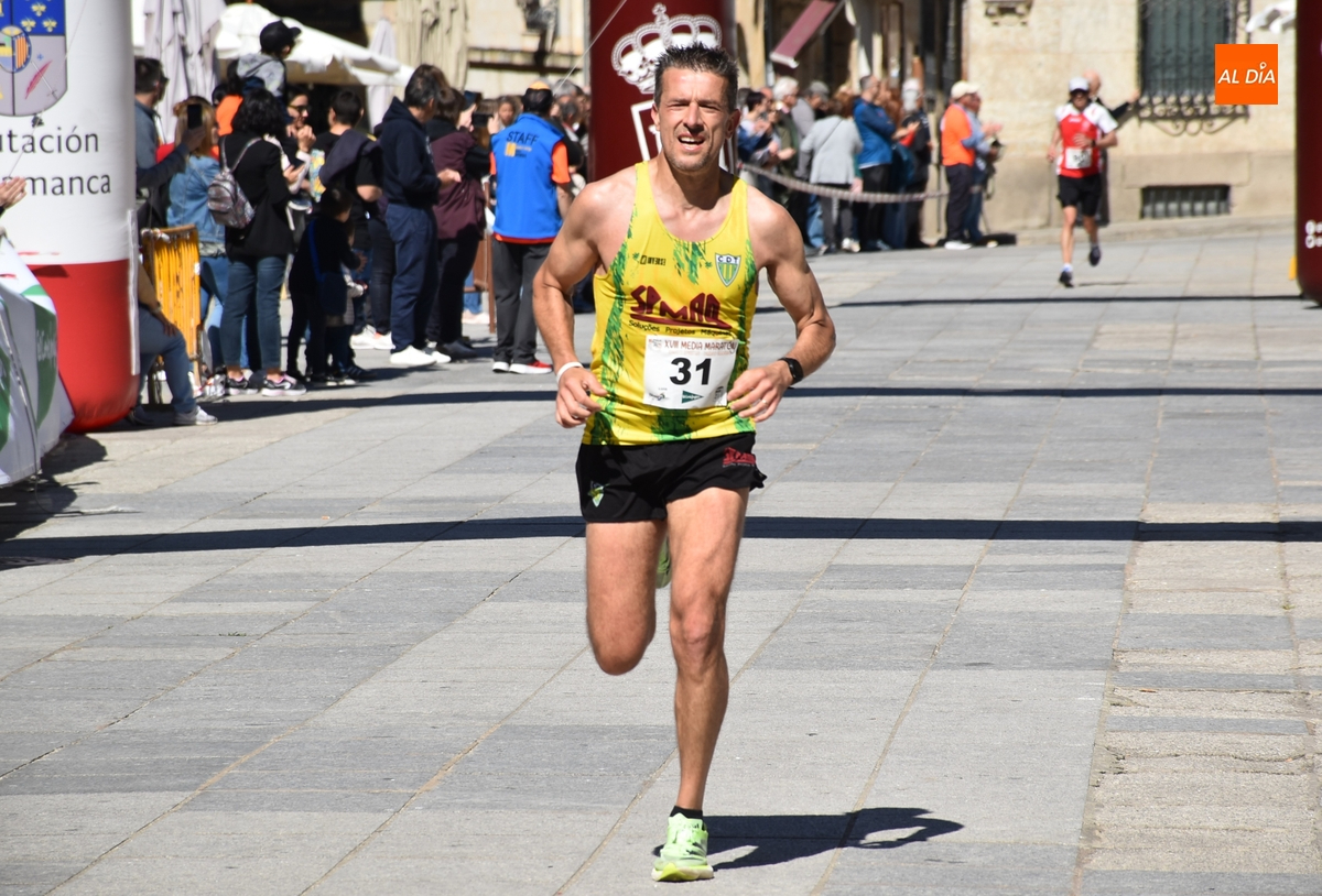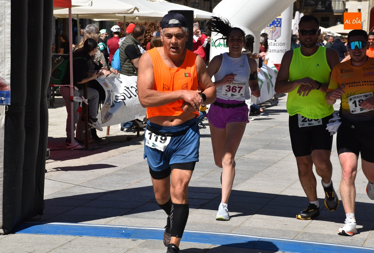 El cielo se unió a la fiesta atlética brindando una mañana de sol totalmente radiante, con una temperatura ‘alta’, aunque aliviada parcialmente por el viento que sopló, que incluso en un momento dado tumbó el arco de meta situado en la Plaza Mayor de Ciudad Rodrigo (en total hubo 4 arcos), donde hicieron su entrada los primeros atletas batiendo los récords históricos de la carrera.