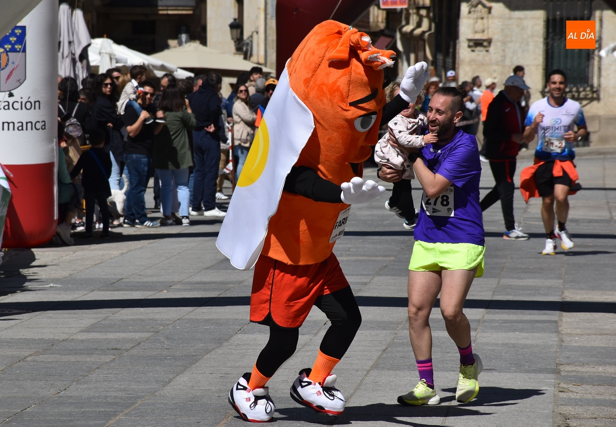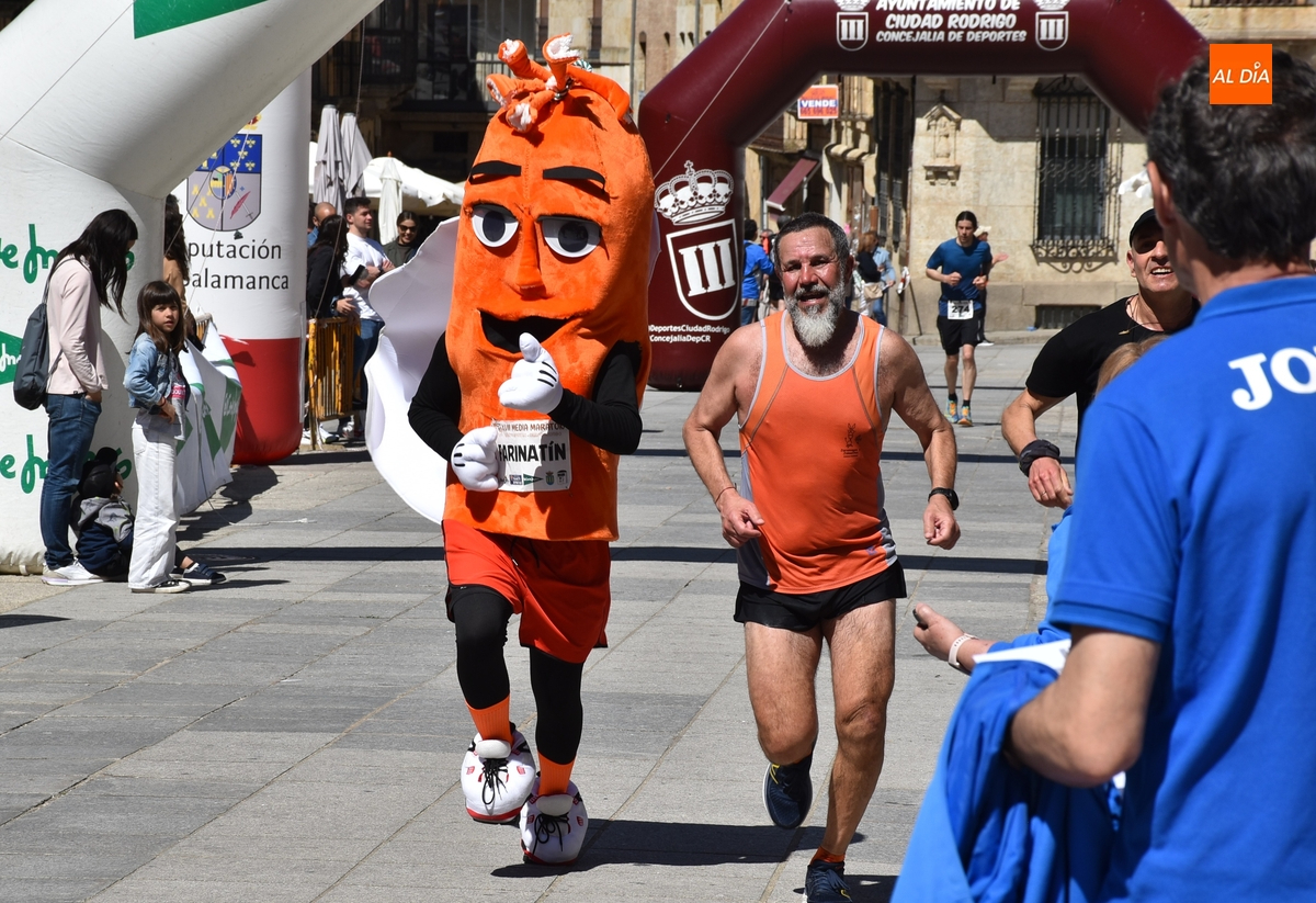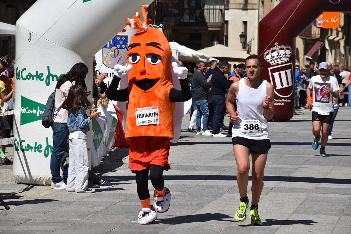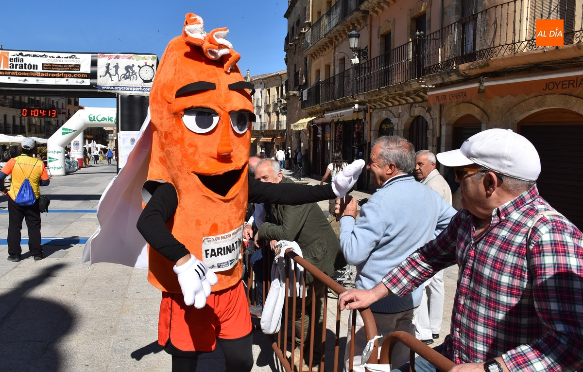 Quien también recorrió varias veces los últimos metros, junto a distintos corredores, fue la nueva mascota de la Media Maratón, Farinatín, que le dio animación a la llegada al igual que había hecho en la salida. Cerca de la meta, ya dentro del núcleo urbano de Ciudad Rodrigo, los participantes recibieron el apoyo musical de la Barahona Modern Band comandada por Sergio Caballer, que este año estuvo situada en la calle Laguna, oyéndose su música gracias a los altavoces a bastante distancia.