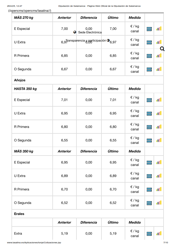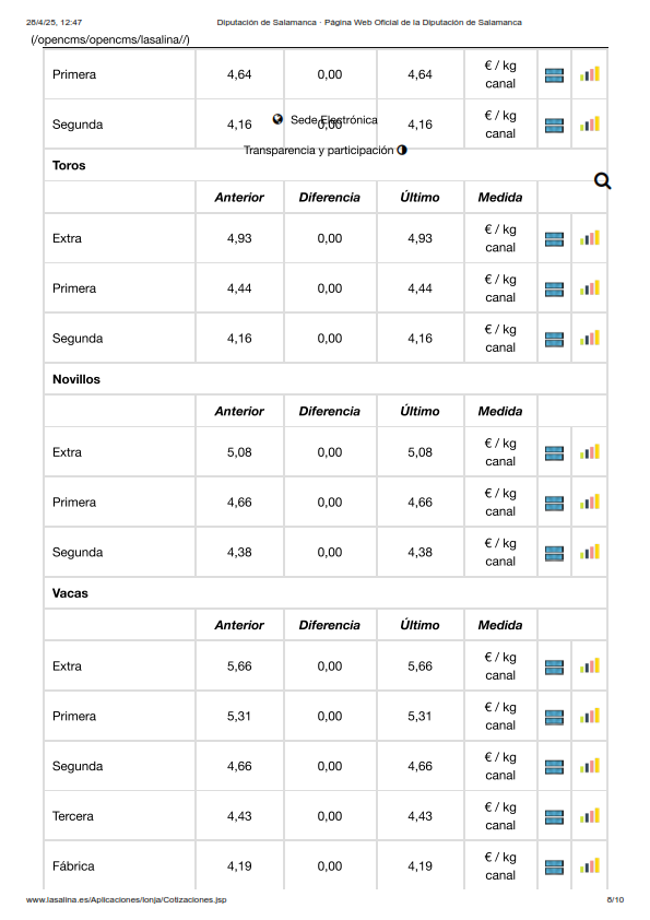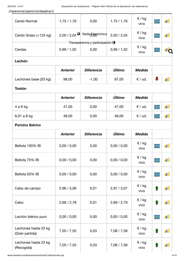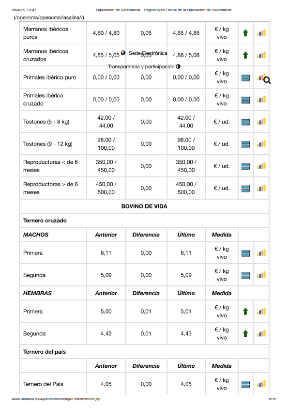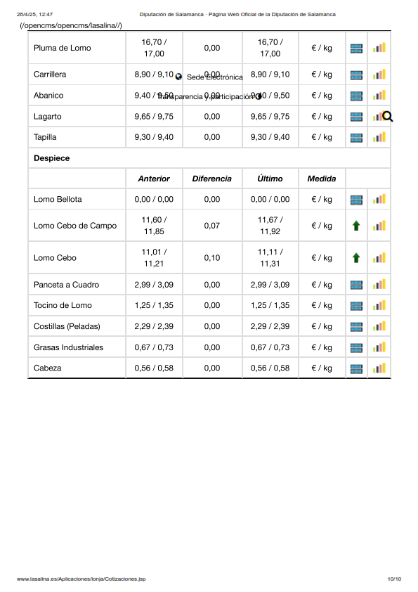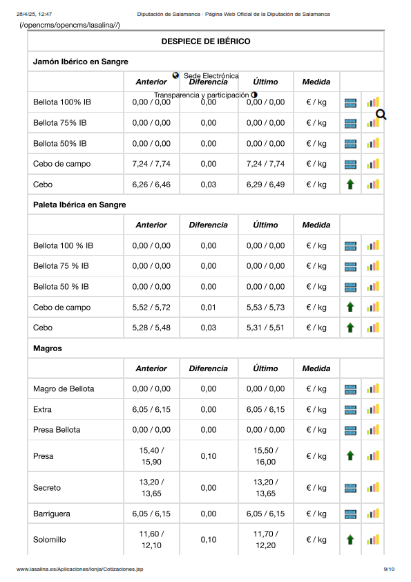 En la Mesa de Despiece de Ibérico jamones y paletas de Cebo en sangre sube 0,03 €/kg por 0,01 €/kg las paletas de Cebo de campo. Presa, solomillo y lomo de cebo suben 0,10 €/kg, y el lomo de cebo de campo 0,07 €/kg.