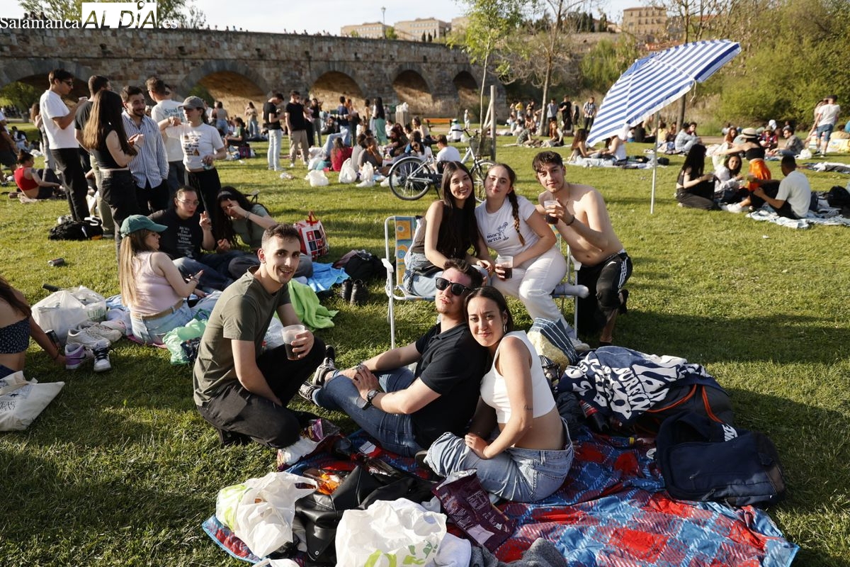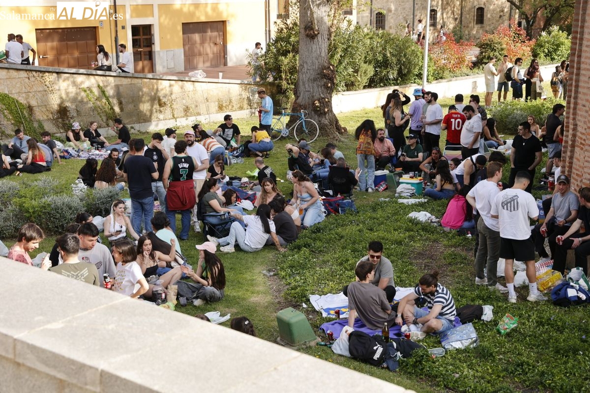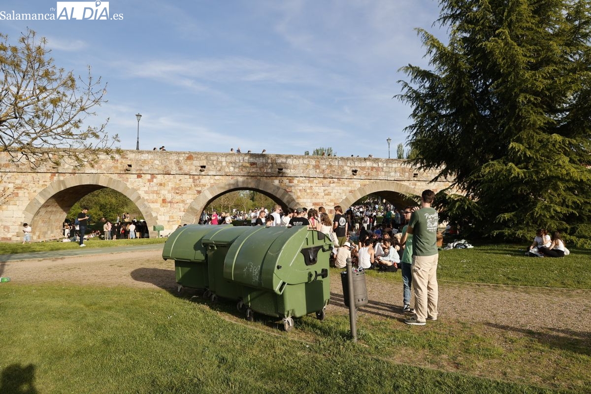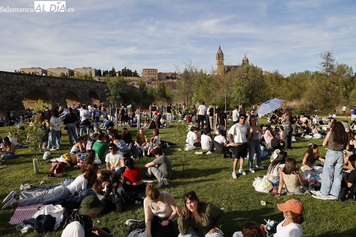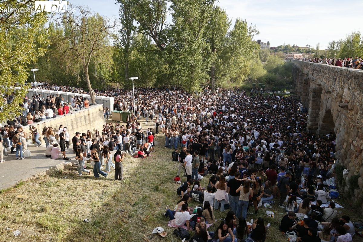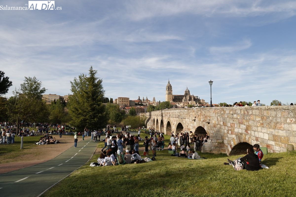 Los jóvenes, sobre todo universitarios, han vuelto a llenar el entorno del Puente Romano en este Lunes de Aguas, volviendo a ser, una vez más, la zona con más aglomeración de la capital y sus alrededores. Un gran botellón que les ha hecho olvidar una jornada atípica con el apagón masivo del suministro eléctrico y la imposibilidad de 'estar conectados' con sus amigos o en sus redes sociales durante varias horas.El parque Elio Antonio de Nebrija también ha registrado, como todas las zonas típicas de Salamanca, un buen ambiente.