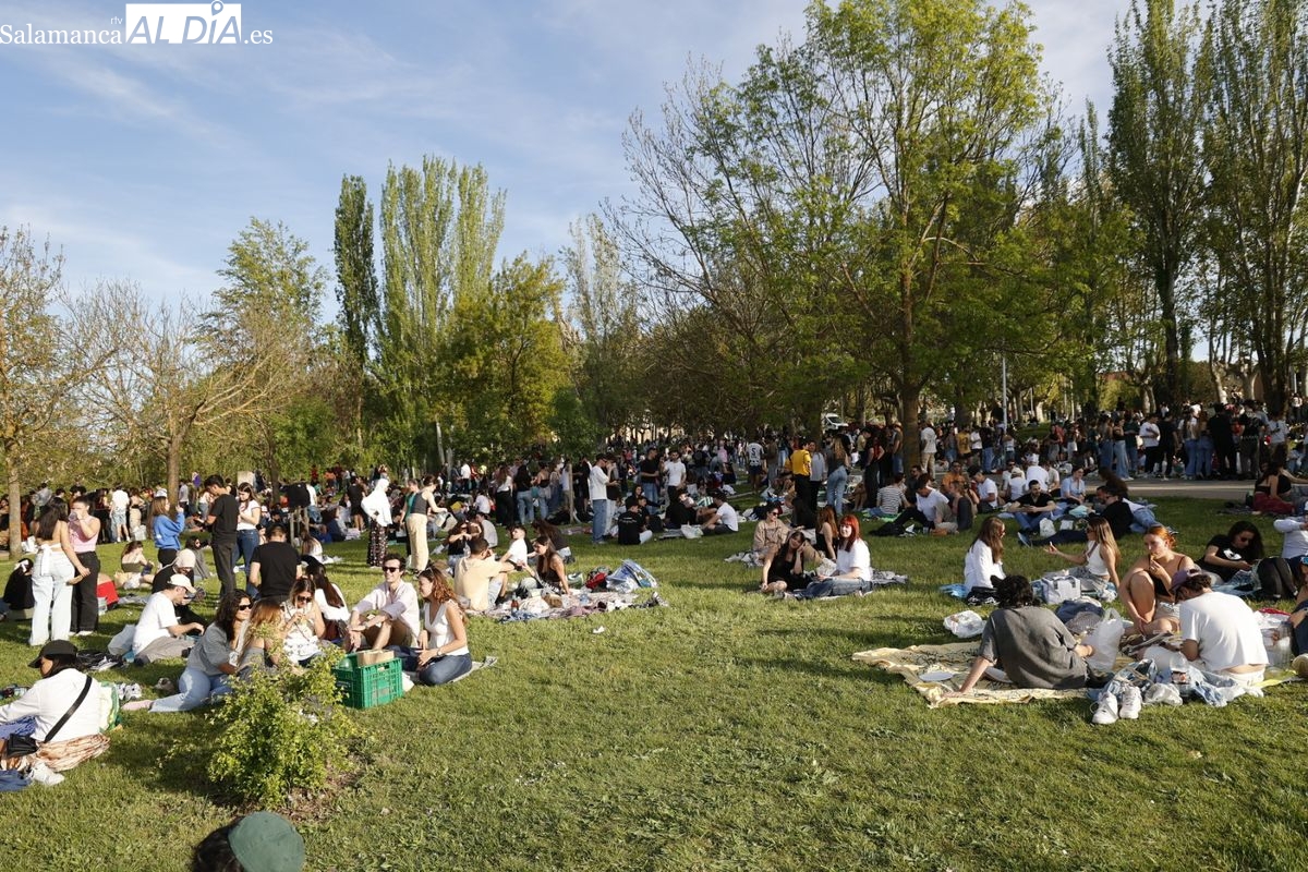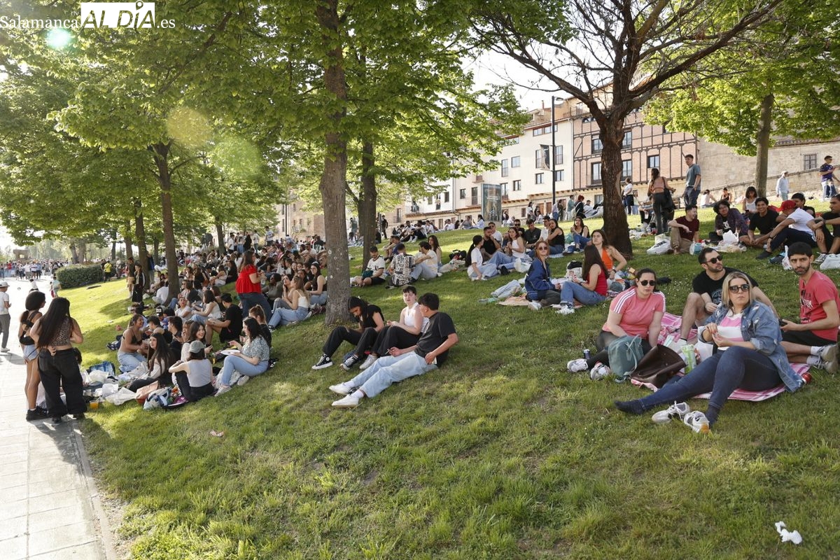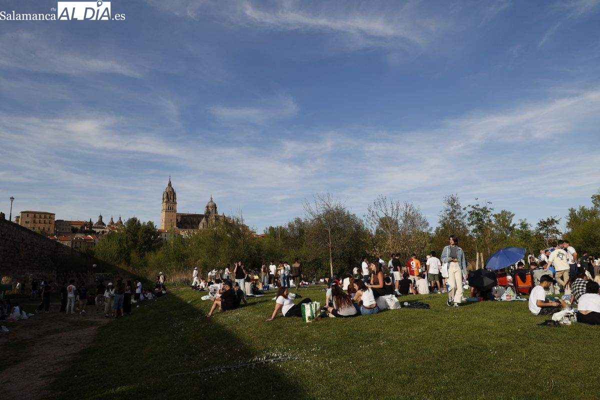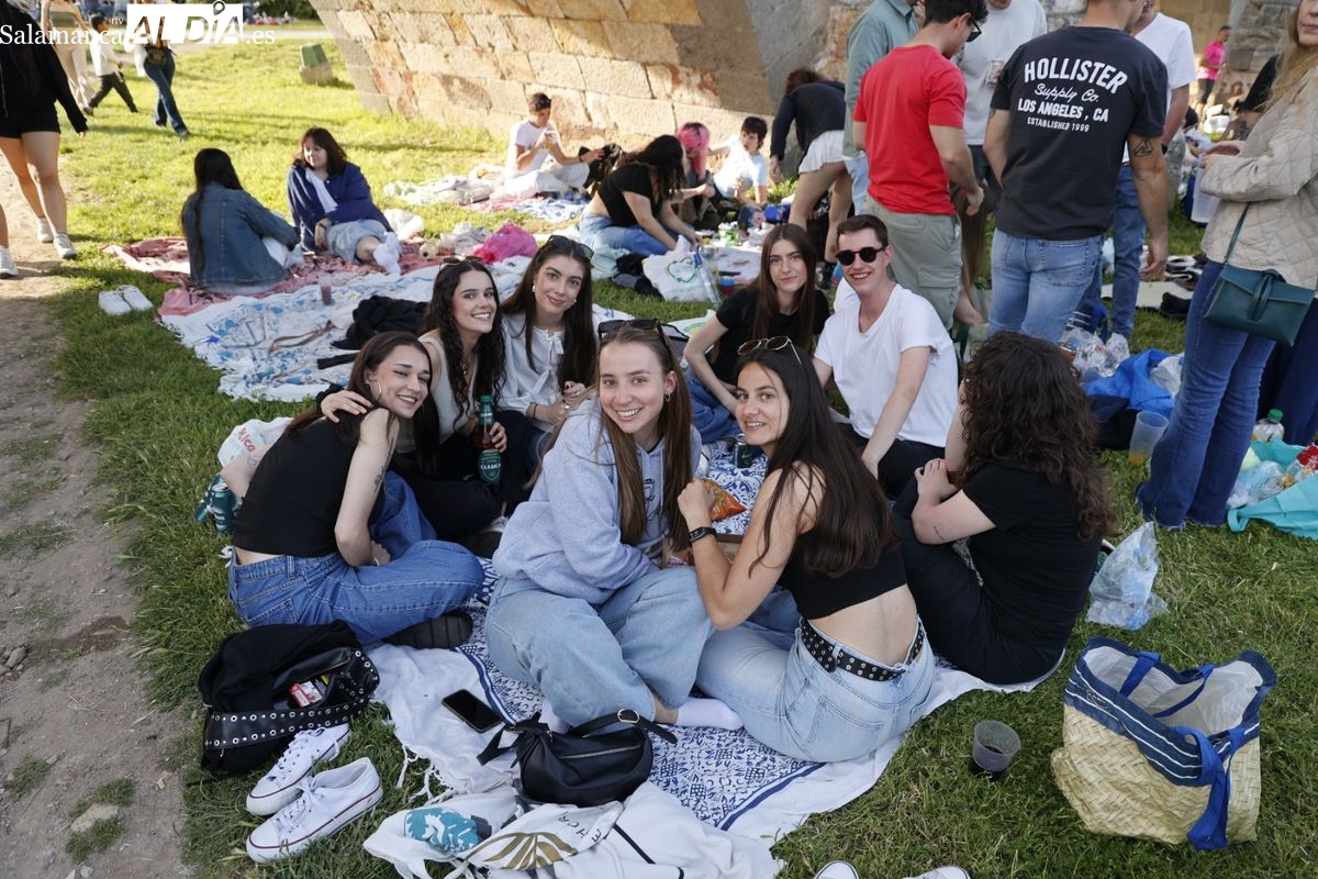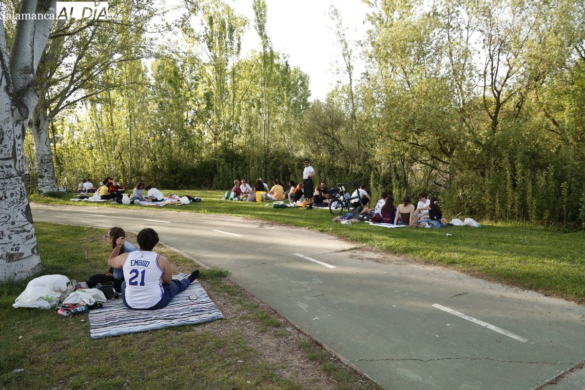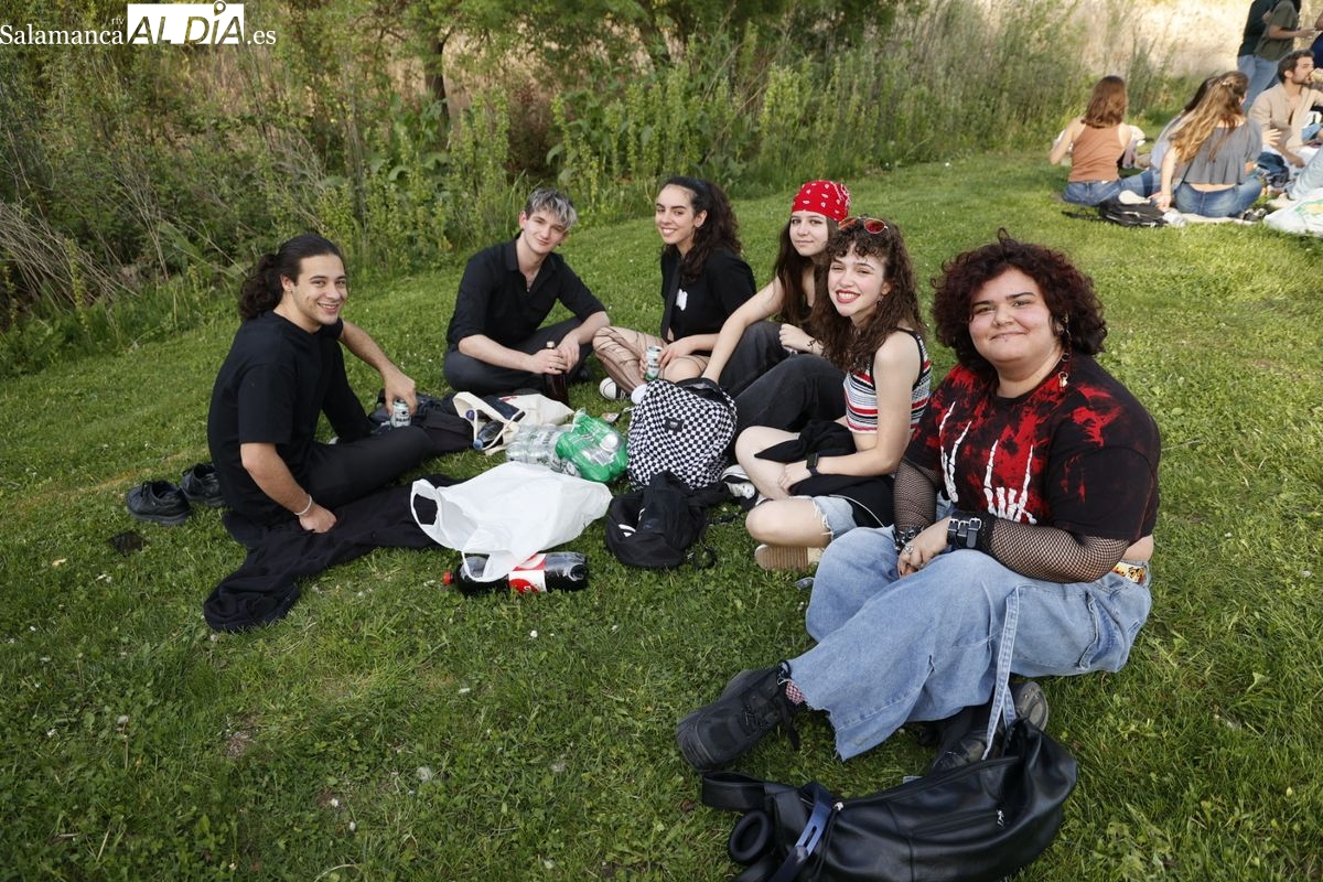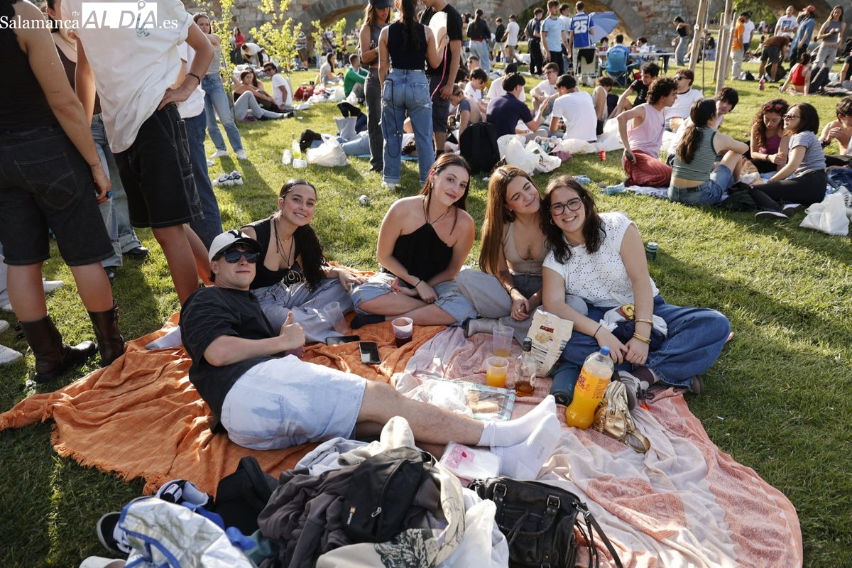 Los jóvenes, sobre todo universitarios, han vuelto a llenar el entorno del Puente Romano en este Lunes de Aguas, volviendo a ser, una vez más, la zona con más aglomeración de la capital y sus alrededores. Un gran botellón que les ha hecho olvidar una jornada atípica con el apagón masivo del suministro eléctrico y la imposibilidad de 'estar conectados' con sus amigos o en sus redes sociales durante varias horas.El parque Elio Antonio de Nebrija también ha registrado, como todas las zonas típicas de Salamanca, un buen ambiente.