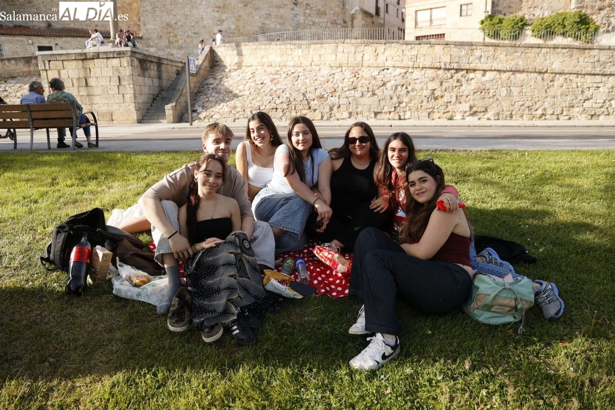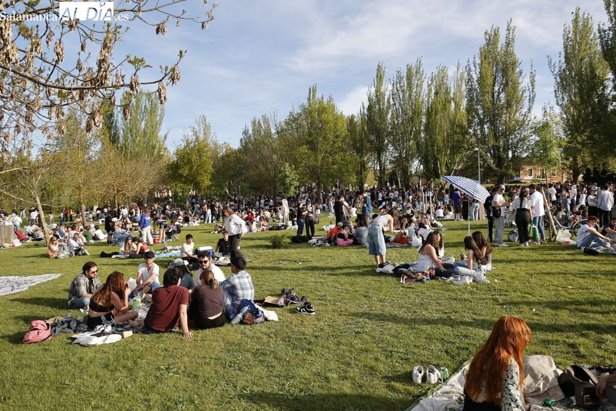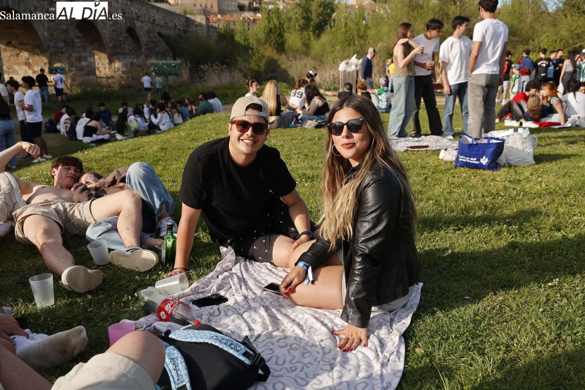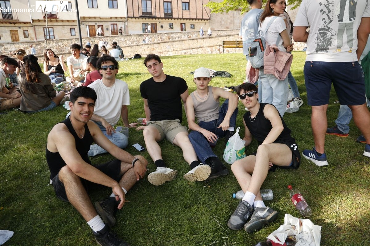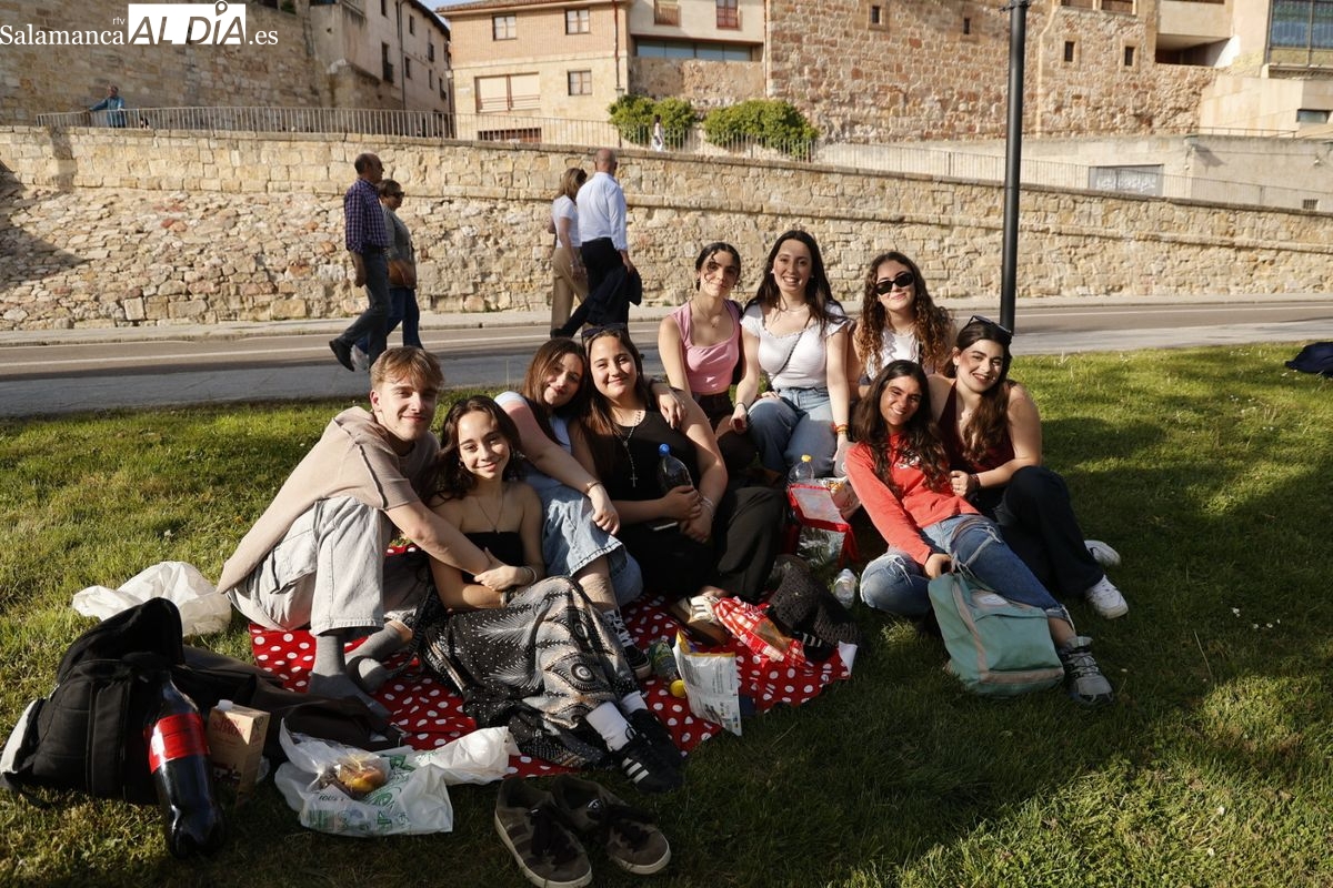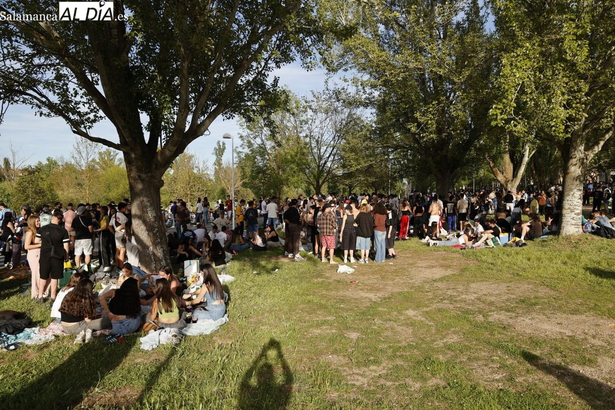 Los jóvenes, sobre todo universitarios, han vuelto a llenar el entorno del Puente Romano en este Lunes de Aguas, volviendo a ser, una vez más, la zona con más aglomeración de la capital y sus alrededores. Un gran botellón que les ha hecho olvidar una jornada atípica con el apagón masivo del suministro eléctrico y la imposibilidad de 'estar conectados' con sus amigos o en sus redes sociales durante varias horas.El parque Elio Antonio de Nebrija también ha registrado, como todas las zonas típicas de Salamanca, un buen ambiente.