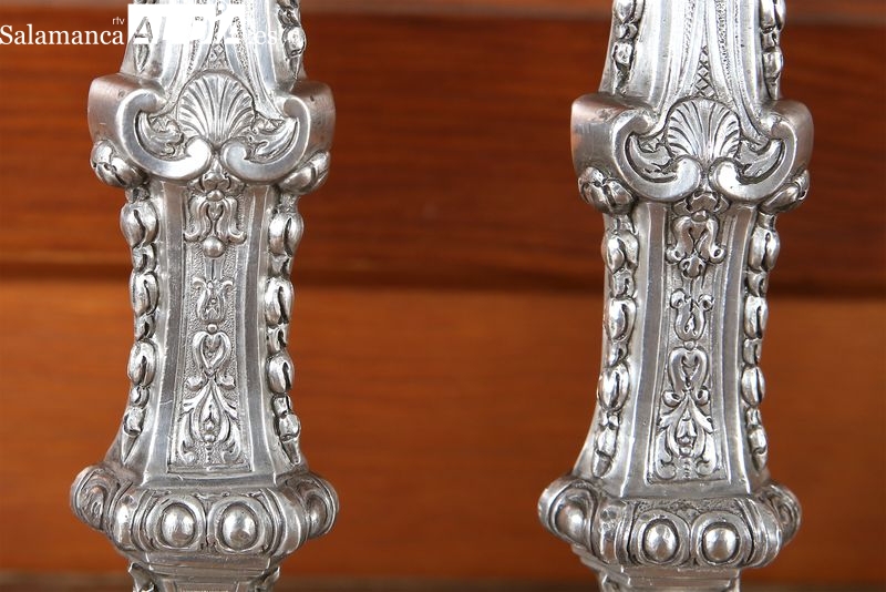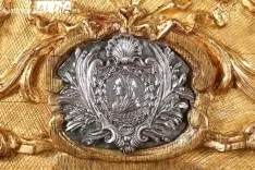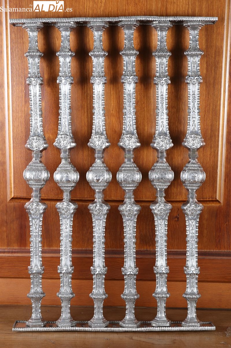 La reja que protege el relicario del corazón de Santa Teresa es una pieza de plata de extraordinaria riqueza ornamental. Compuesta por nueve barrotes verticales de sección hexagonal, está decorada con motivos florales, roleos, elementos vegetales y pequeñas cabezas de angelitos. Los balaustres, con medallones que representan símbolos marianos, teresianos y sanjuanistas, aportan un ritmo visual dinámico. Destaca la escena repujada de la transverberación del corazón de la Santa, acompañada por el ángel, el busto de San Juan de la Cruz y la Virgen del Carmen. Esta reja no solo protege, sino que eleva espiritualmente el relicario, reflejando la tradición barroca de exaltar lo sagrado mediante la nobleza de los materiales y la ornamentación.
