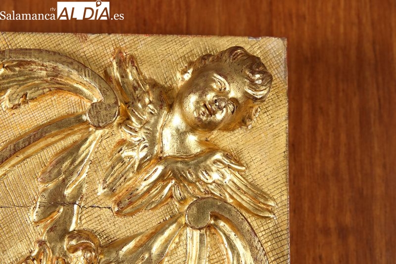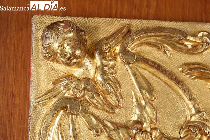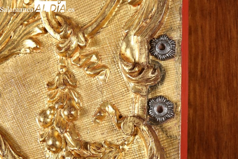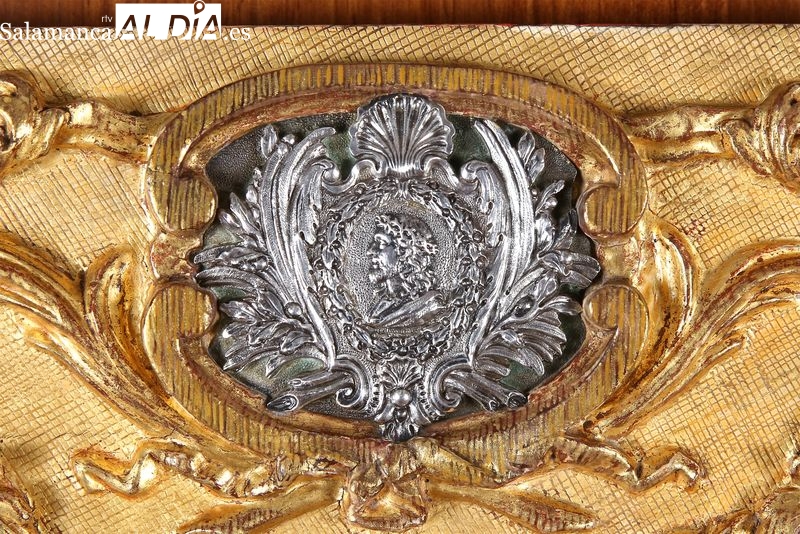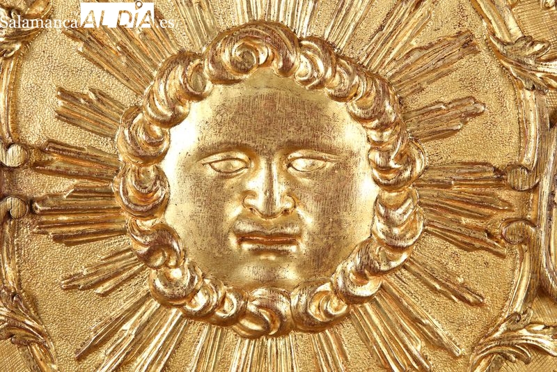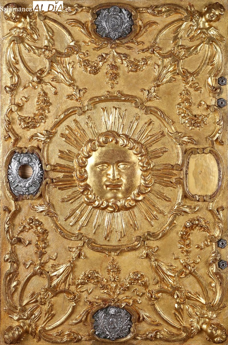 La puerta que cierra la hornacina del corazón de Santa Teresa es una obra de arte en sí misma. Ornamentada con guirnaldas florales simétricas, cuatro cabezas aladas de ángeles en sus extremos y pan de oro de primera calidad, esta pieza combina plata repujada con efigies de Jesucristo y la Virgen María. En su centro, un relieve del sol resplandeciente simboliza al Padre Universal y a Jesucristo, la luz del mundo. Este motivo evoca la inmortalidad y la vida espiritual eterna del corazón de la Santa, que brilla como un faro de fe.