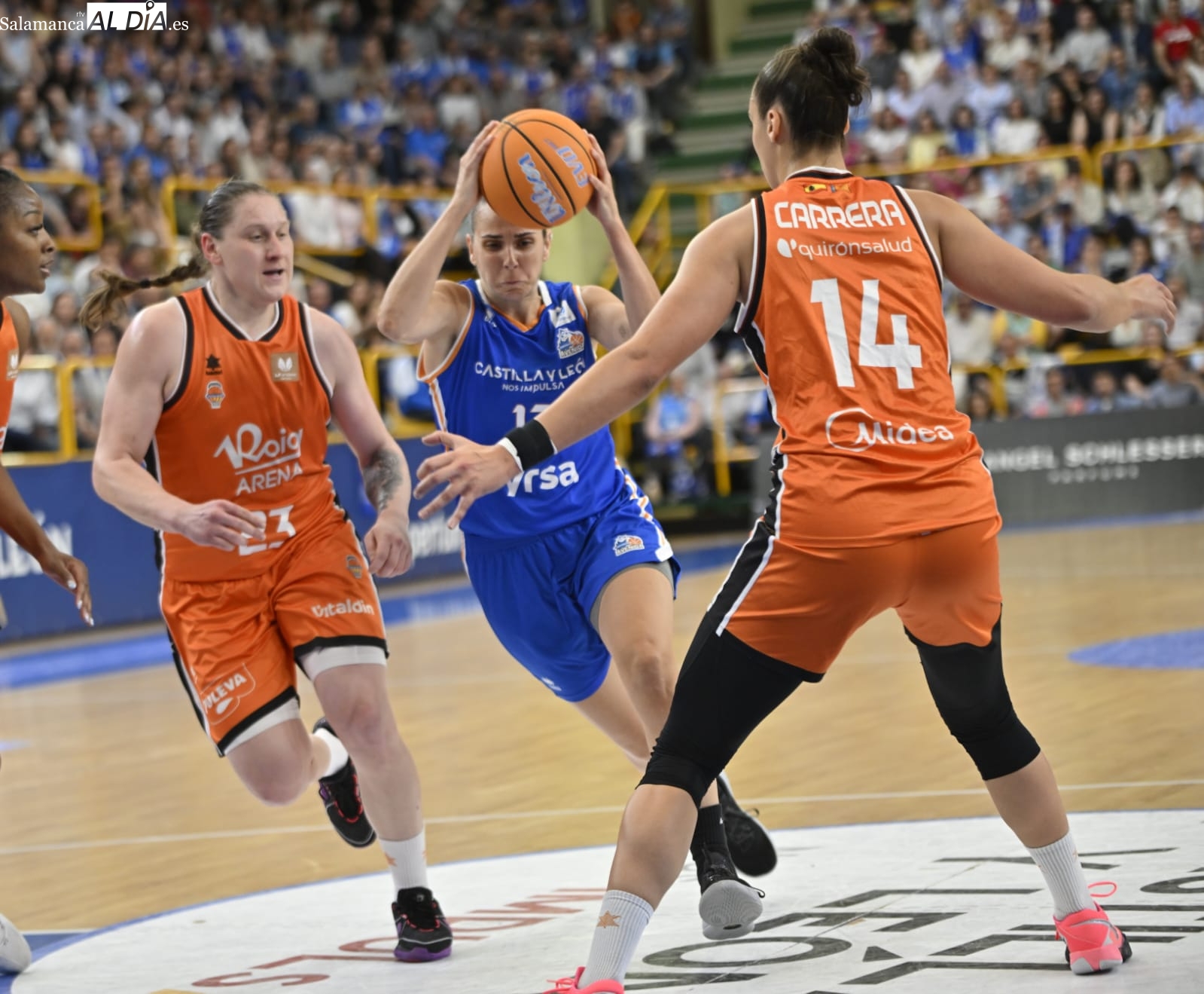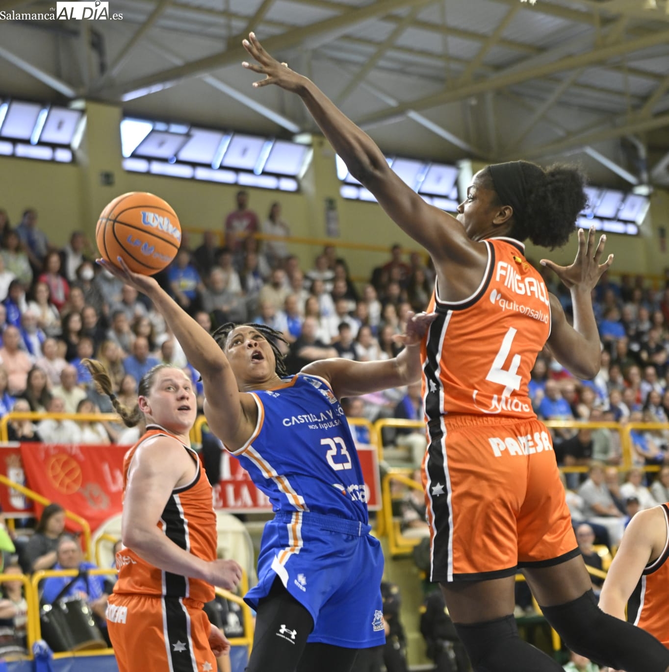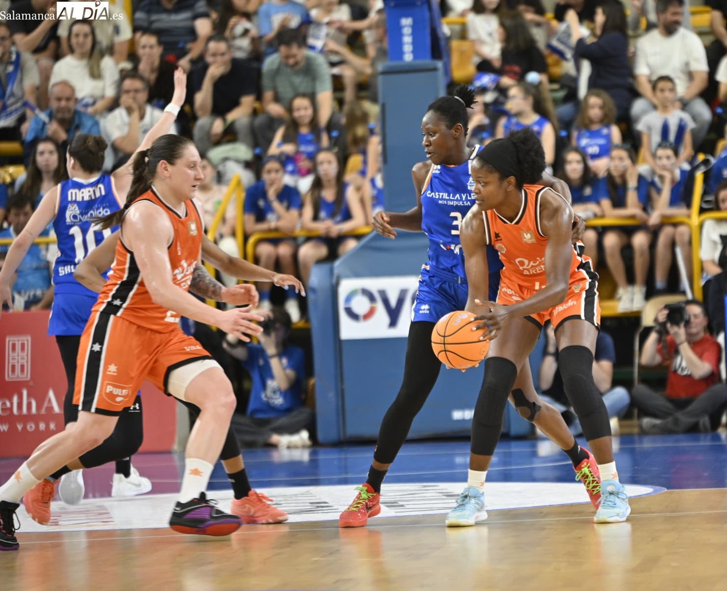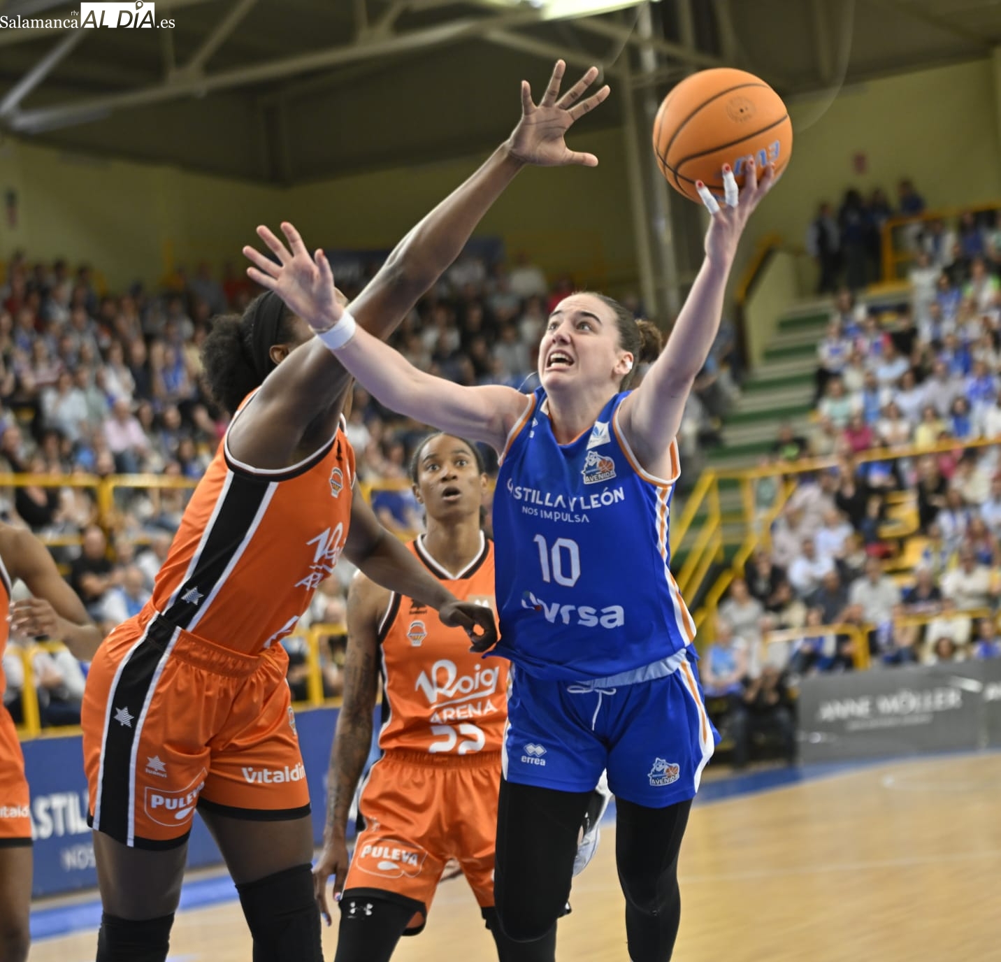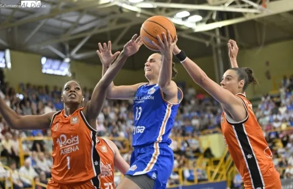 Con el paso por los vestuarios, Carter ha encestado un T3, Silvia ha hecho lo mismo e Iyana ha seguido sus pasos para firmar el 48-43 y forzar el tiempo muerto de Rubén Burgos. La cosa ha seguido igualada con las salmantinas por delante y el árbitro ha tenido unas palabras con Montañana por sus protestas por una jugada mal señalada. Por su parte, Iagupova, casi inédita, ha anotado desde el exterior y Carter le ha replicado del mismo modo al otro lado de la cancha. Además, Vilaró -ha cumplido 300 encuentros en el club- ha tirado de buena mano para el 64-55 y las azulonas han cogido una renta importantísima de cara a los últimos minutos frente a un Valencia Basket al que no le han señalado ni una sola falta en todo el 3ºC.