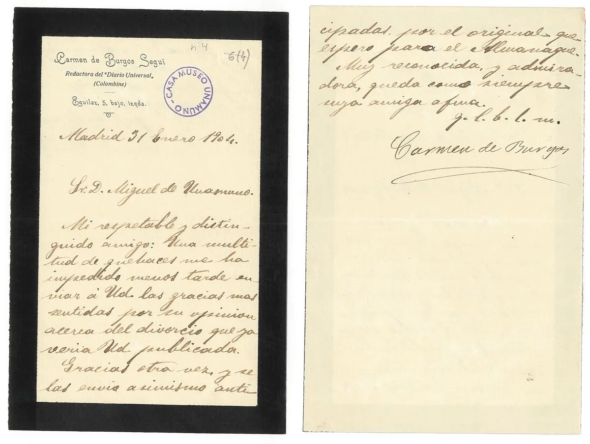 El próximo martes 6 de mayo, el Centro Cultural Fundos Fórum Salamanca acogerá la proyección del documental 'Bajo pluma de mujer', un trabajo audiovisual que rescata del olvido la correspondencia que mantuvieron con Miguel de Unamuno figuras femeninas tan relevantes como Emilia Pardo Bazán, Clara Campoamor o Margarita Xirgu. La cita, que comenzará a las 19:00 horas, incluirá un coloquio posterior dirigido por Ana Chaguaceda, directora de la Casa-Museo Unamuno, y Maribel R. Fidalgo, profesora de la Universidad de Salamanca e investigadora del proyecto.