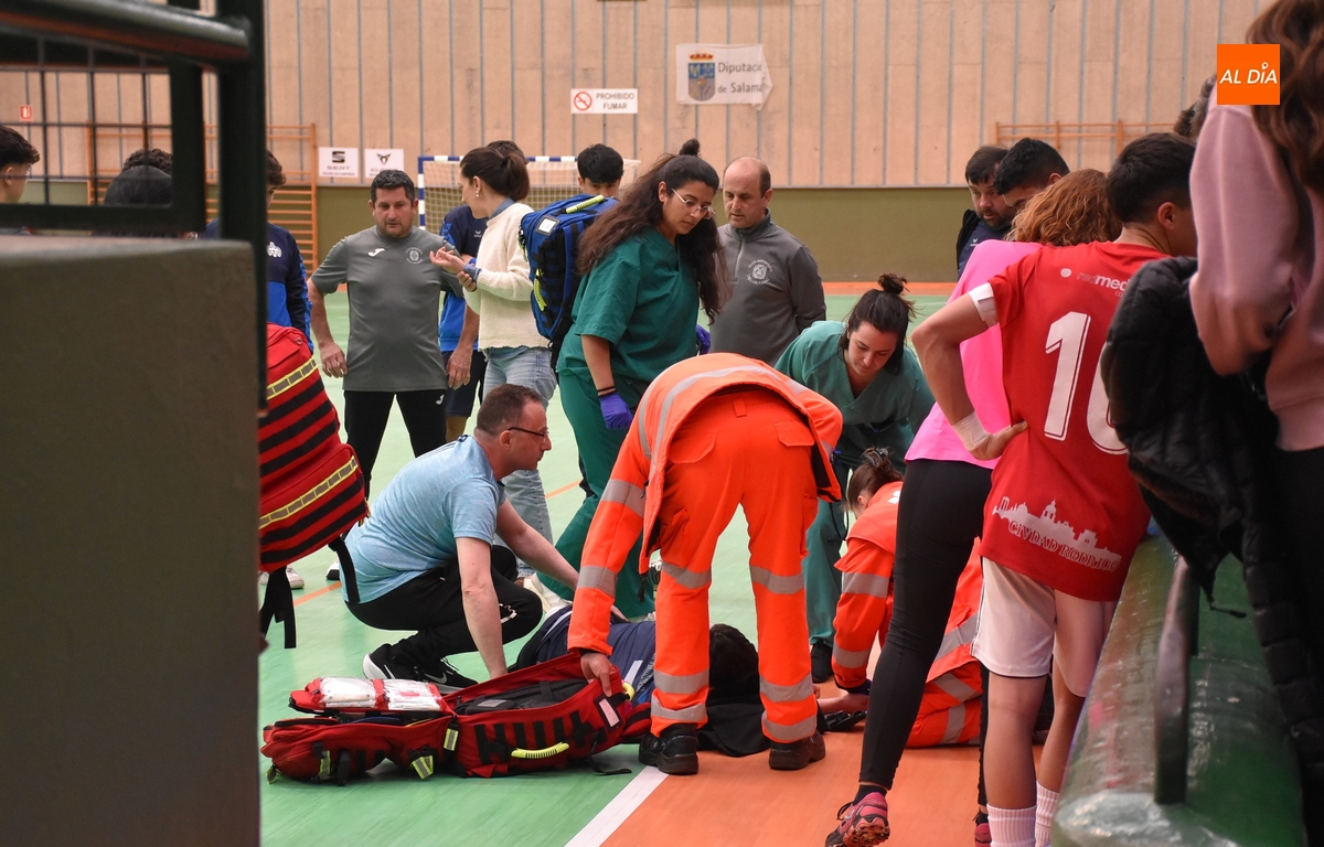 El crono iba avanzando a favor del III Columnas hasta que a 1’53” para el final llegó el susto: uno de los jugadores gallegos, Xian, tras una carrera por la banda, cayó hacia el suelo quejándose del pecho en la zona del corazón y con falta de aire, viéndose enseguida que era un problema de gravedad. Varios espectadores mirobrigenses que estaban en la grada se acercaron a prestarle ayuda (le recostaron de lado, le taparon y sobre todo estuvieron hablando con él intentando calmarle, ya que se le notaba bastante nervioso) mientras se llamaba al 112.