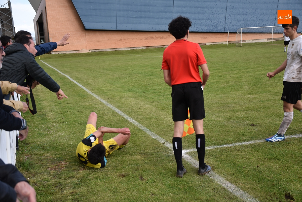 El partido cambió de rumbo en el 76’, con dos focos de acción. A la altura del medio campo, por la banda izquierda, una pugna por el balón entre José Manuel y Collado acabó con ambos por el suelo, con la mala suerte de que Collado sufrió –lo que parece- una luxación en el codo izquierdo, que hizo que no pudiese continuar jugando (tras ser atendido fue llevado hasta el Centro de Salud), cuando el Mojados ya había hecho todos sus cambios, de ahí que hasta el final jugase con 10.