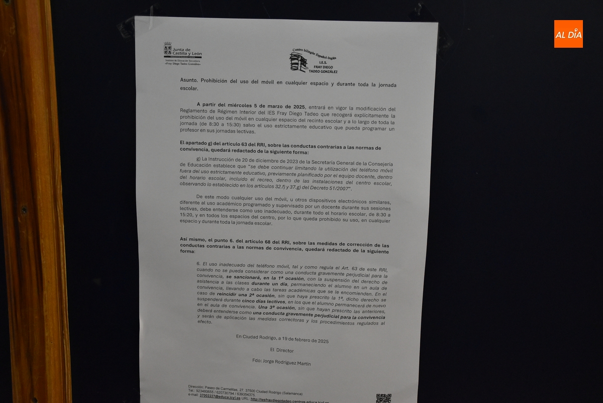 Este lunes 5 de mayo se cumplen dos meses exactos de la jornada en que entró en vigor (el Miércoles de Ceniza) la prohibición dictada en el IES Fray Diego Tadeo de Ciudad Rodrigo de usar los móviles –y cualquier otro dispositivo electrónico similar- en todos los espacios del centro en el transcurso de la jornada lectiva, es decir, de 8.30 a 15.20, recreos incluidos.