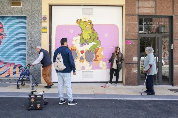 David Ortiz Nieto se alza con el premio con su instantánea del mural ganador, 'Mente Croante', en el que se ve a la autora, Silvia Lopez González, y a varios vecinos