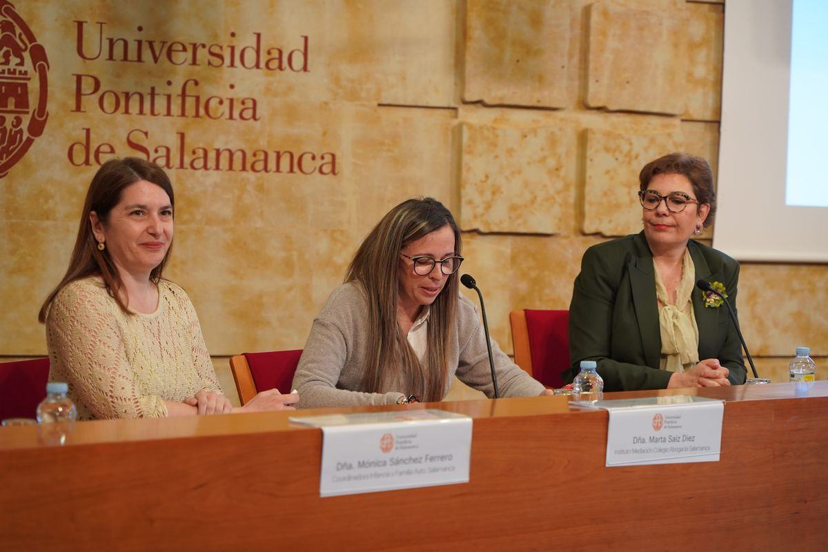 Posteriormente, se desarrolló una mesa redonda titulada 'Organización del sistema de protección a la infancia: servicios y medidas de protección'. En ella participaron la gerente territorial de Servicios Sociales de la Junta de Castilla y León, María Isabel Fernández, y la coordinadora de la sección Infancia y Familia del área de Bienestar Social del Ayuntamiento de Salamanca, Mónica Sánchez. La moderación corrió a cargo de la directora del Instituto de Mediación del Colegio de la Abogacía de Salamanca, Marta Saiz.